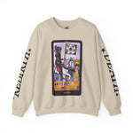 Featuring the major arcana Death card from our incredibly popular The Pulp Girls Tarot Deck, this crewneck sweatshirt is sure to turn heads! One of the most feared (and misunderstood) cards in the deck, Death isn't automatically a portent of doom. Think of it more as a card of change. See the city with the sun rising over it on the horizon? Even when one thing ends, something new begins. This card is all about cycles, rebirths, and transitions, all of which are actually essential for thriving. One sleeve reads DEATH, while the other reads REBIRTH, a reminder that there are two sides to each coin.