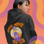 Show off your horror movie lover pride in this sweatshirt! Each sweatshirt features a knife wielding hand against a full moon with text on the front upper chest area, and a full-sized version of a classic horror movie scene along with text on the back!