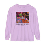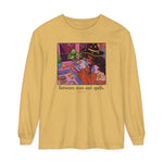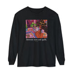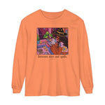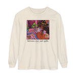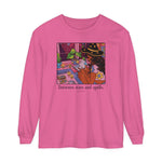 Long-sleeved tee featuring a witch besties reading in a cozy cottage. Perfect for those who love witchy aesthetics and want to embrace their inner magic. Ideal for Halloween, witchcraft enthusiasts, and anyone looking to add a touch of the supernatural to their wardrobe.