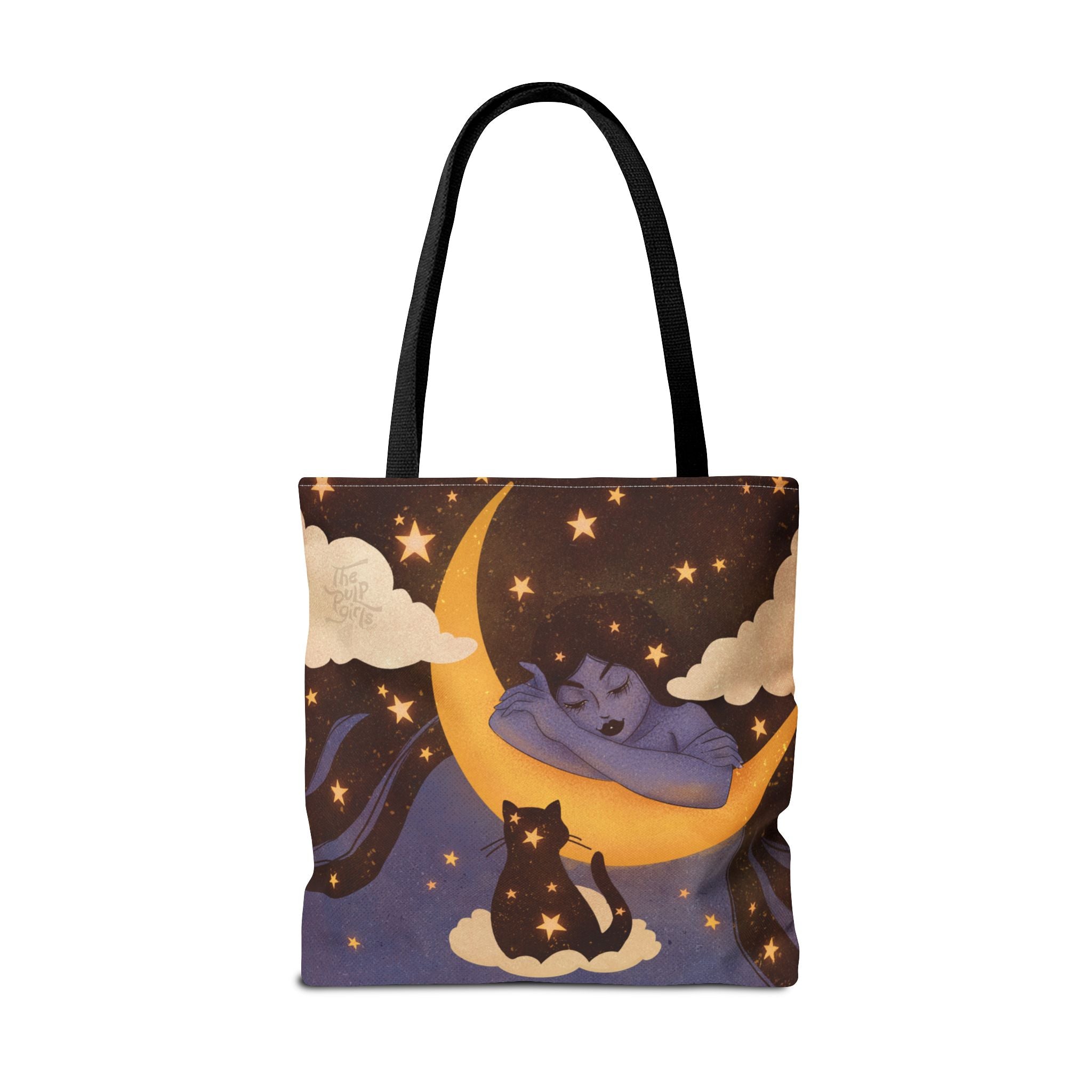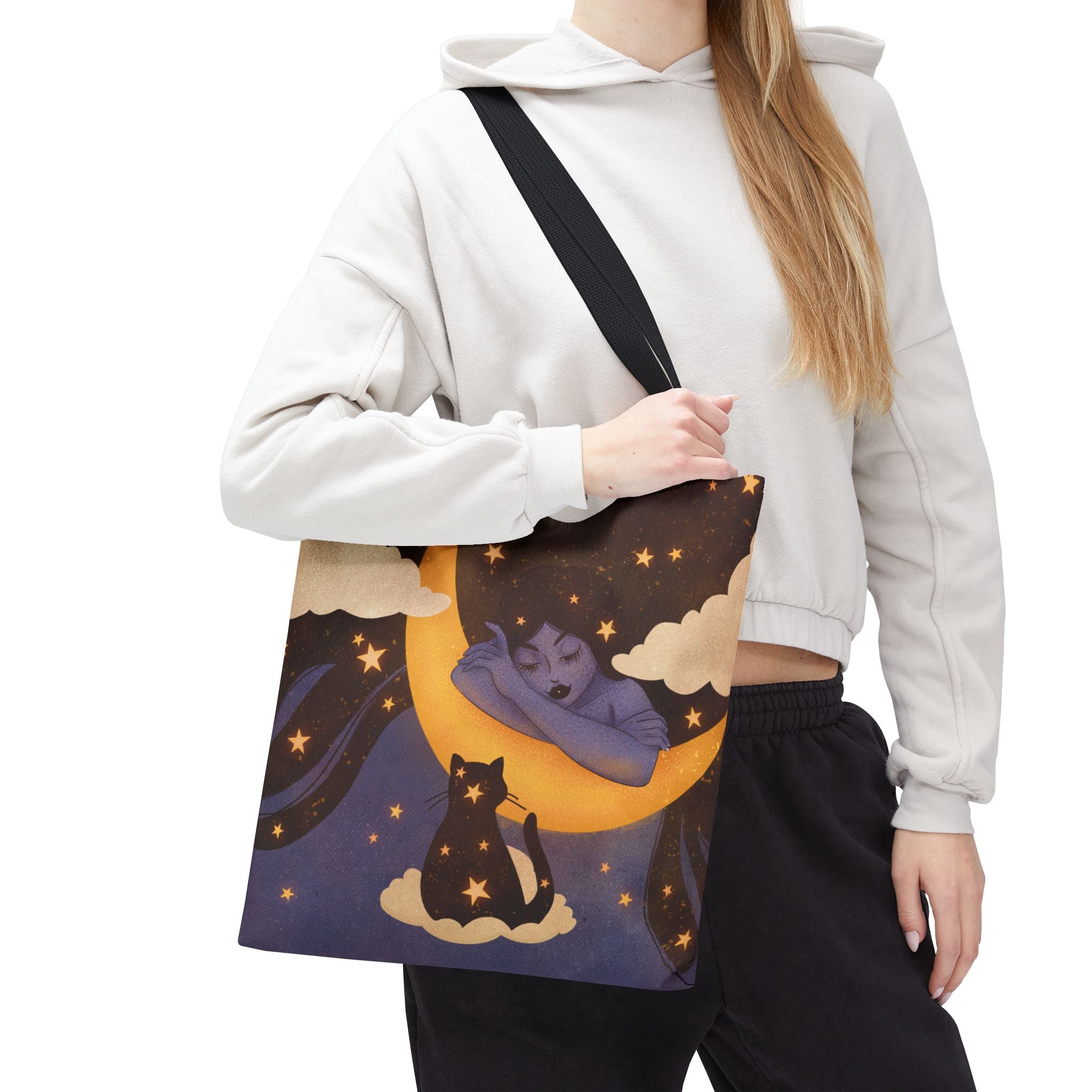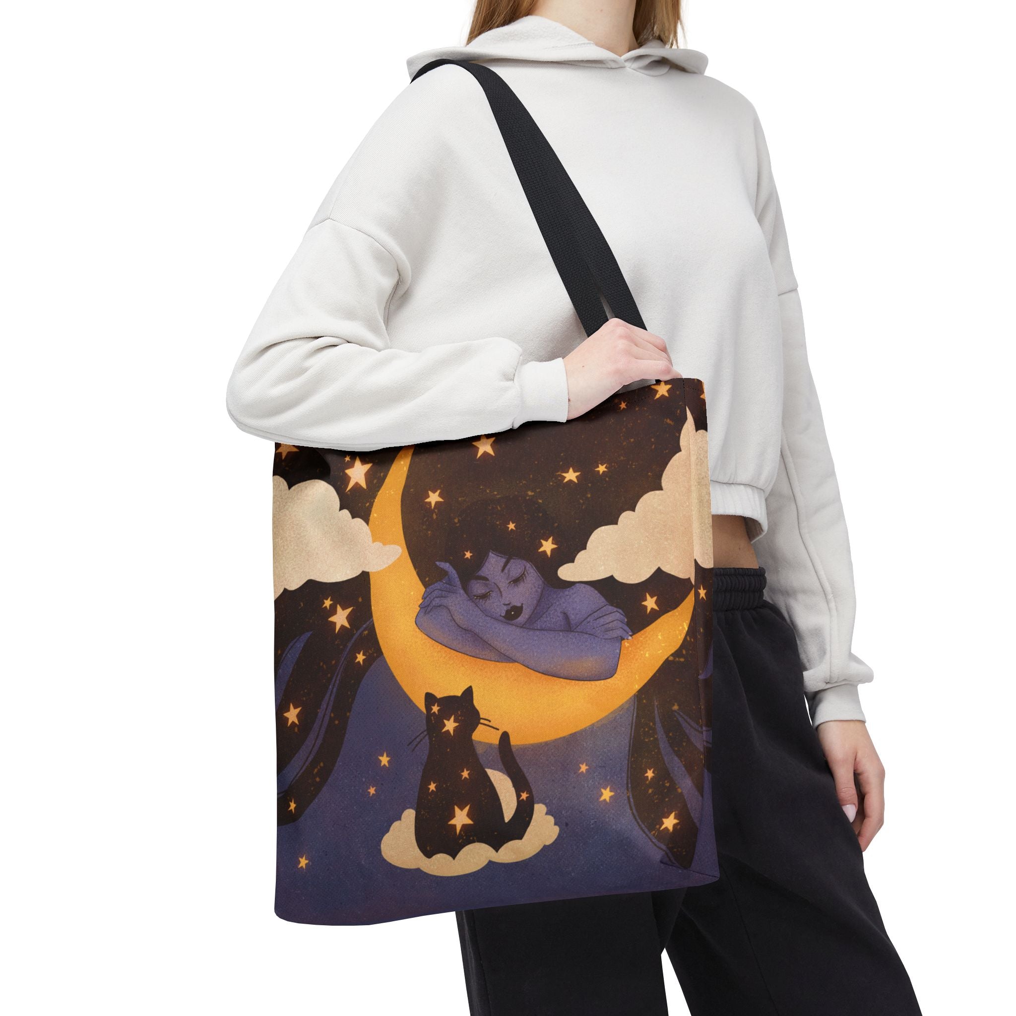 For all the luna lovers and Selene worshippers, we have this darling tote featuring a black cat communing with a moon goddess. With soft, muted colors, this roomy, heavy-duty tote is available in two sizes.