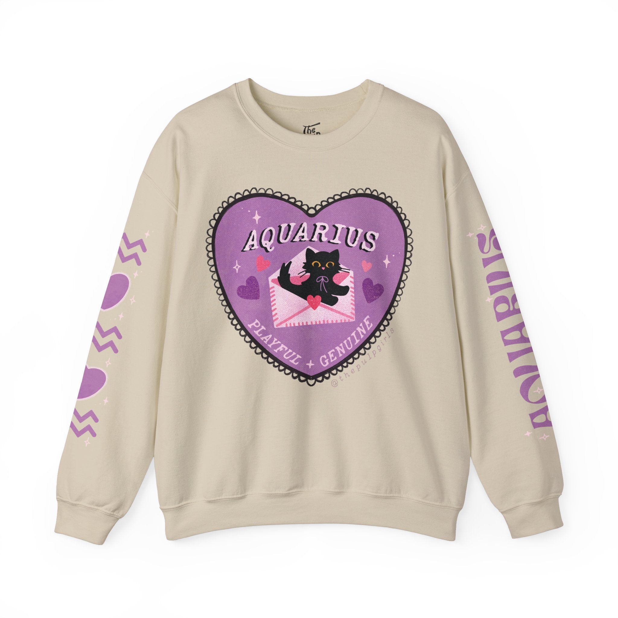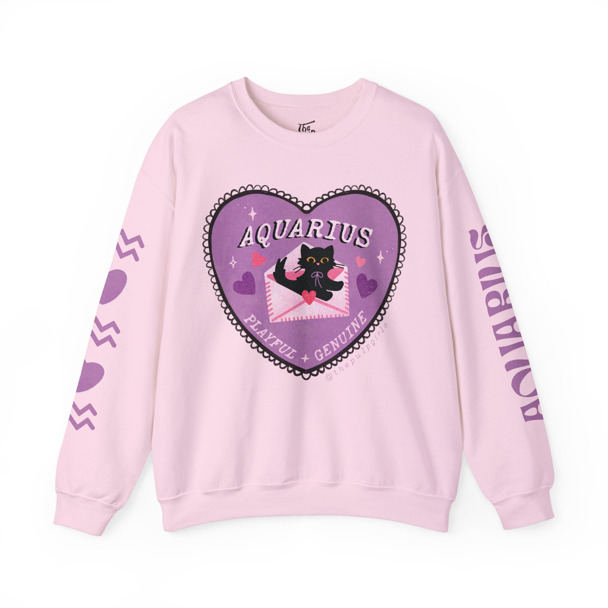 Aquarius darlings! Fall in ~love~ with our love themed cat astrology merch. Featuring the sign name along one sleeve, and your sign & some hearts along the other sleeve.