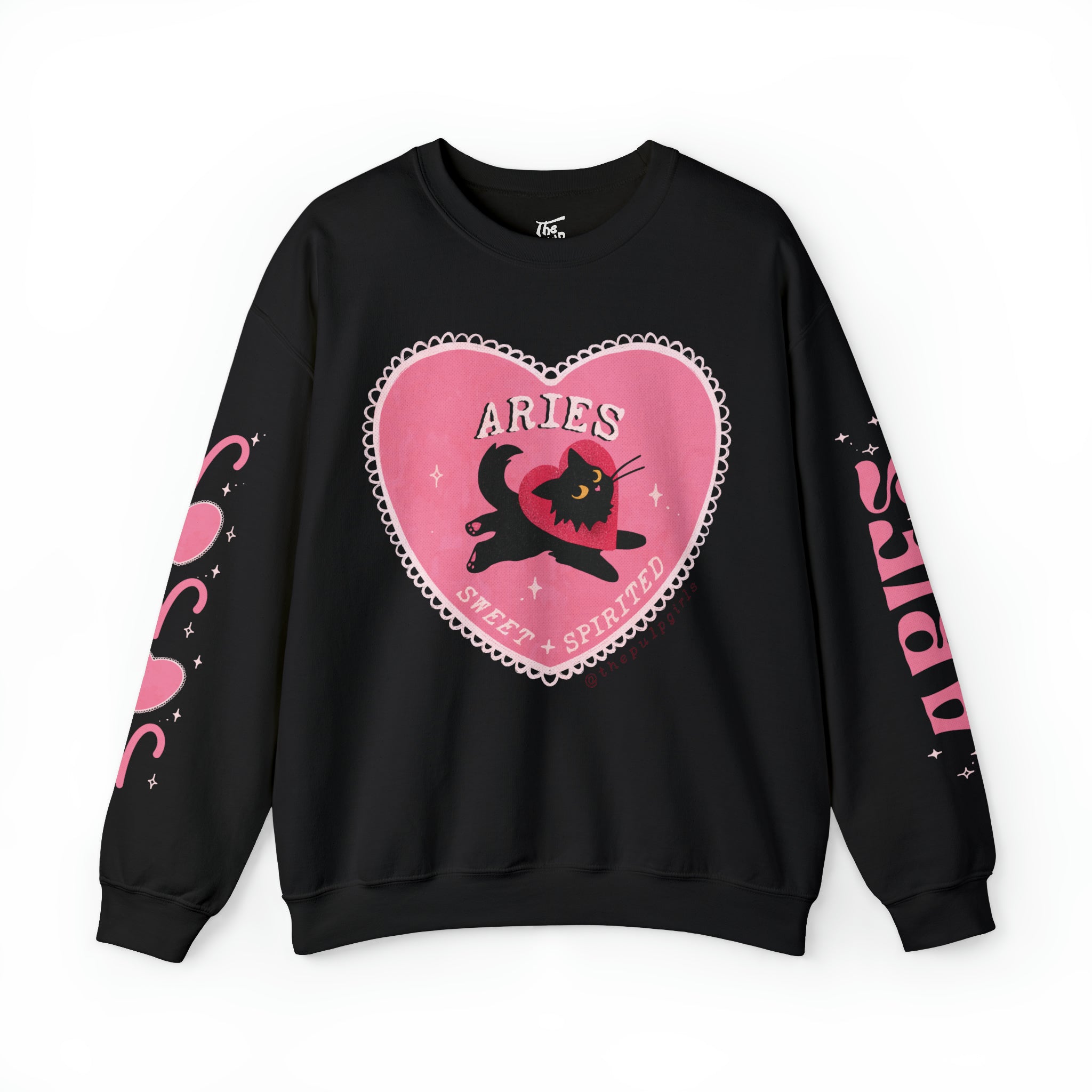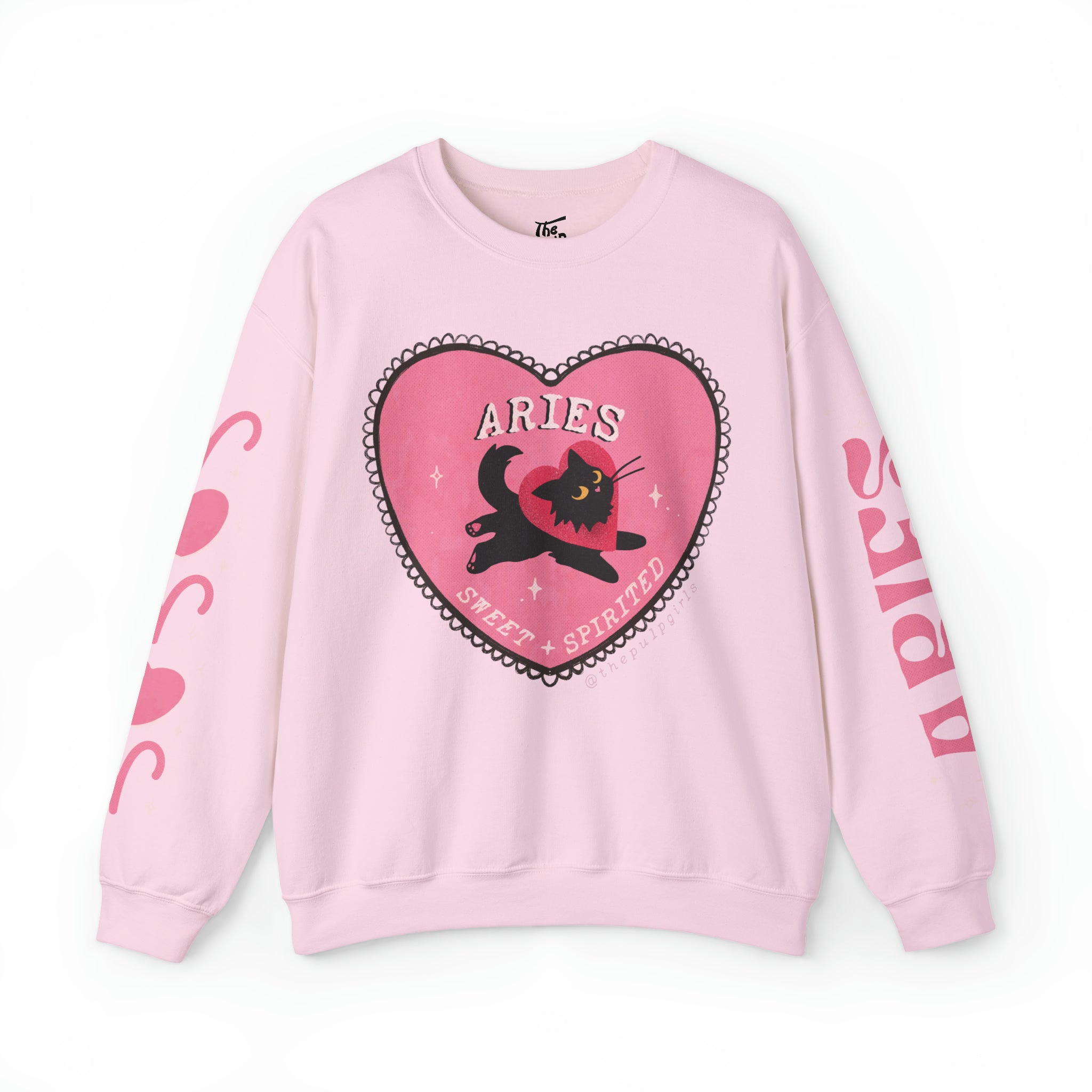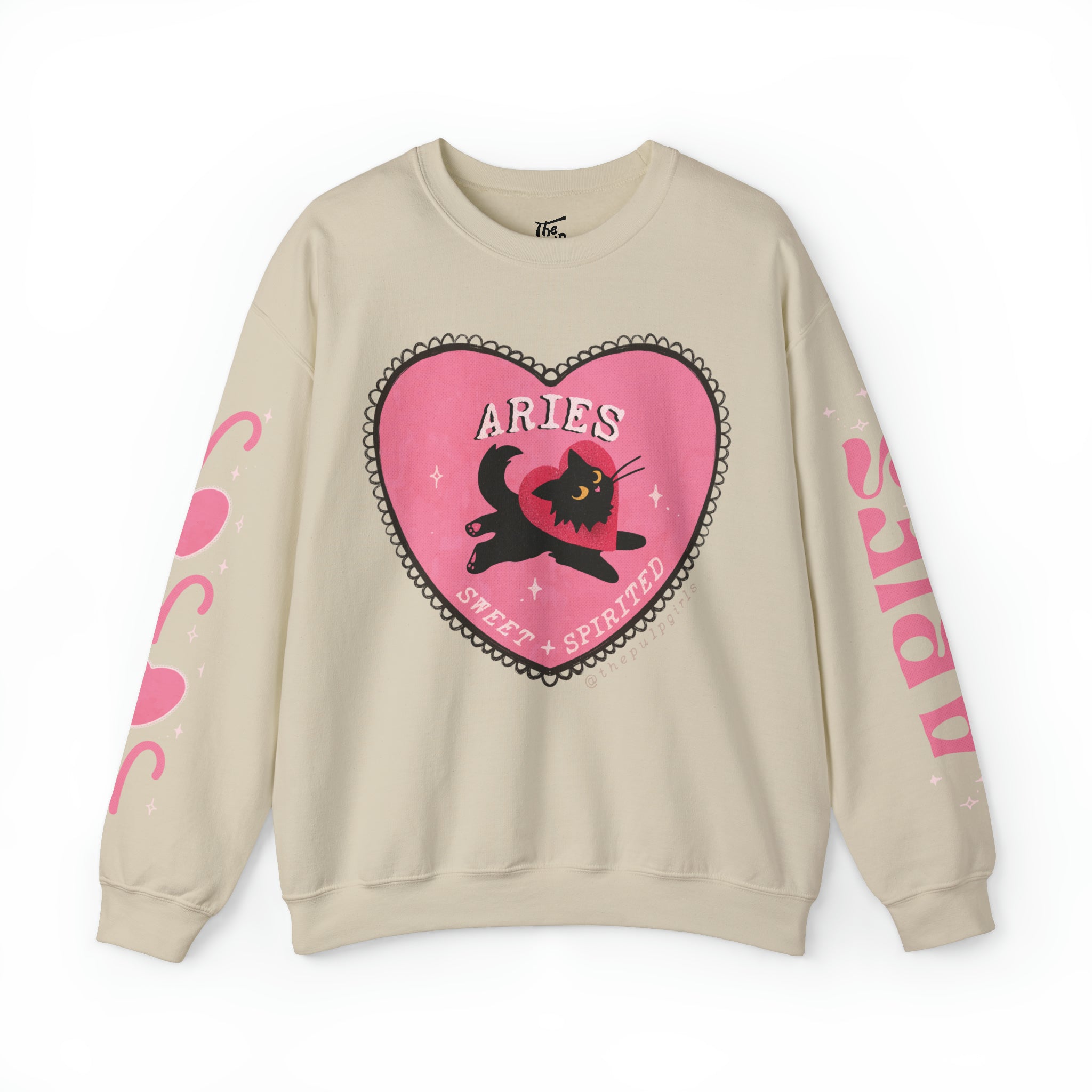 Aries darlings! Fall in ~love~ with our love themed cat astrology merch. Featuring the sign name along one sleeve, and your sign & some hearts along the other sleeve.