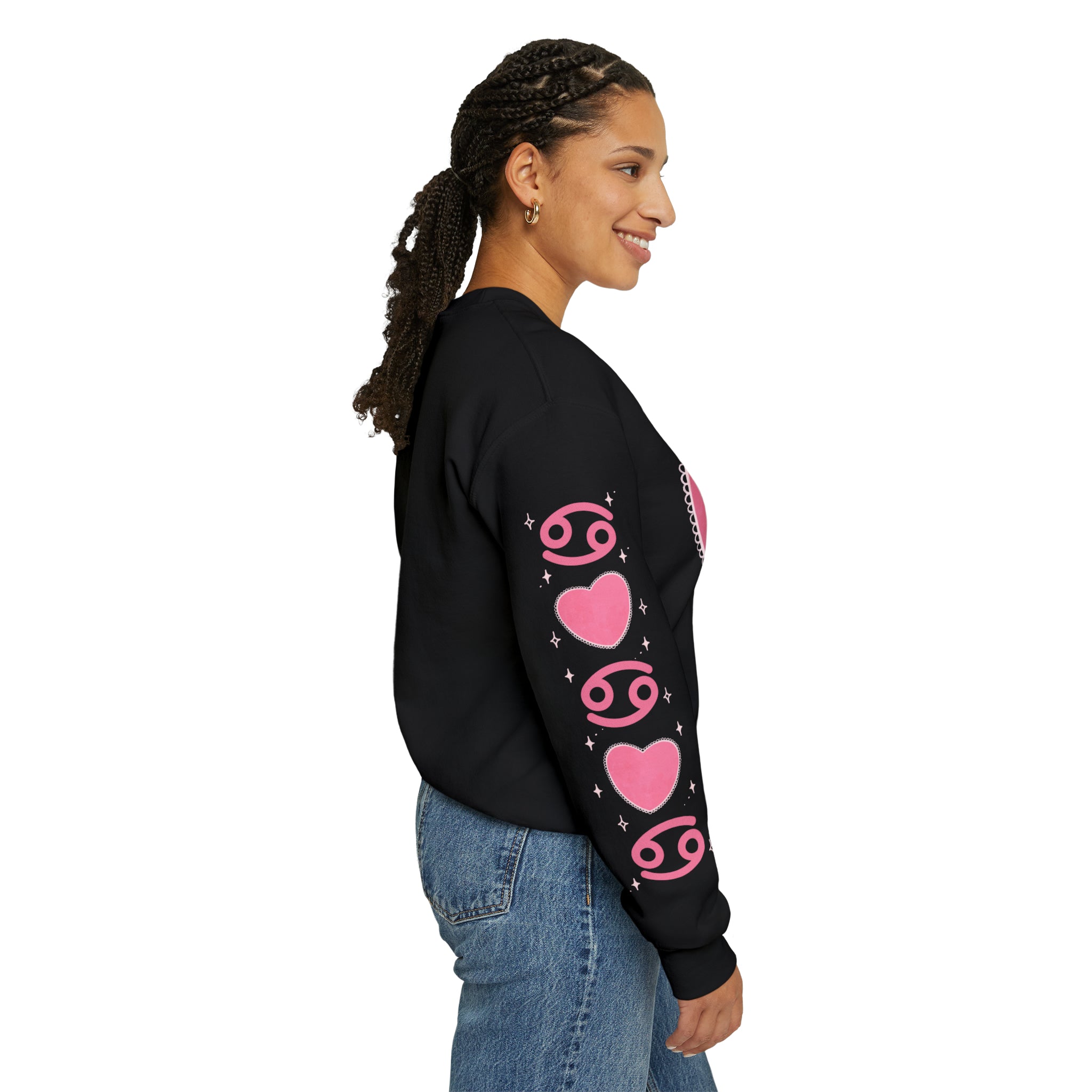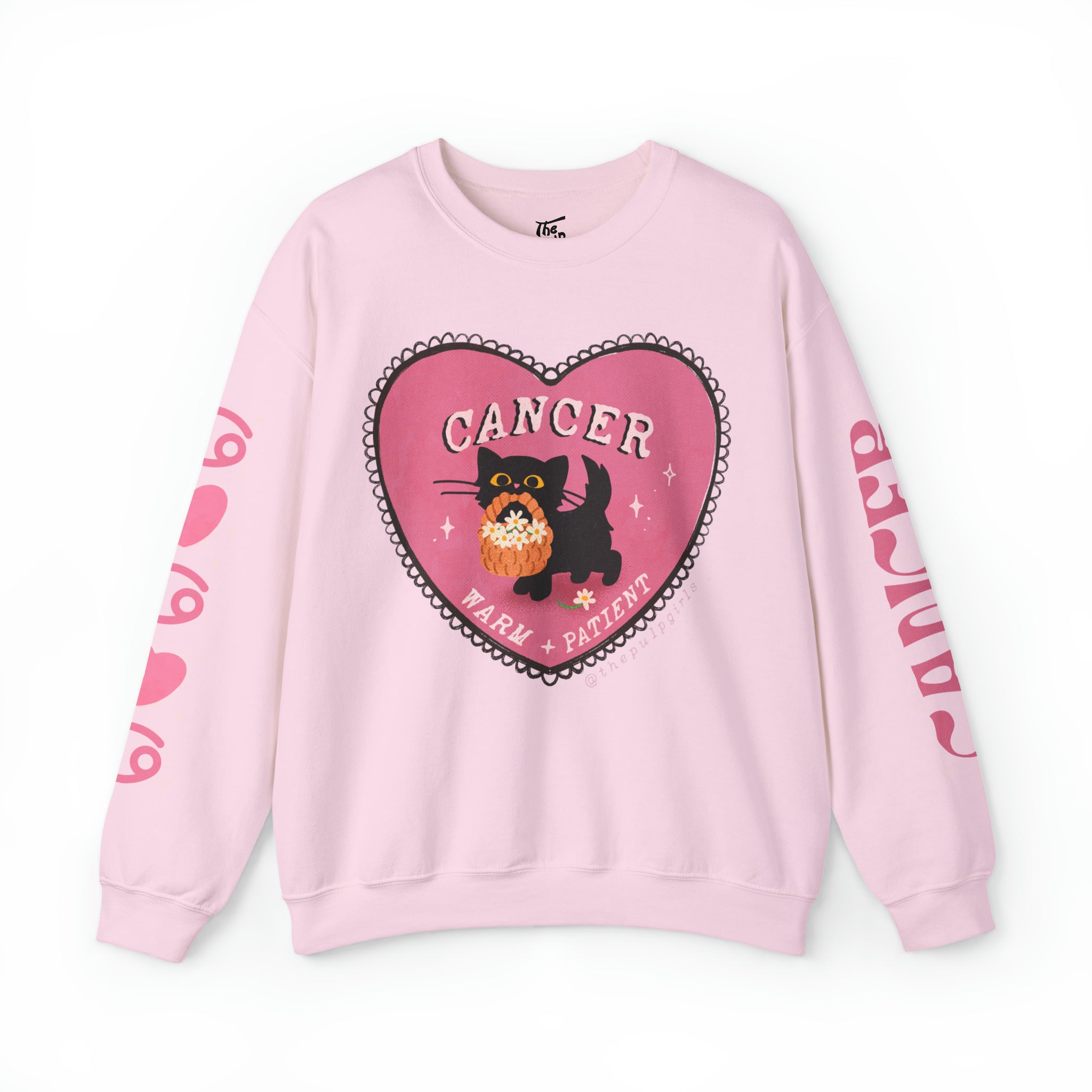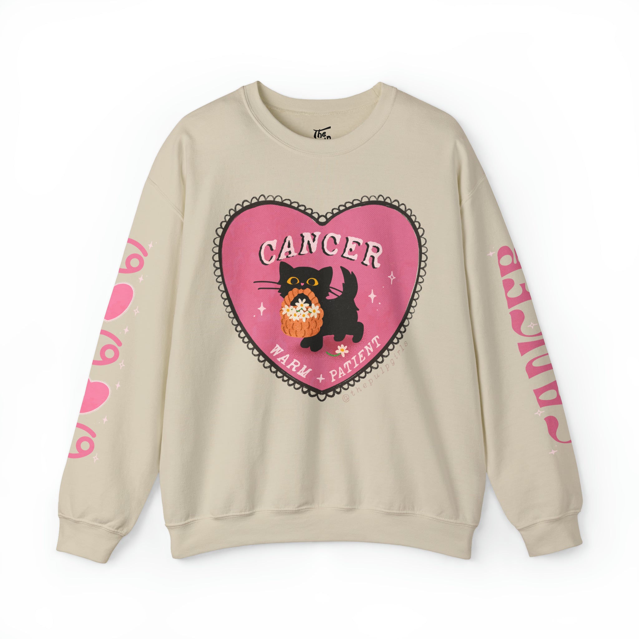 Cancer darlings! Fall in ~love~ with our love themed cat astrology merch. Featuring the sign name along one sleeve, and your sign & some hearts along the other sleeve.
