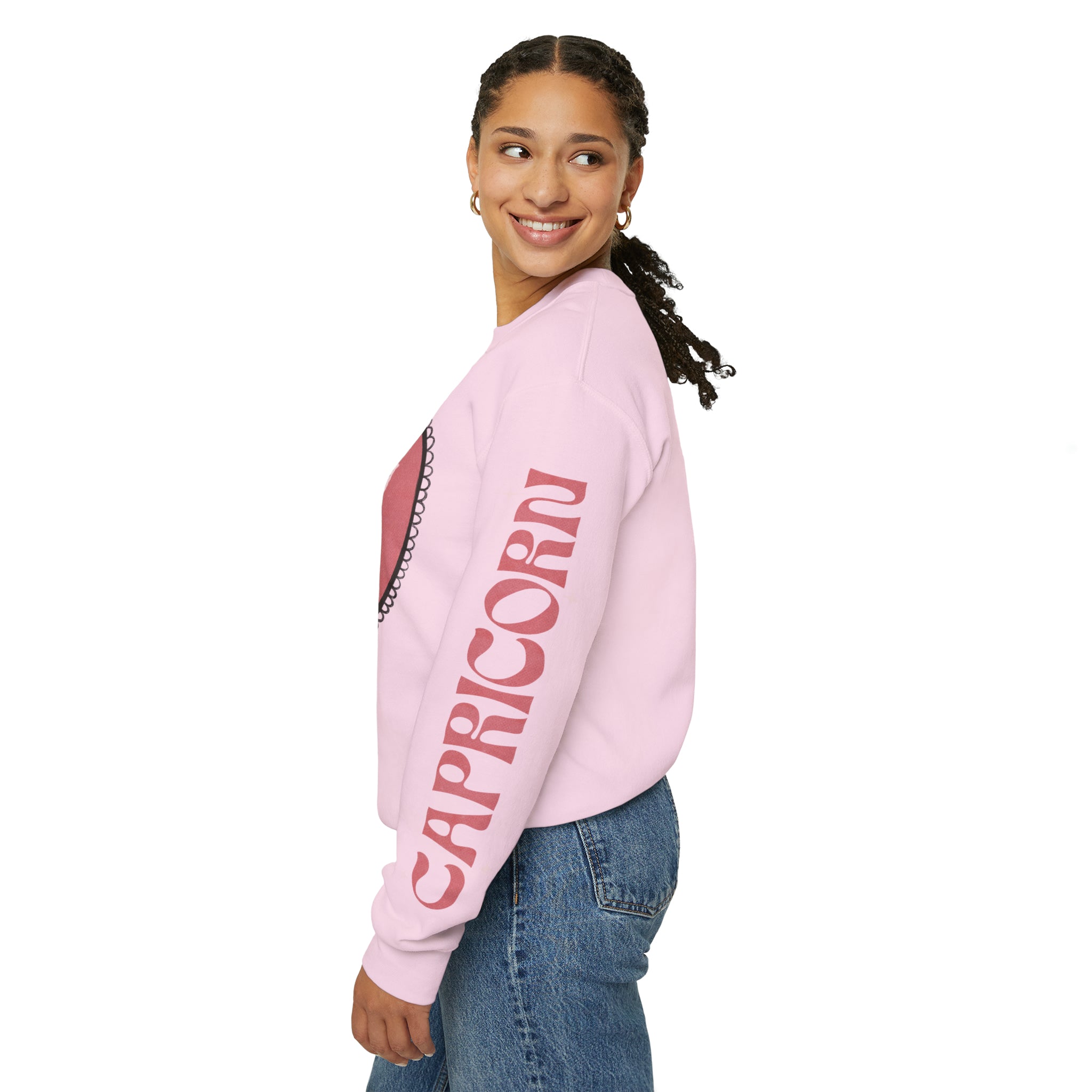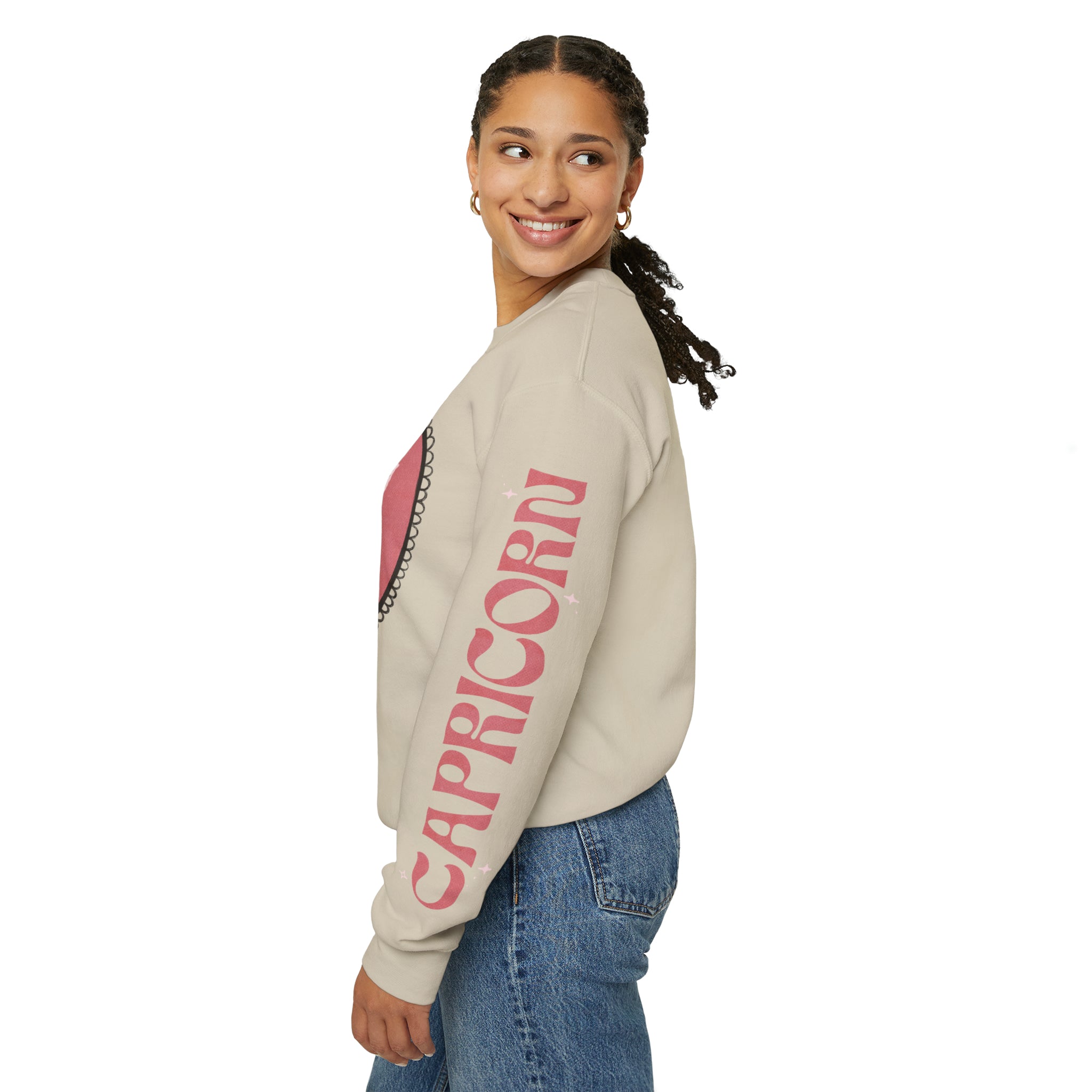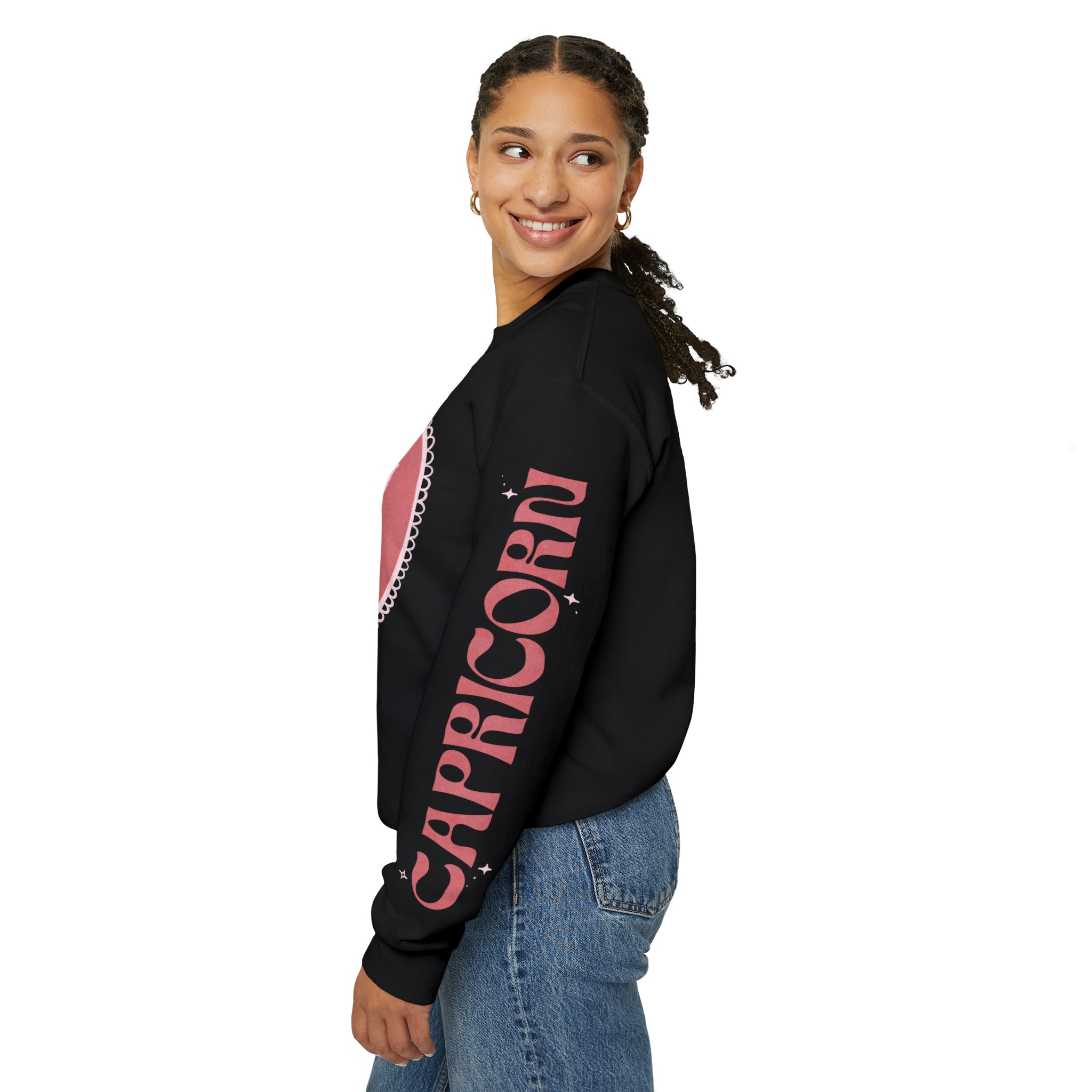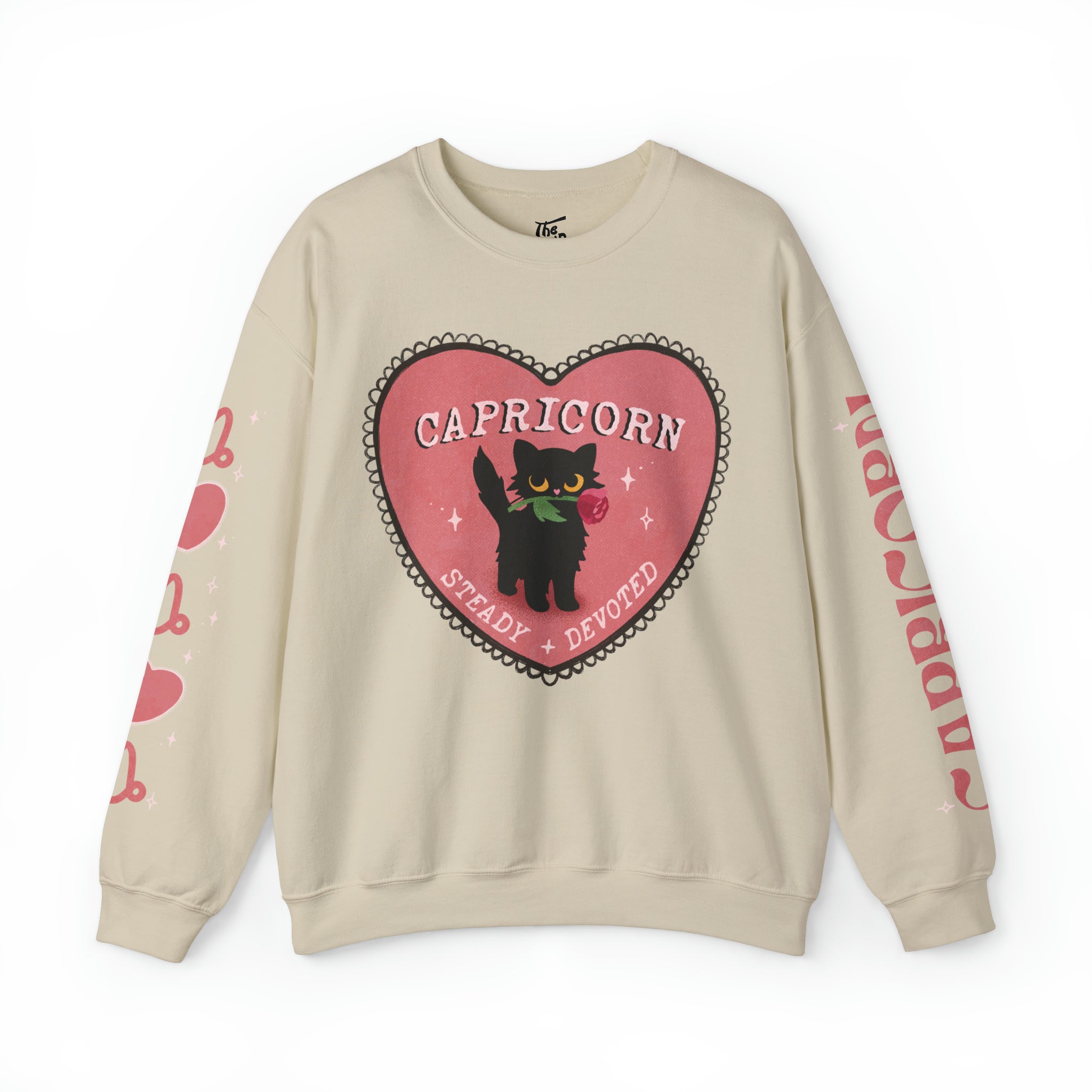 Capricorn darlings! Fall in ~love~ with our love themed cat astrology merch. Featuring the sign name along one sleeve, and your sign & some hearts along the other sleeve.