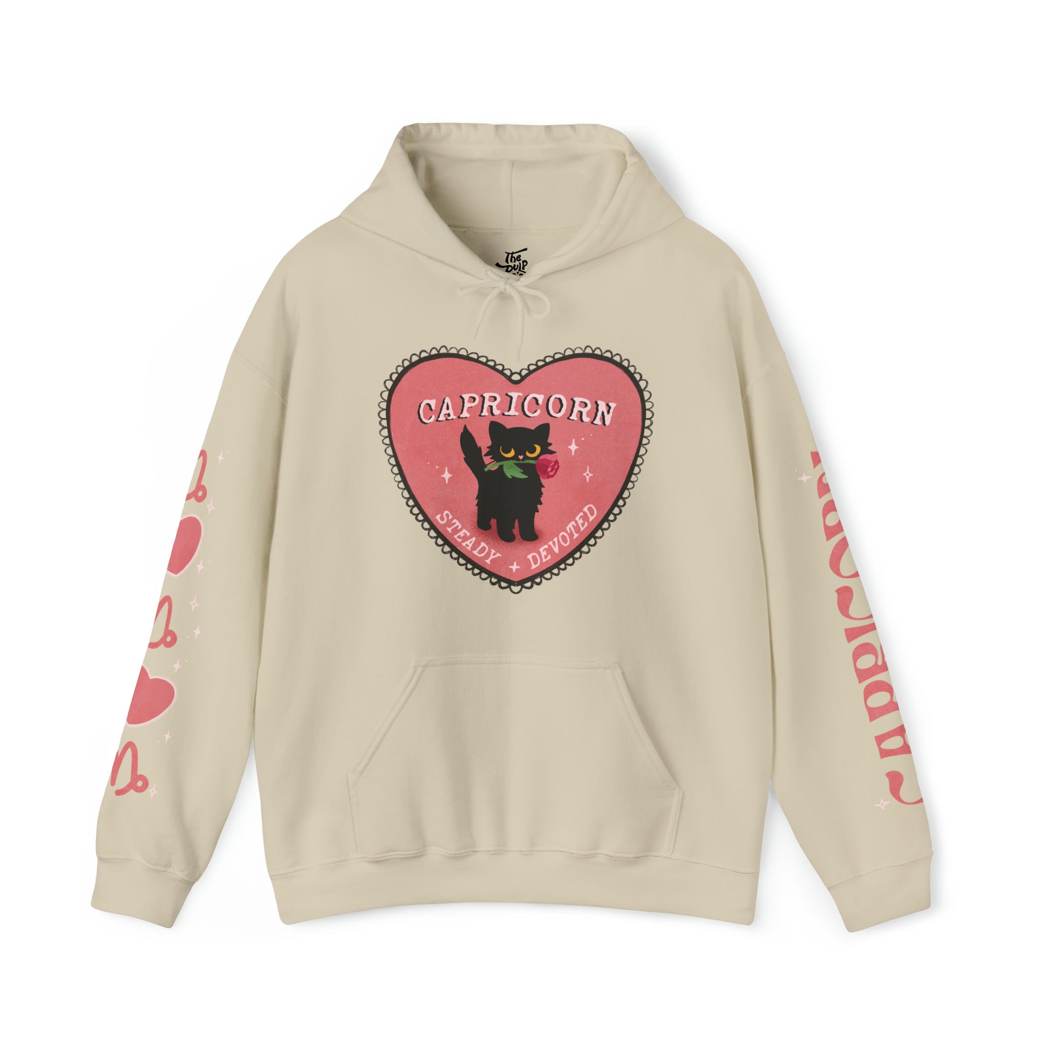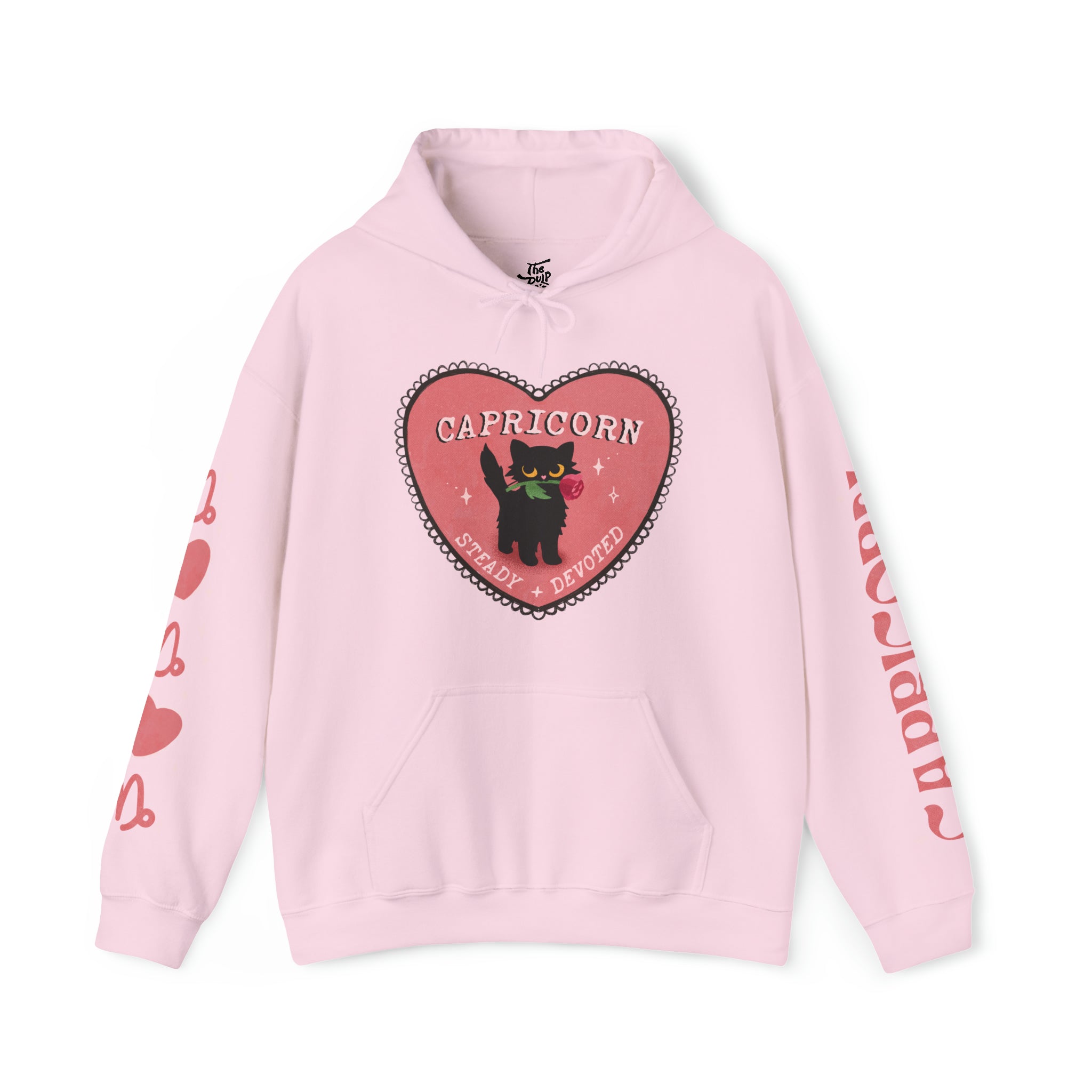 Capricorn darlings! Fall in ~love~ with our love themed cat astrology merch. Featuring the sign name along one sleeve, and your sign & some hearts along the other sleeve.