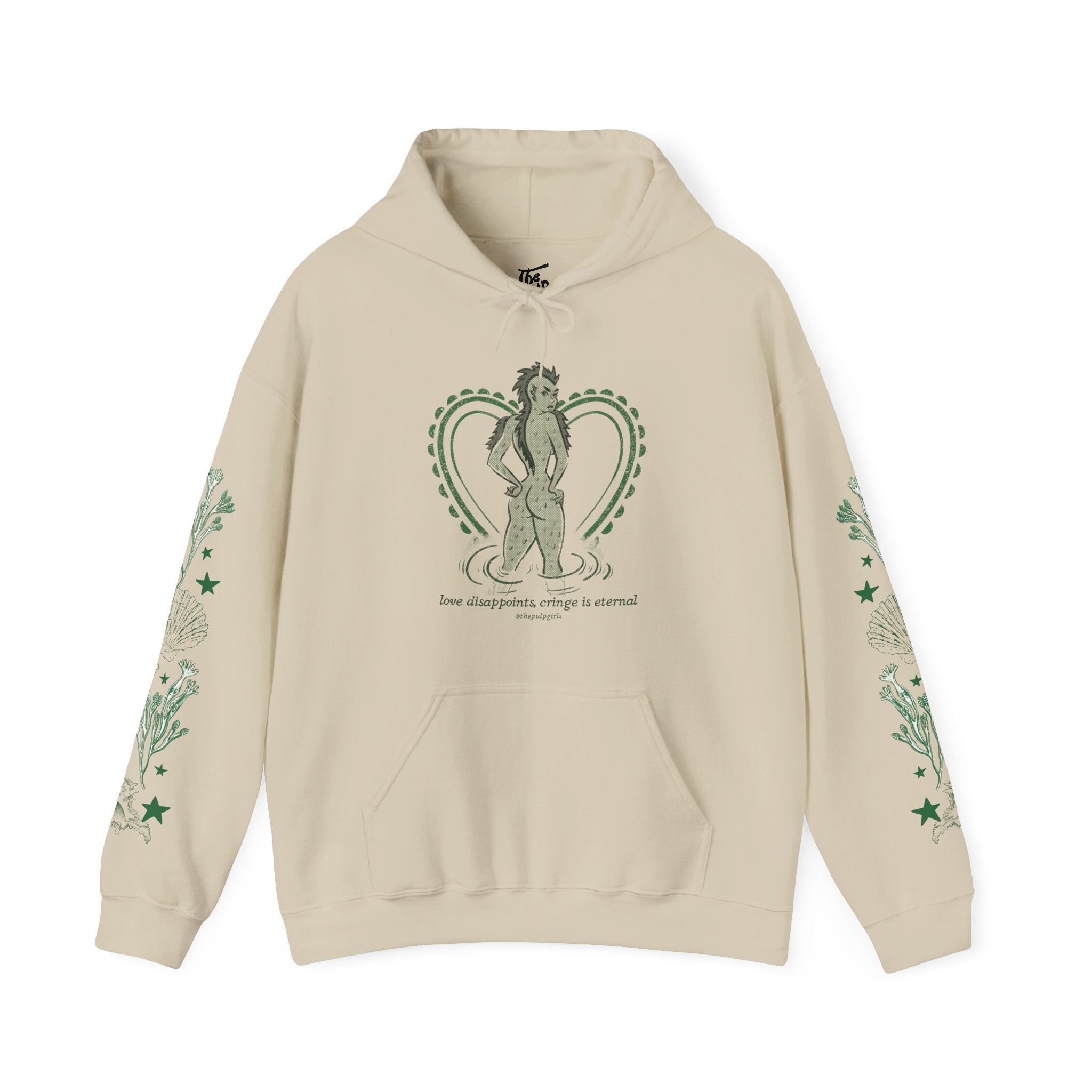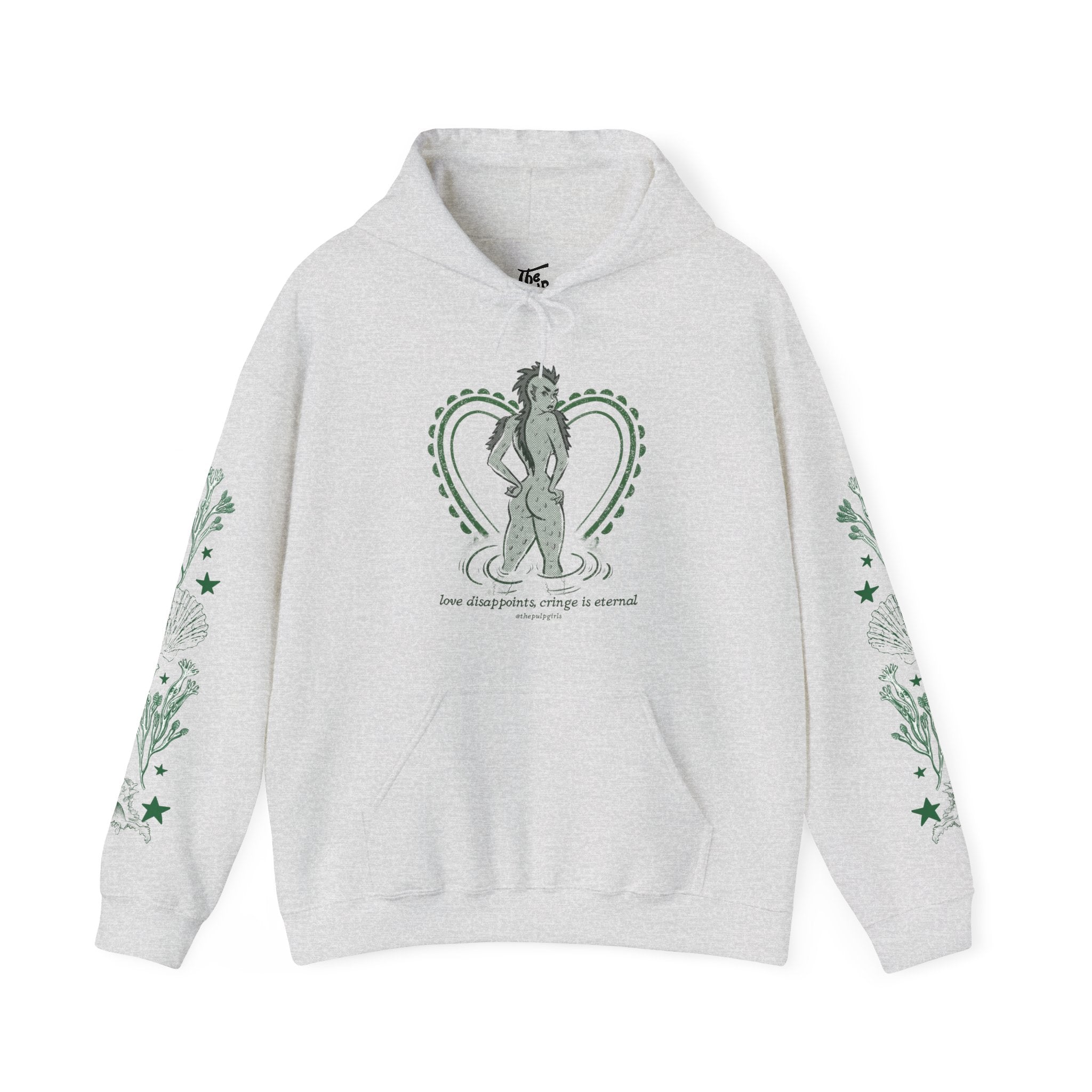 Pin-up lovers, this one is for you! Featuring a done-with-it-all, sea monster and the words "love disappoints, cringe is eternal" this spicy crewneck is guaranteed to turn some heads. Perfect for any and all lovers of the cute cryptids, a hint of spice, and letting that cringe flag fly high!