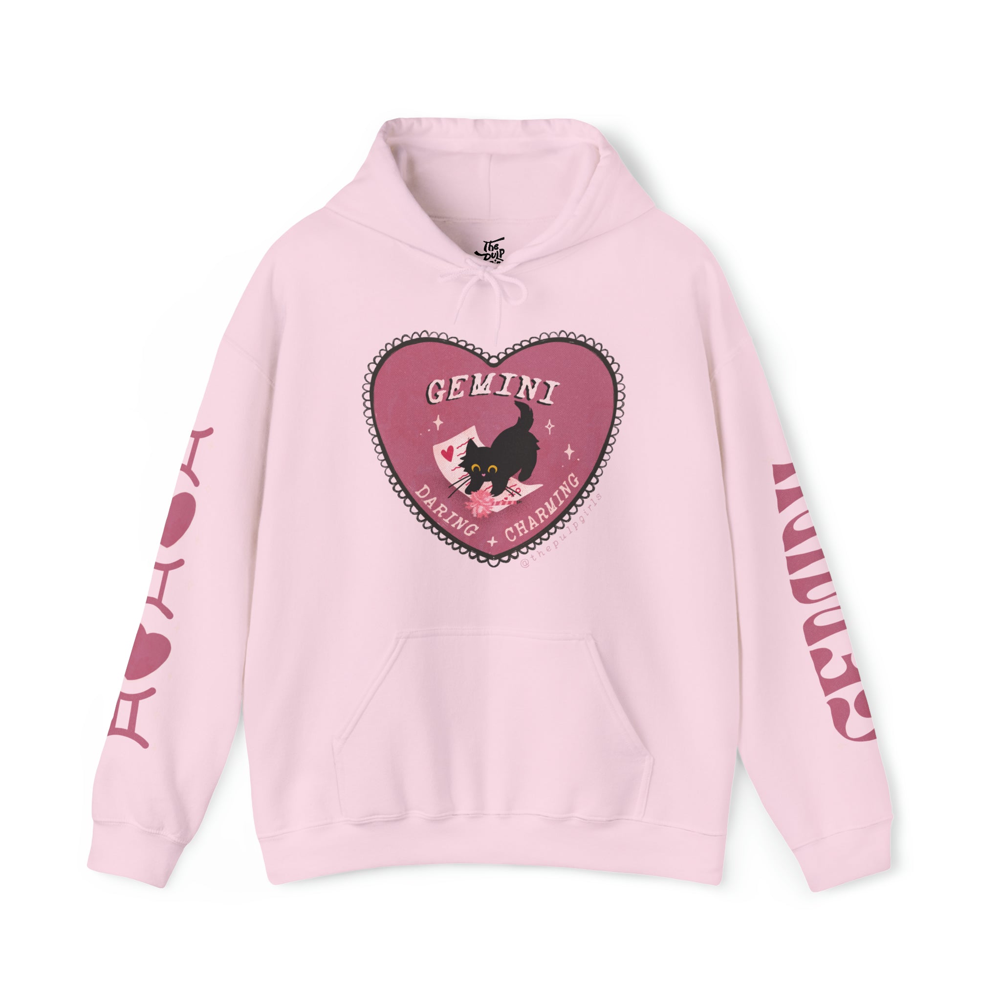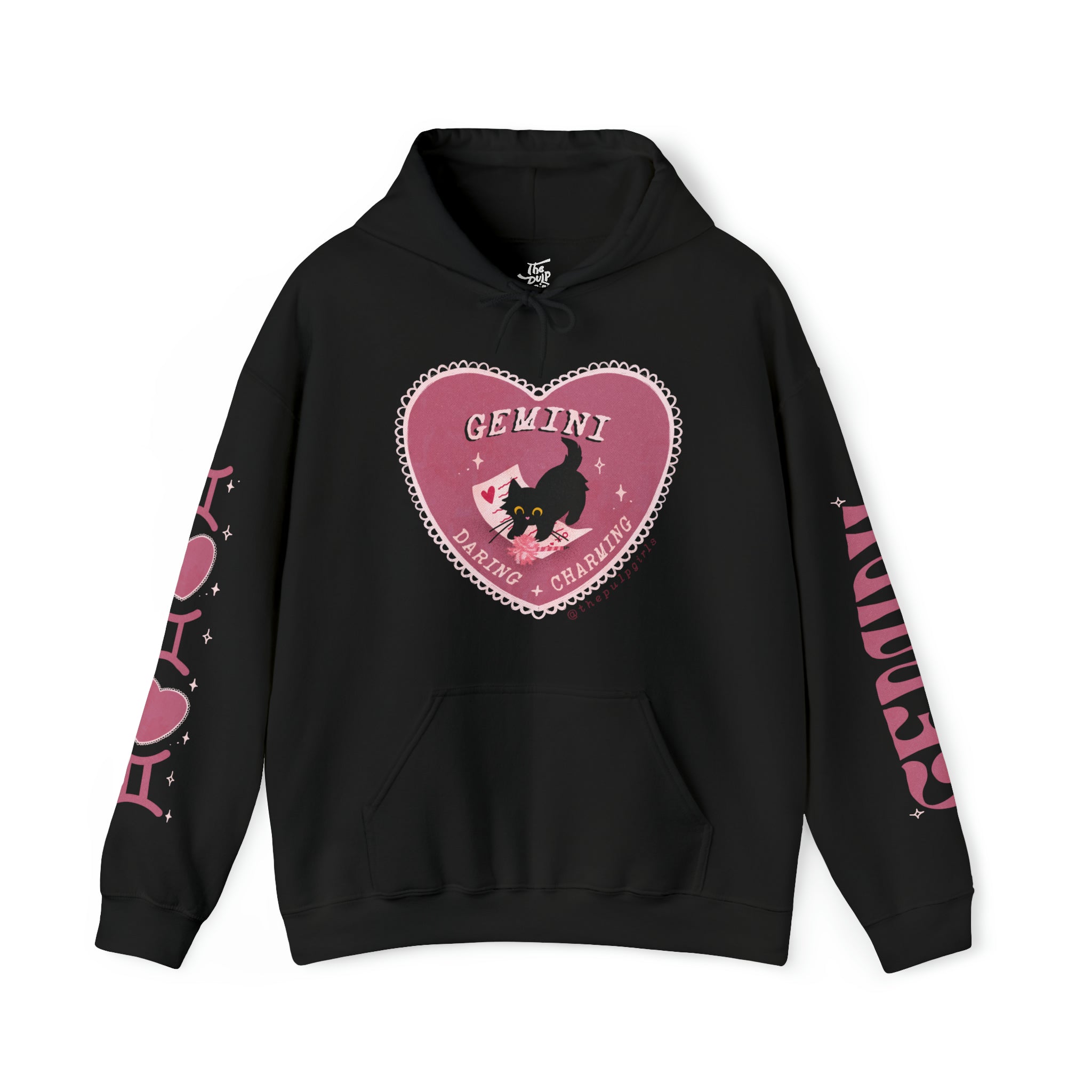 Gemini darlings! Fall in ~love~ with our love themed cat astrology merch. Featuring the sign name along one sleeve, and your sign & some hearts along the other sleeve.