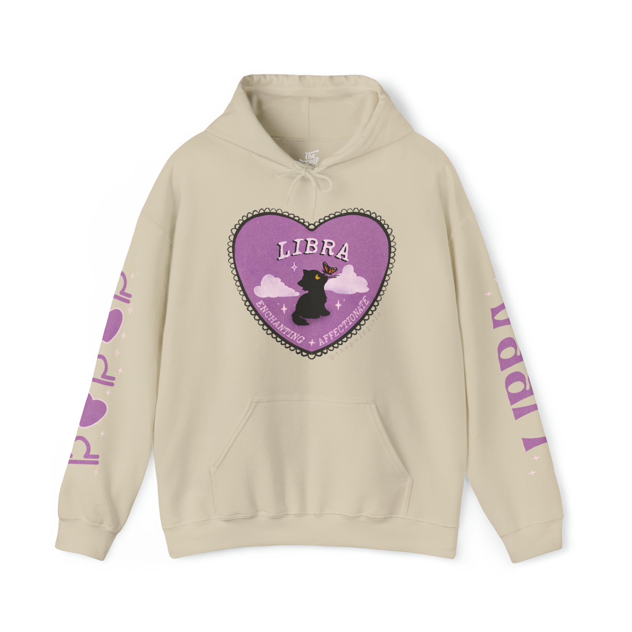 Libra darlings! Fall in ~love~ with our love themed cat astrology merch. Featuring the sign name along one sleeve, and your sign & some hearts along the other sleeve.