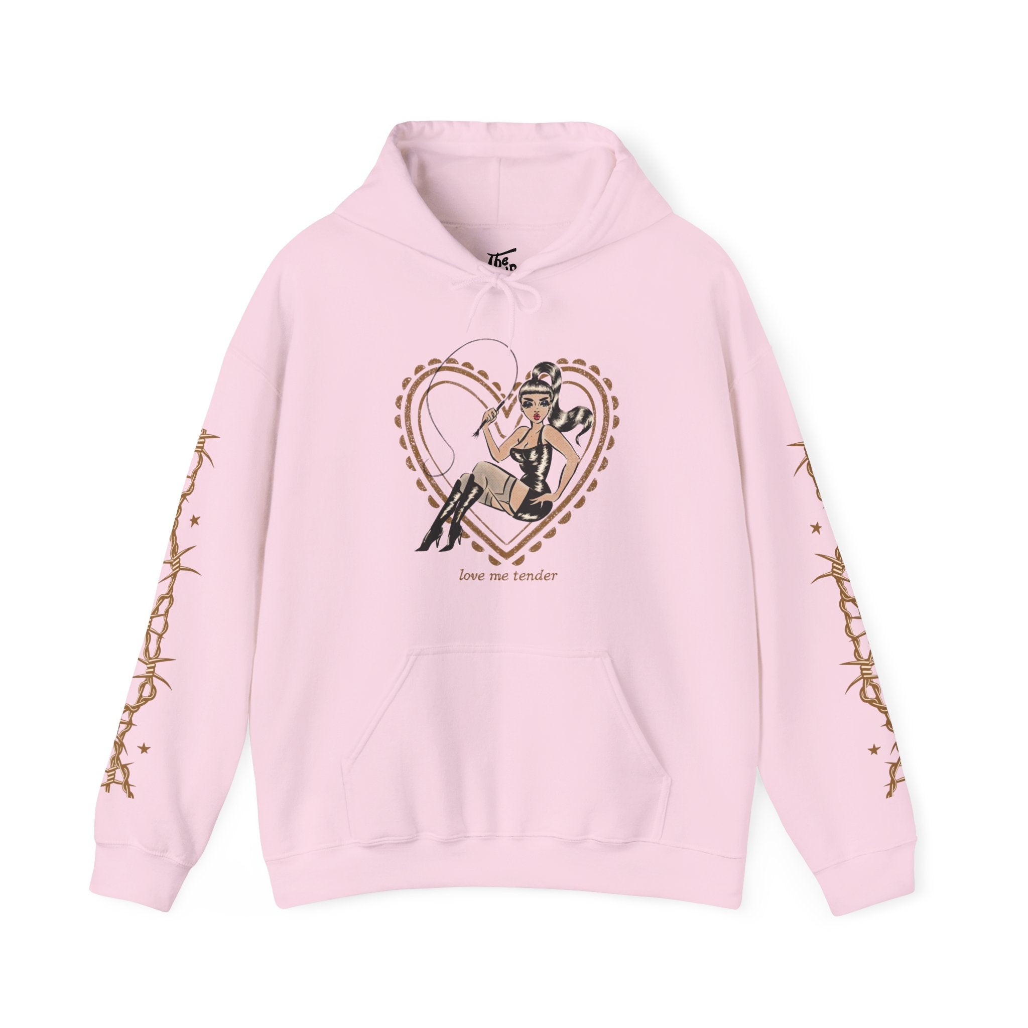 Pin-up lovers, this one is for you! Featuring a lovely, whip-wielding latex cutie and the words "love me tender," this spicy hooded sweatshirt is guaranteed to turn some heads. Perfect for any and all lovers of the dark feminine, a hint of spice, and crackin' the whip!