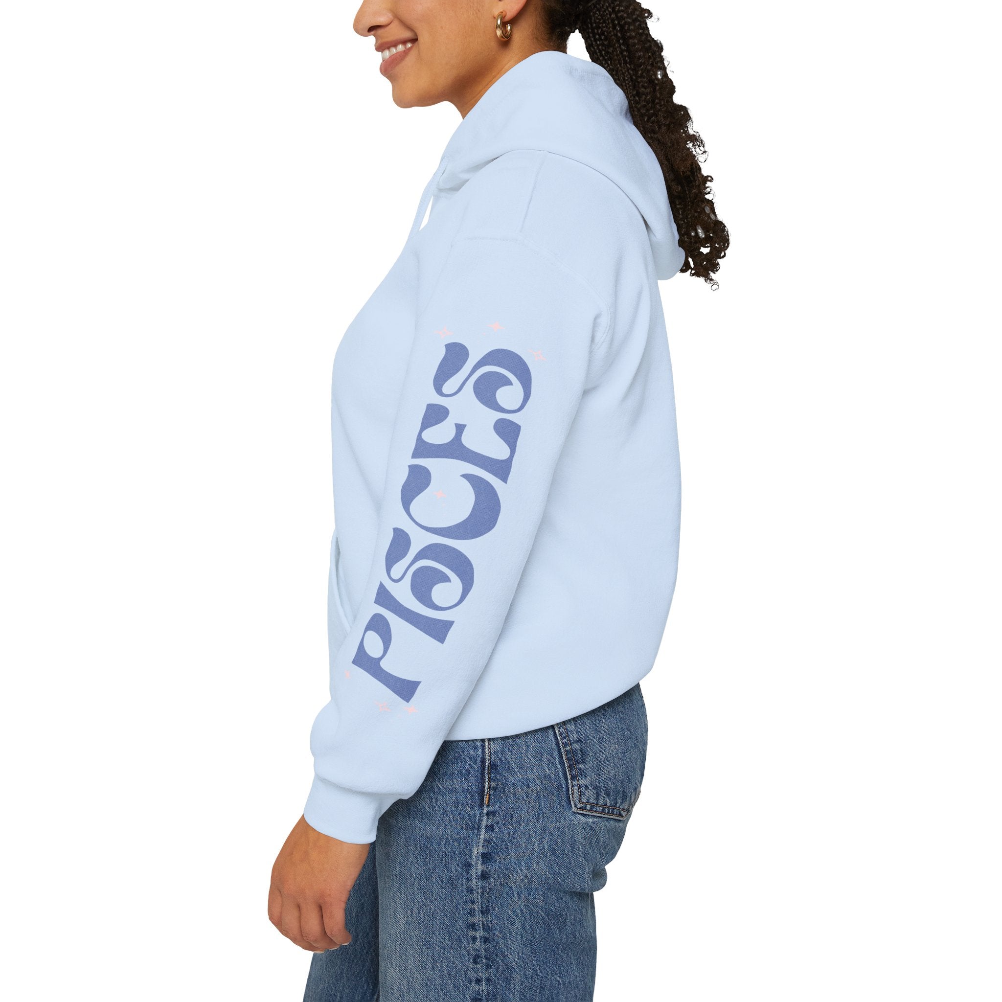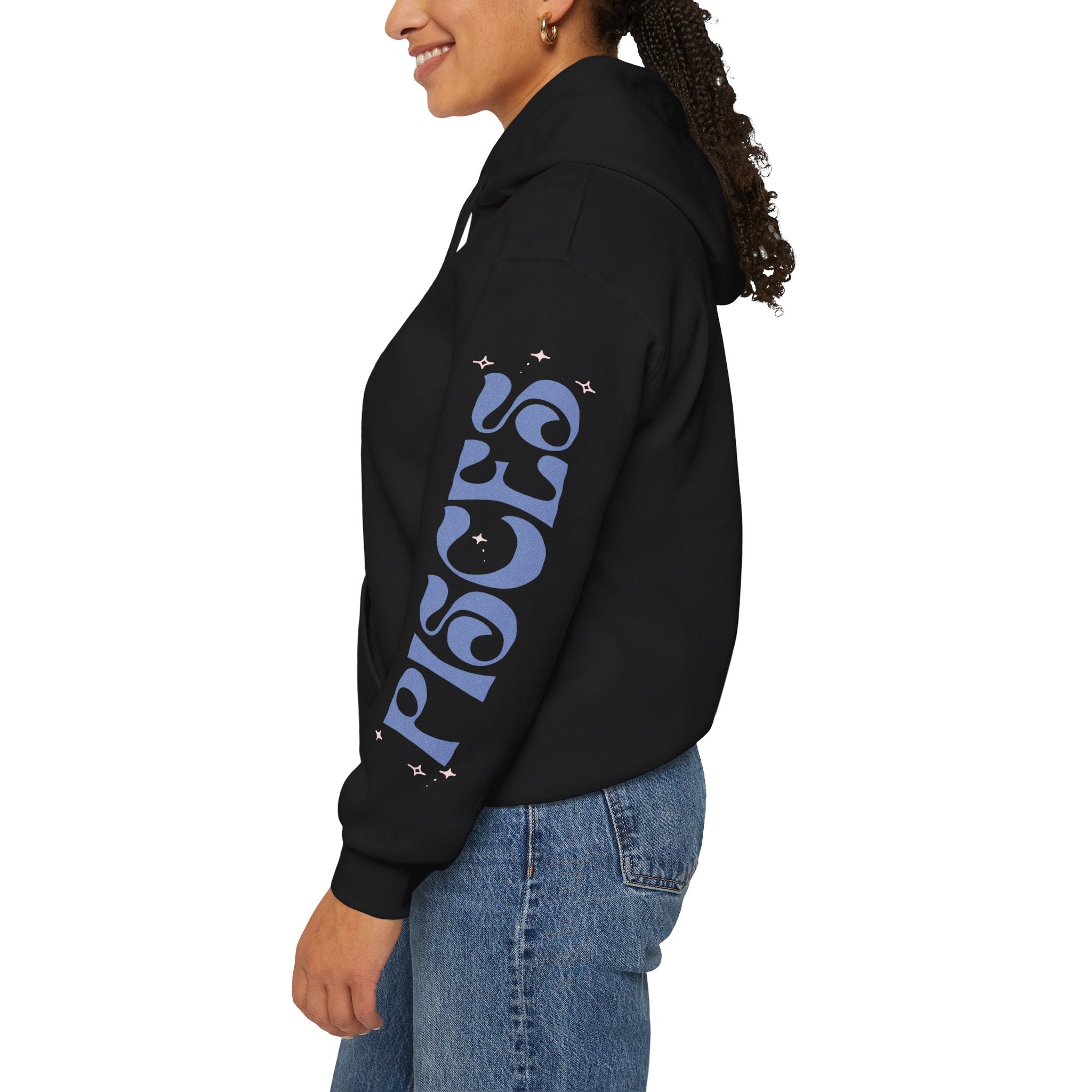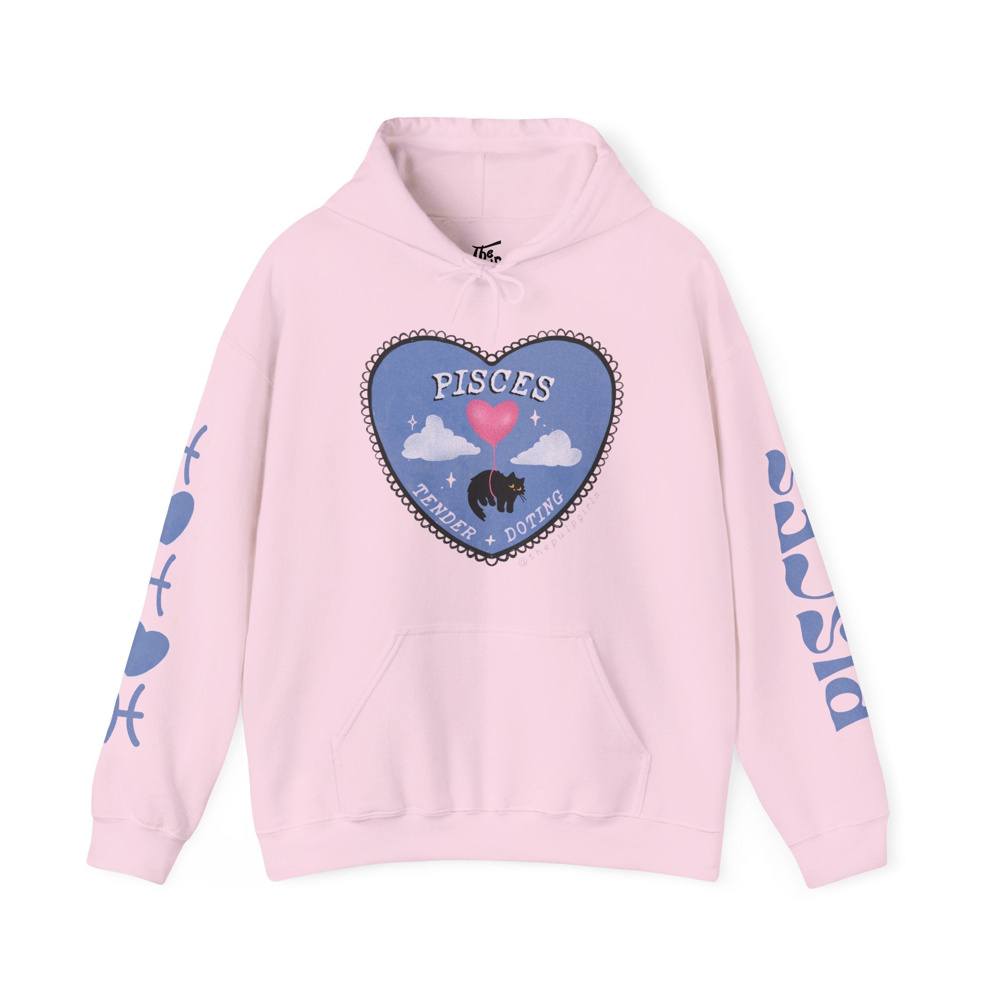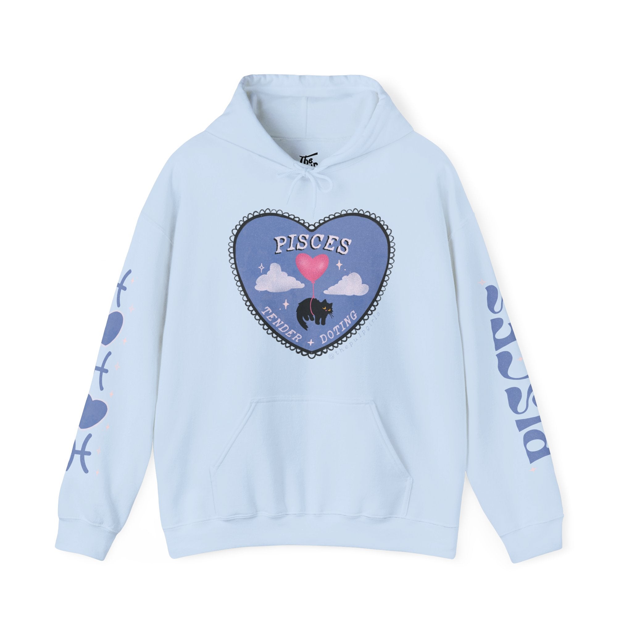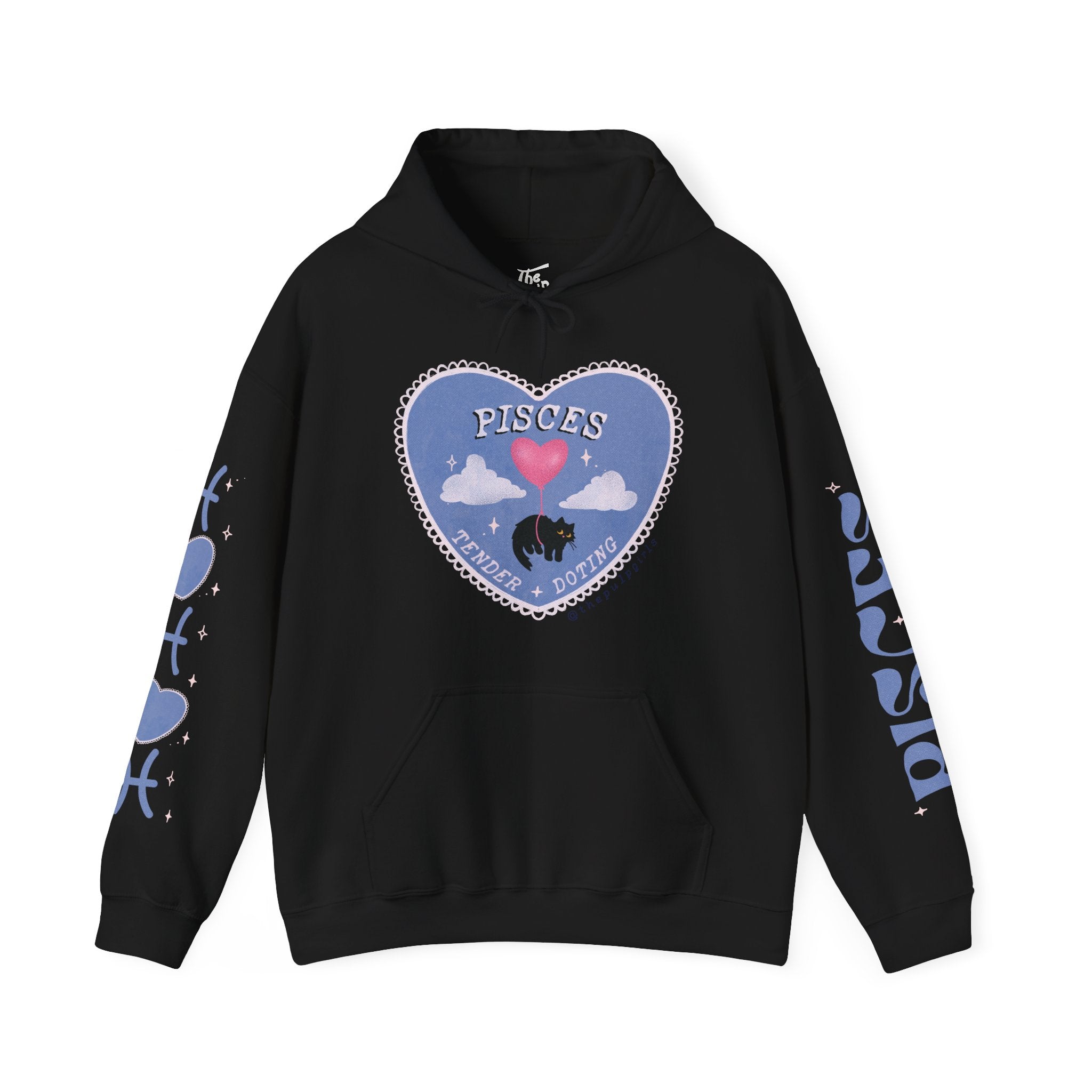 Pisces darlings! Fall in ~love~ with our love themed cat astrology merch. Featuring the sign name along one sleeve, and your sign & some hearts along the other sleeve.
