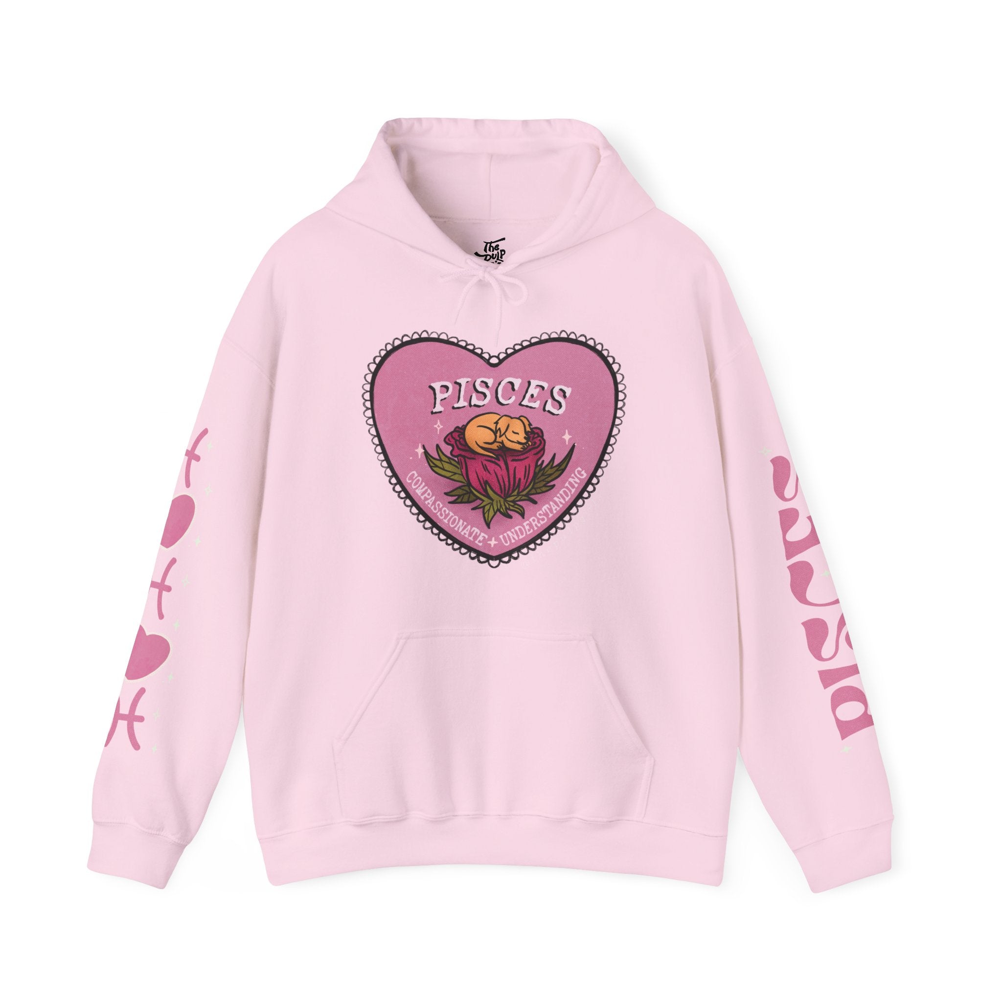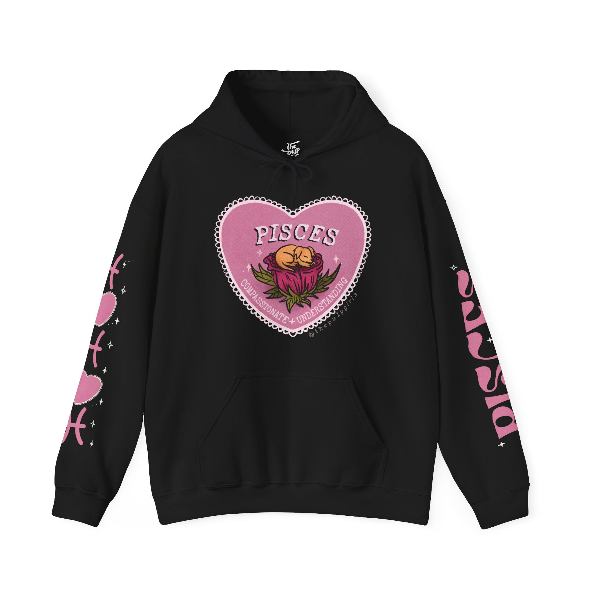 Pisces darlings! Fall in ~love~ with our love themed dog astrology merch. Featuring the sign name along one sleeve, and your sign & some hearts along the other sleeve.