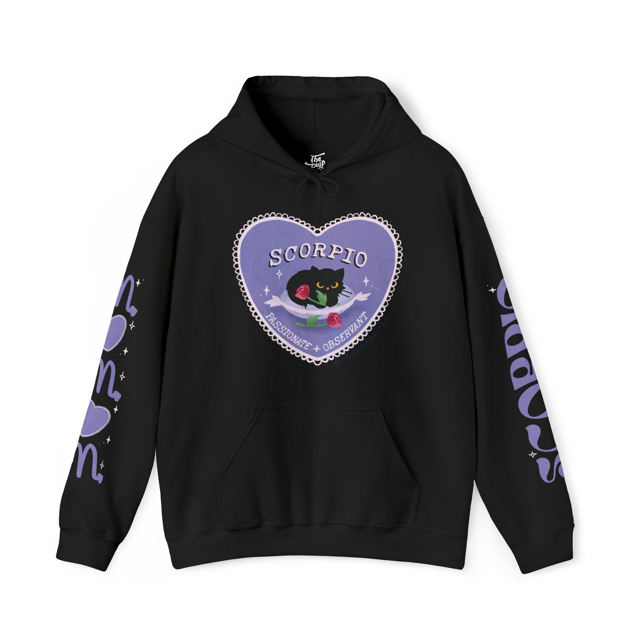 Scorpio darlings! Fall in ~love~ with our love themed cat astrology merch. Featuring the sign name along one sleeve, and your sign & some hearts along the other sleeve.