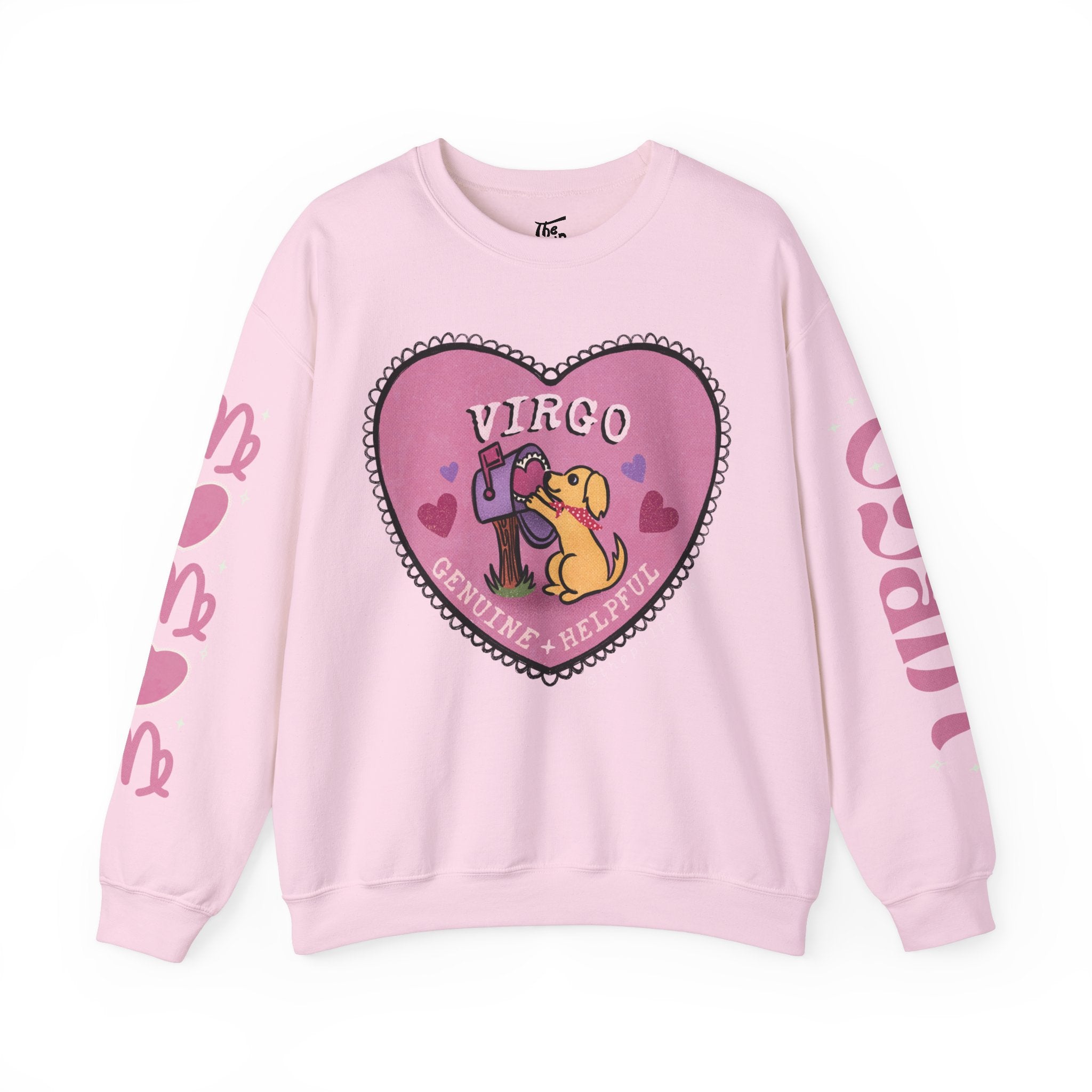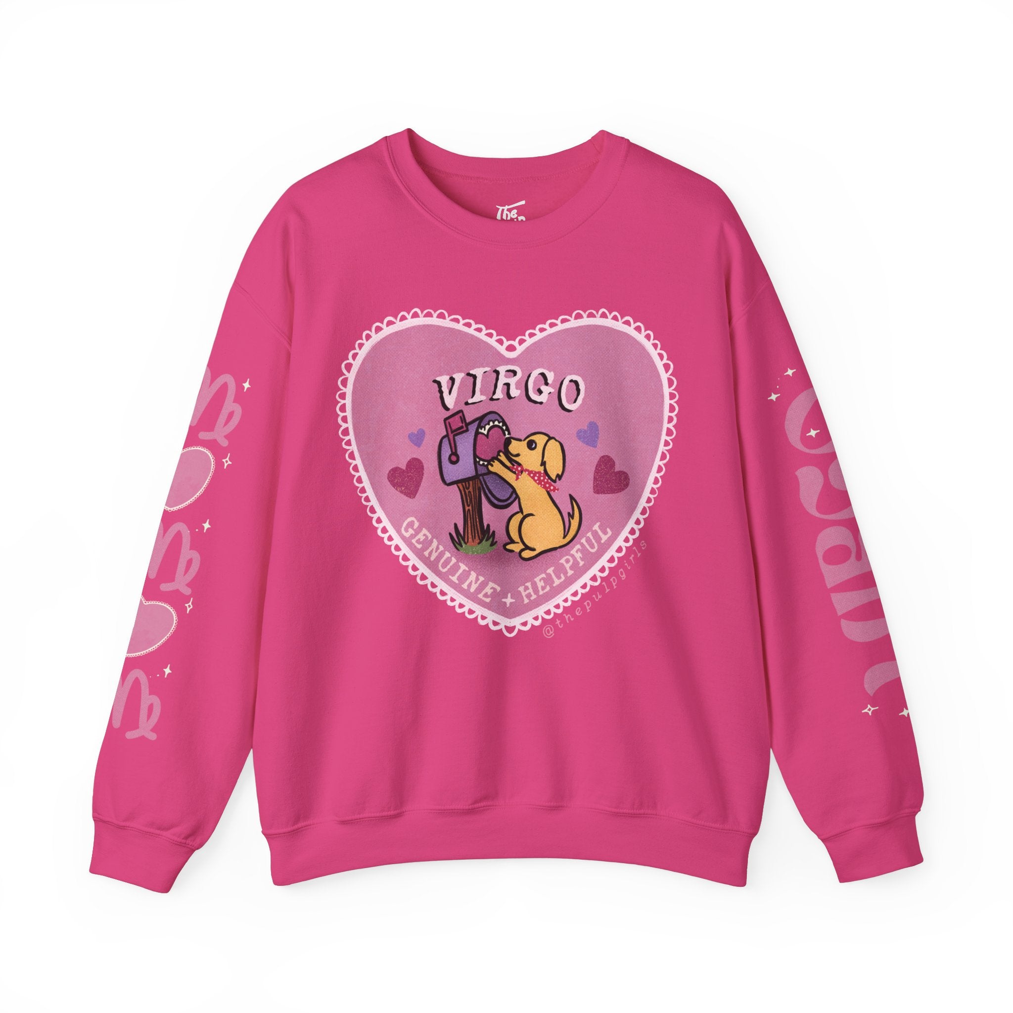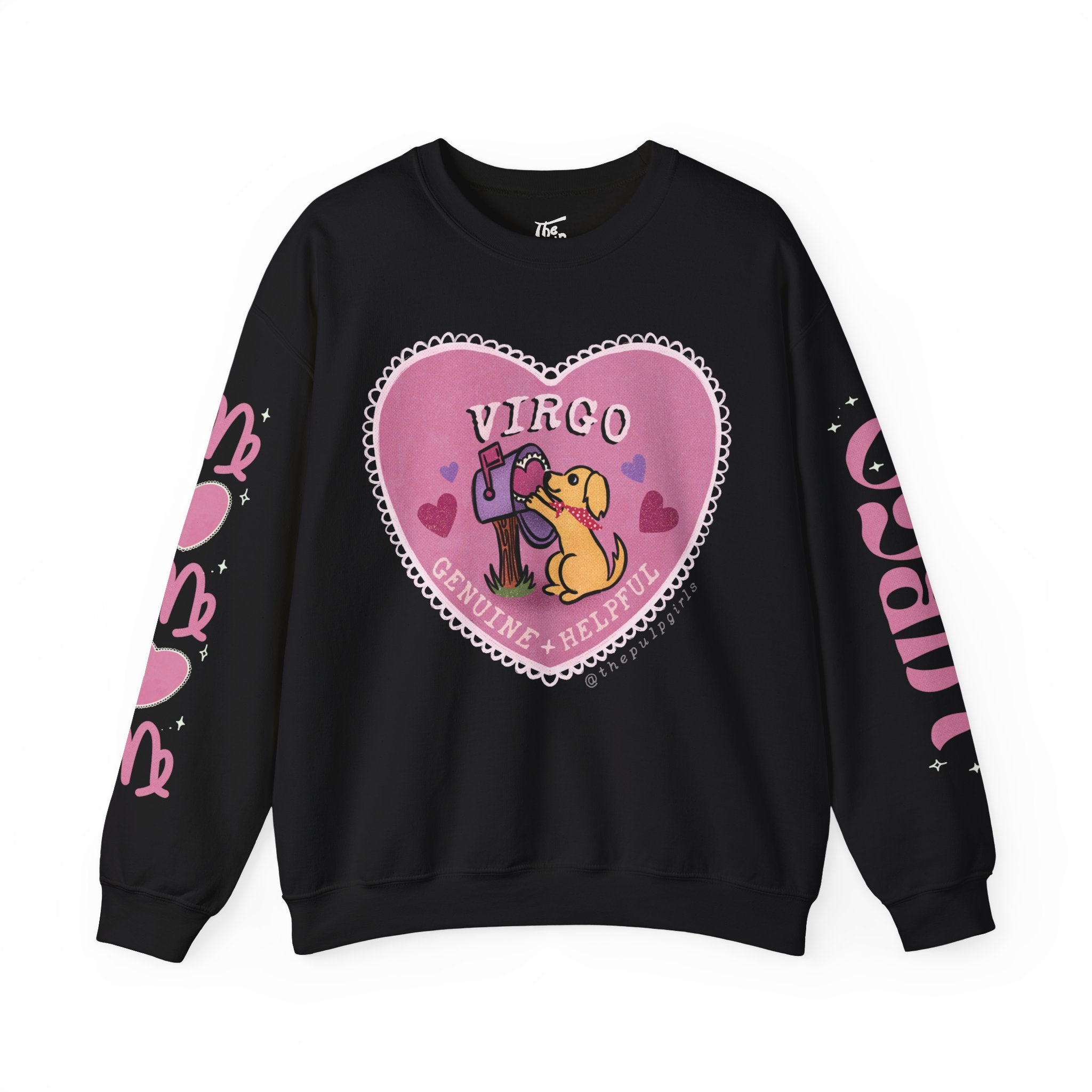 Virgo darlings! Fall in ~love~ with our love themed dog astrology merch. Featuring the sign name along one sleeve, and your sign & some hearts along the other sleeve.