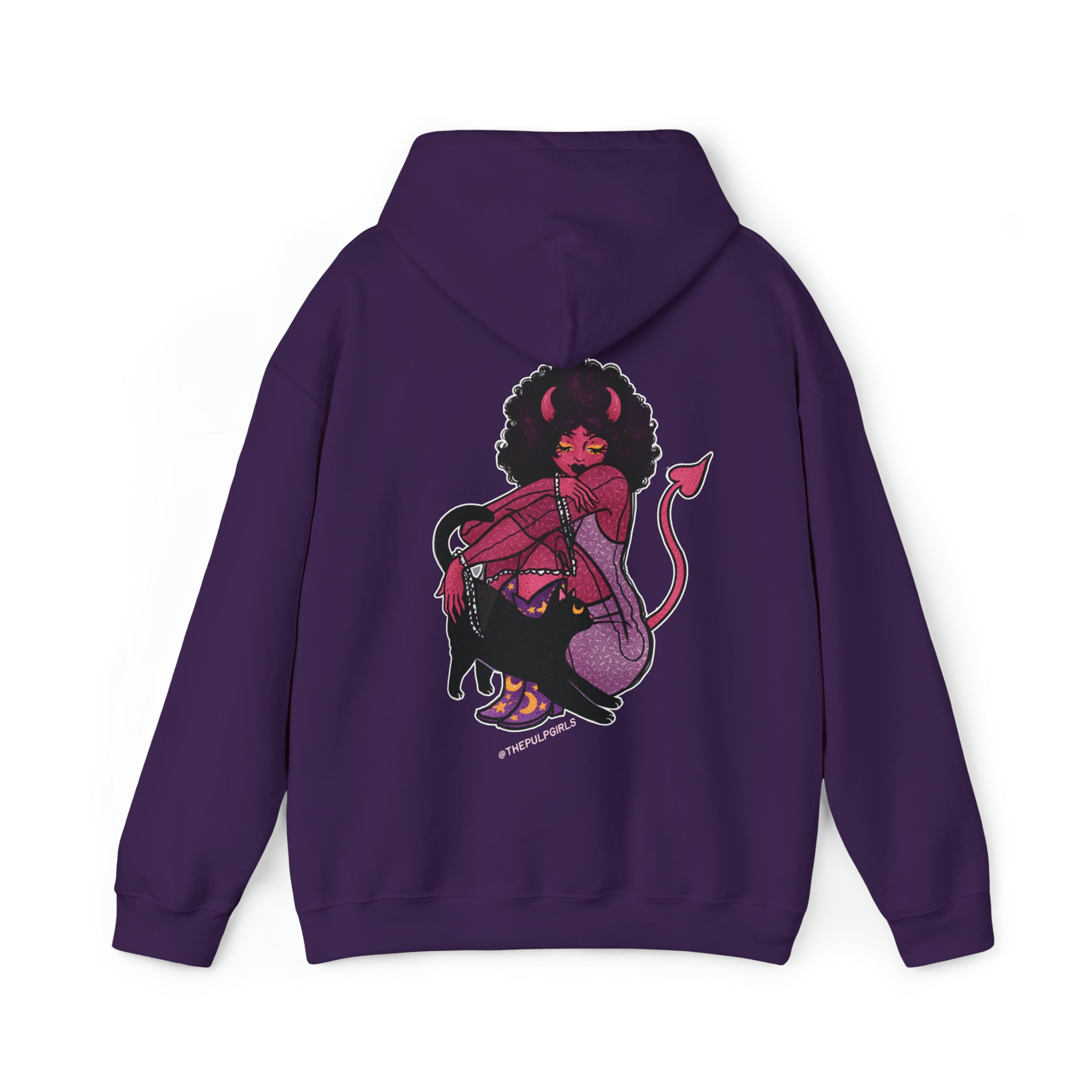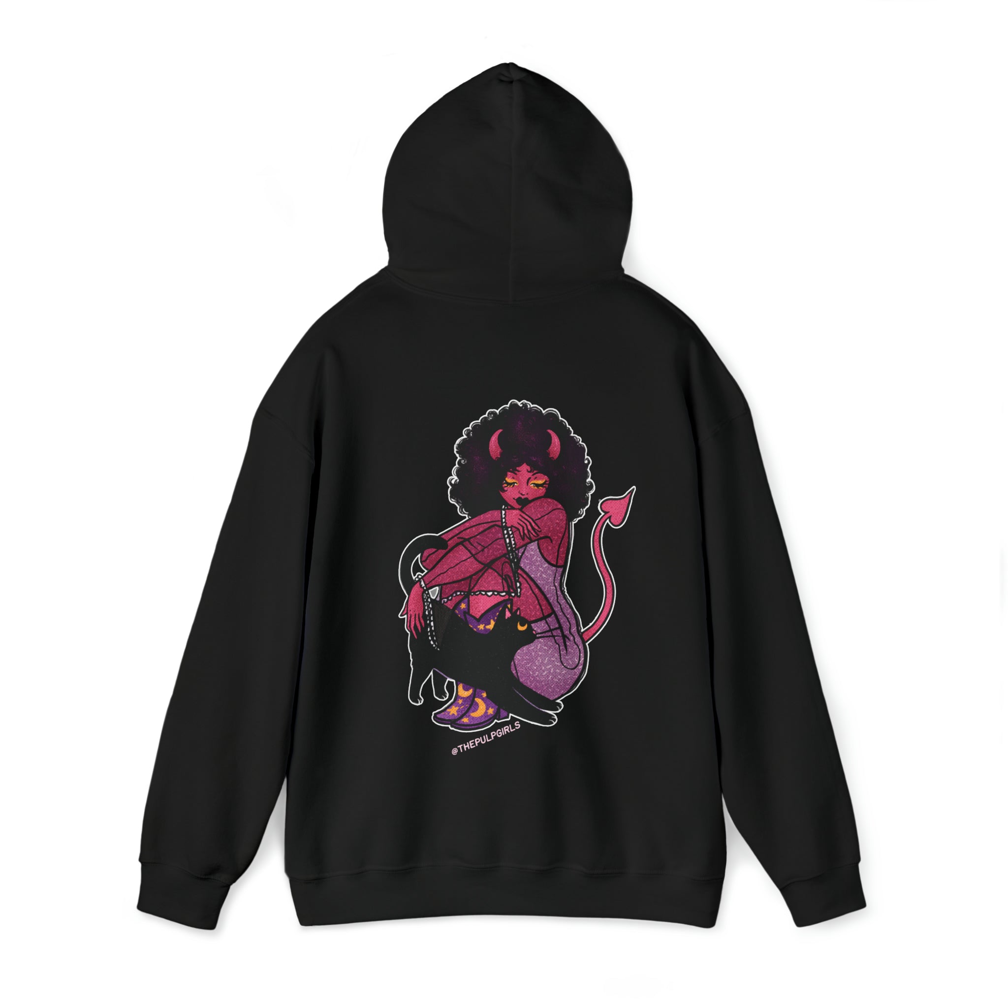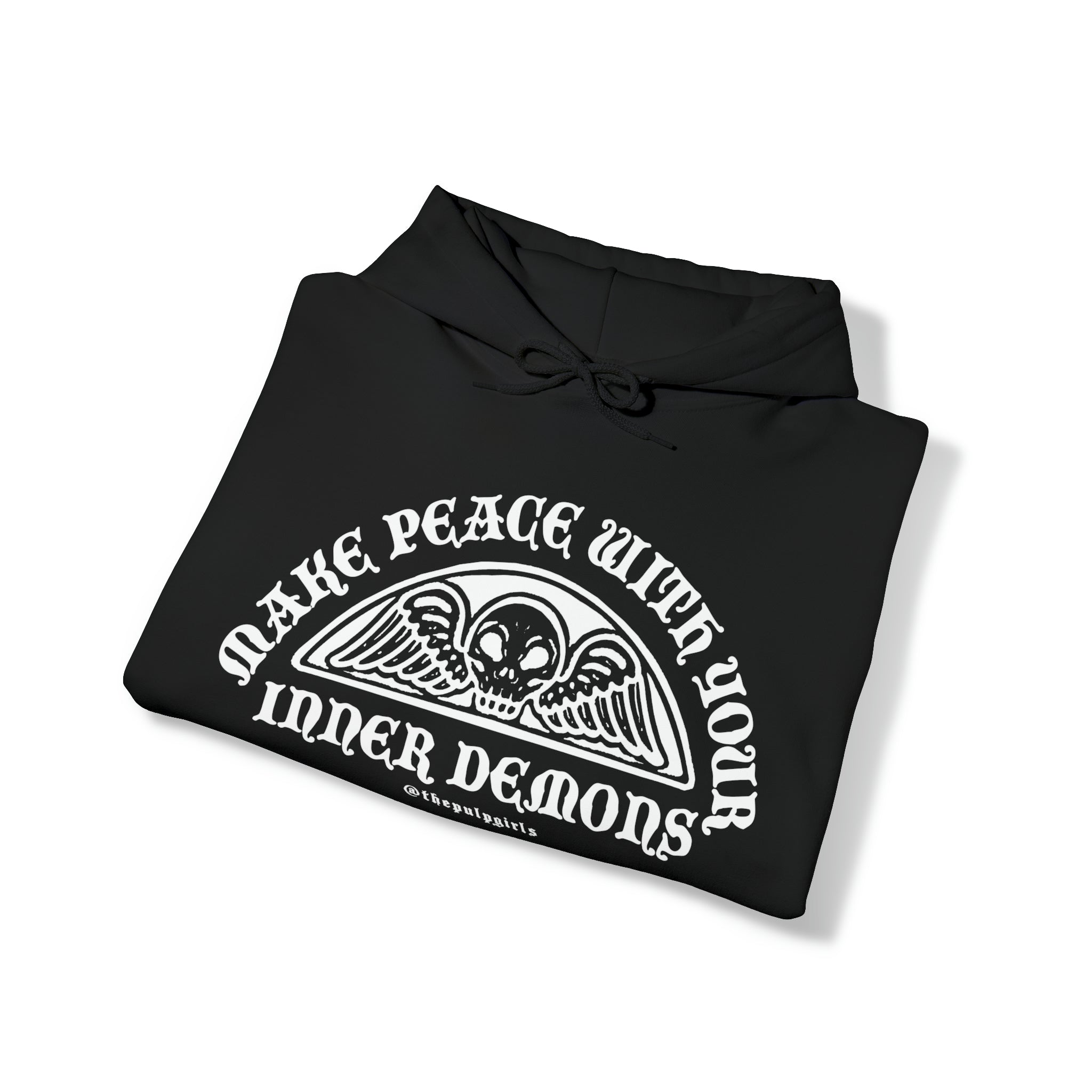Battling some inner demons? 😈 Maybe you can make friends with her instead! These cute lil demon girls are certainly down to just have some fun! Plus, each one has her own little cat familiar as well. Each hoodie features your choice of demon cutie on the back, with a little memento mori gravestone skull on the front along with the words "MAKE PEACE WITH YOUR INNER DEMONS"