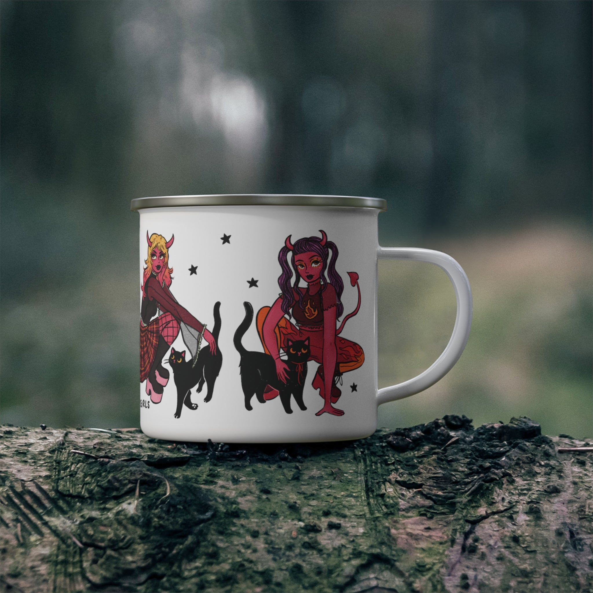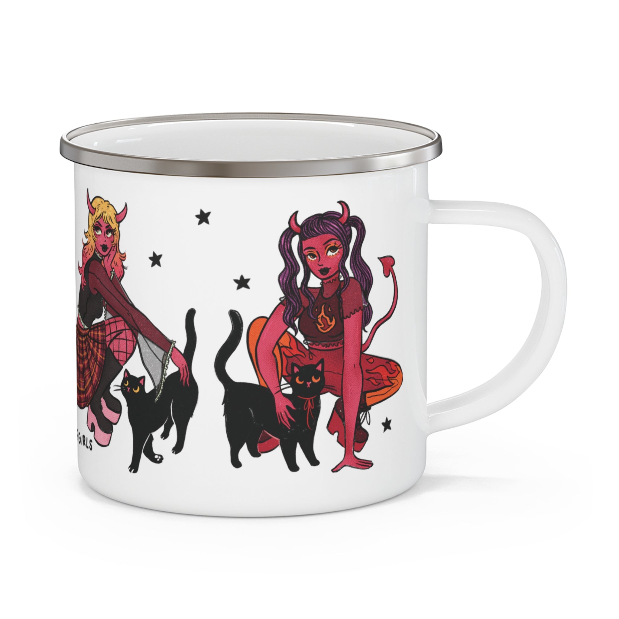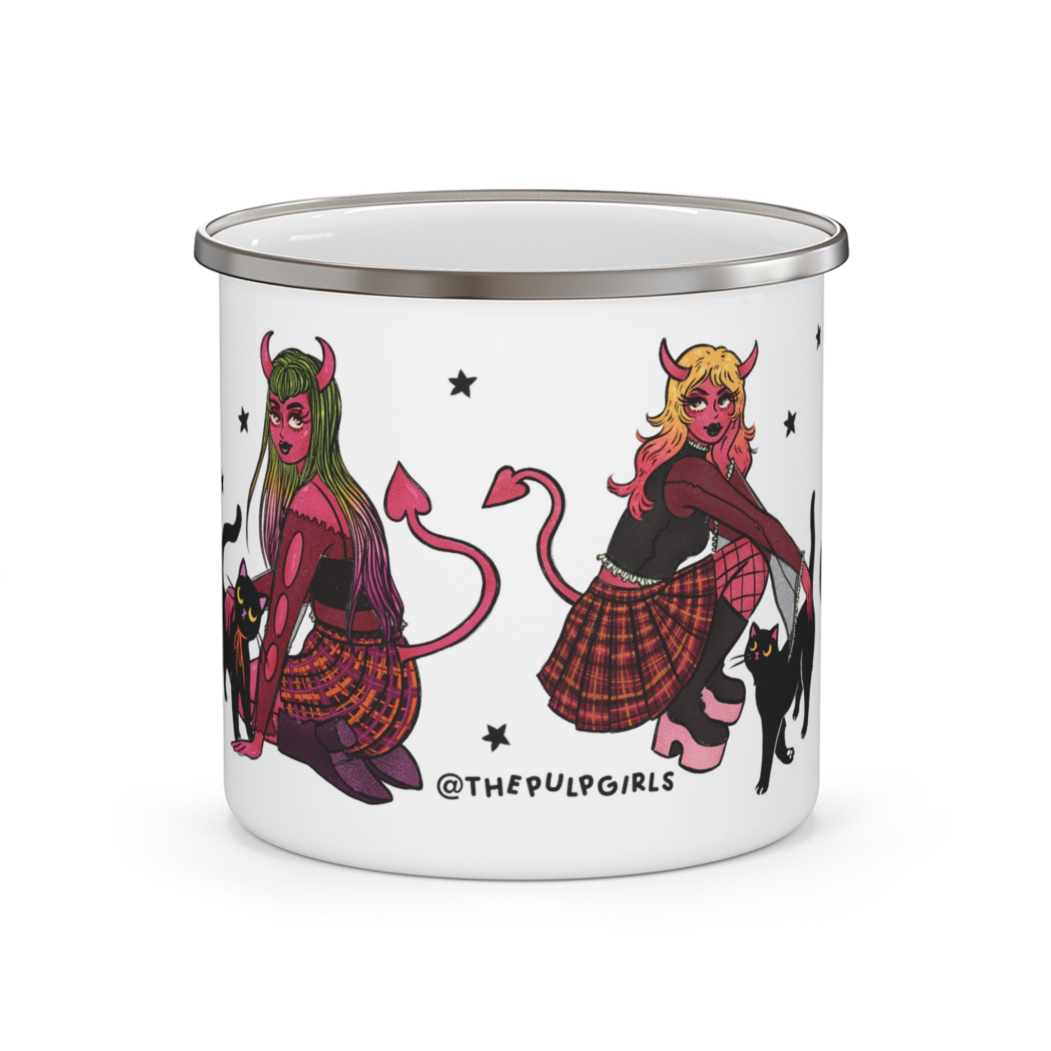 All four cute demon darlings wrap around the surface of this enamel camp mug. Mug is lightweight stainless steel. *NOT microwavable.