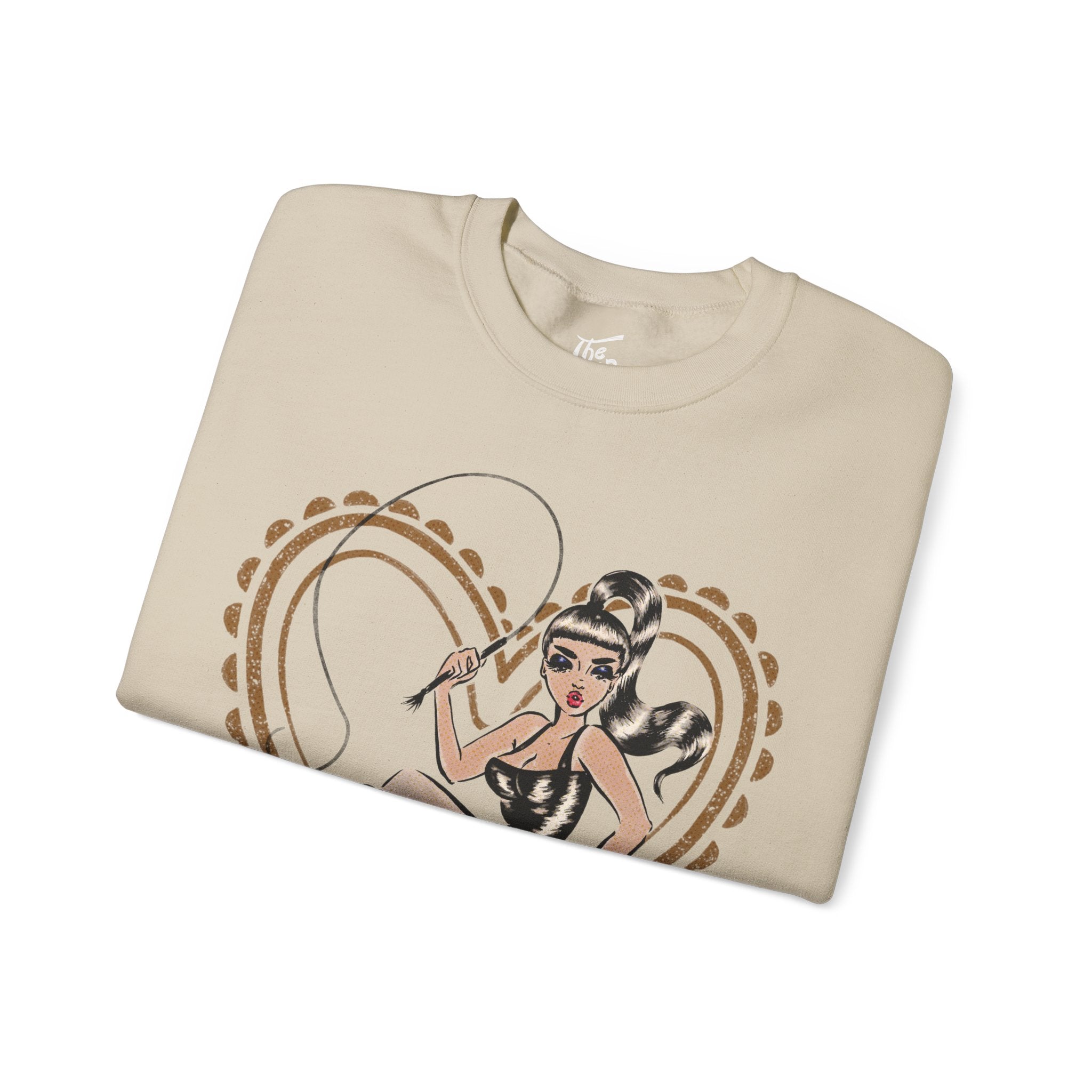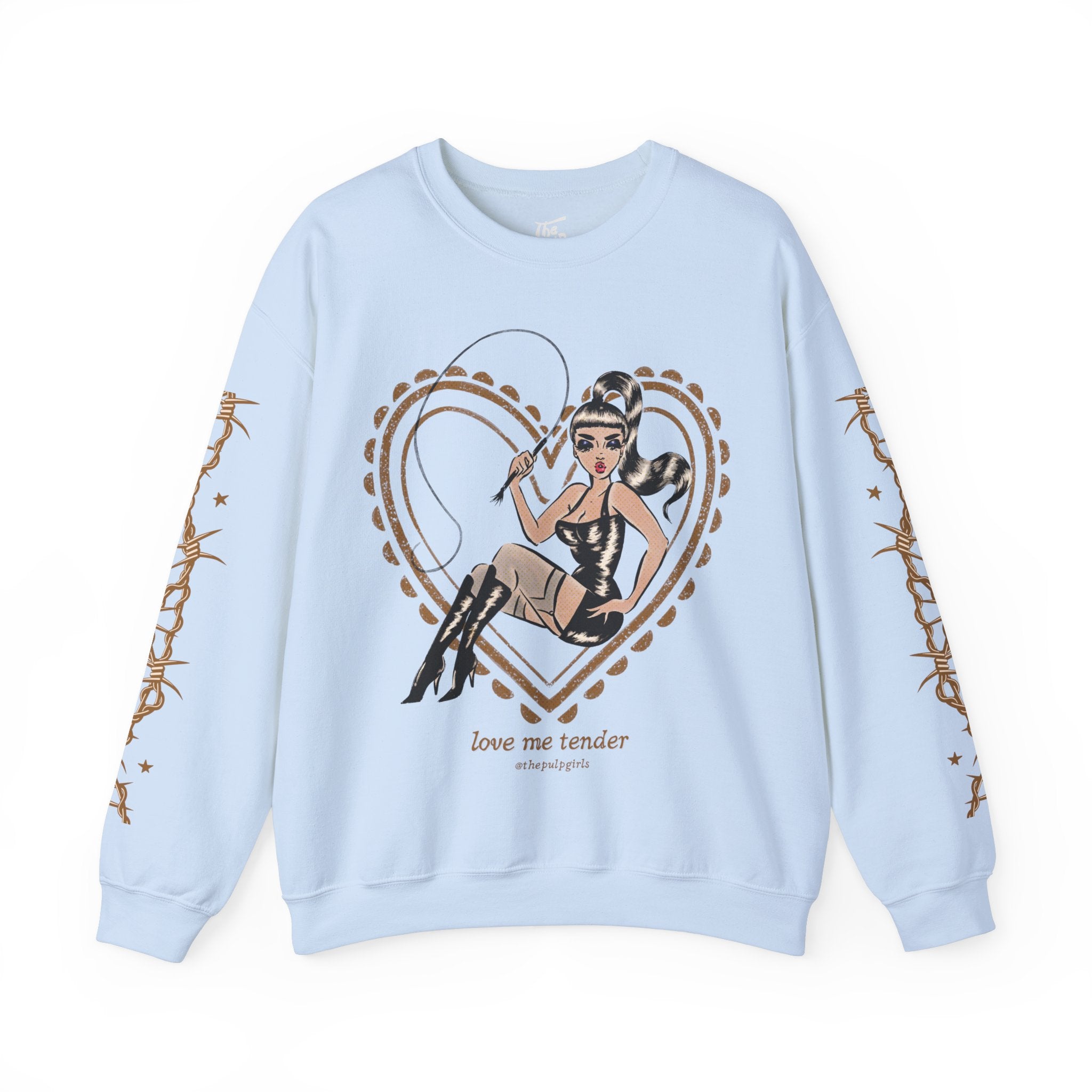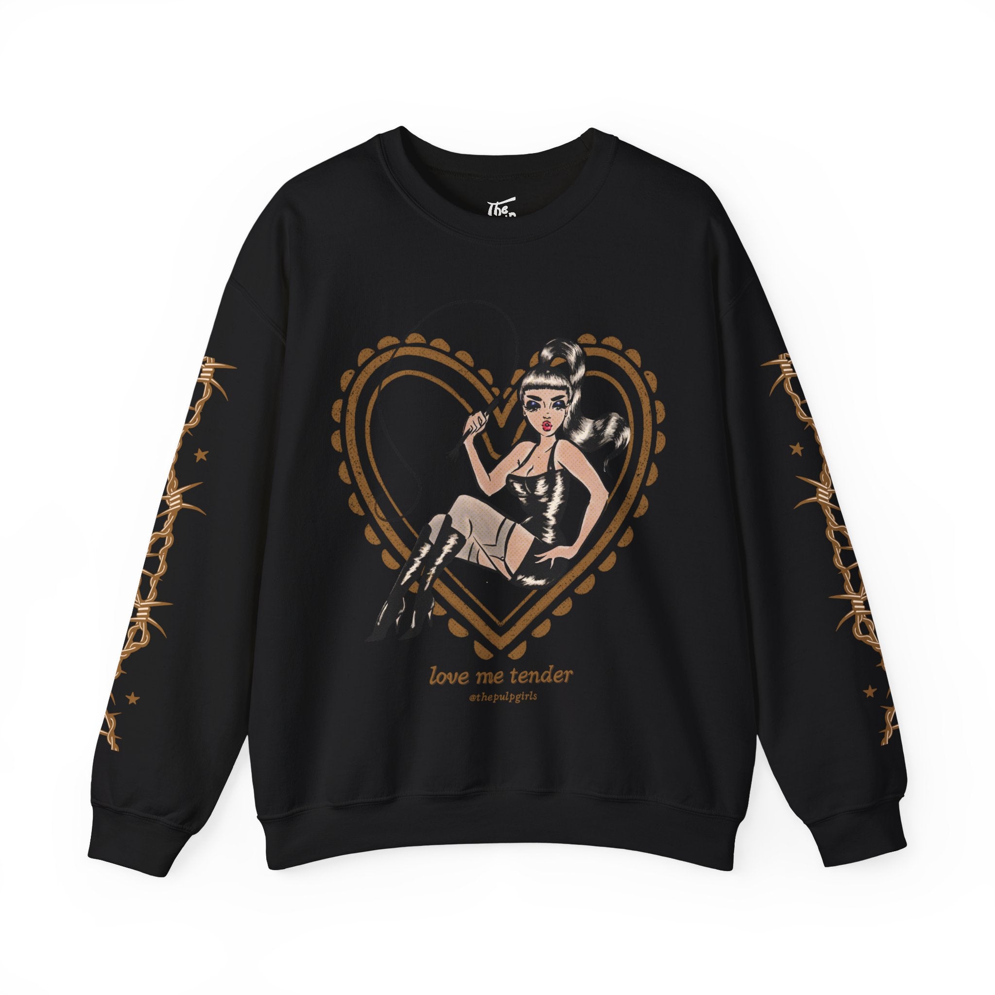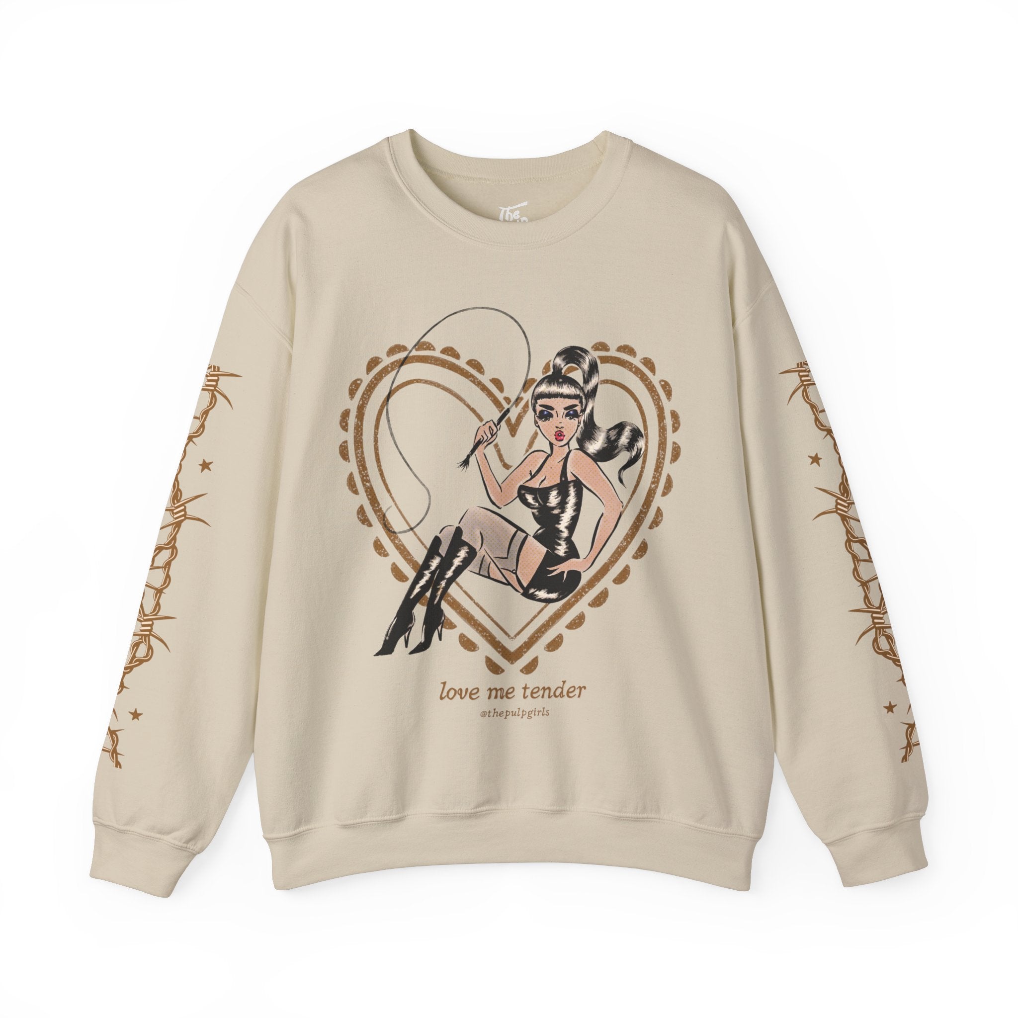 Pin-up lovers, this one is for you! Featuring a lovely, whip-wielding latex cutie and the words "love me tender," this spicy crewneck is guaranteed to turn some heads. Perfect for any and all lovers of the dark feminine, a hint of spice, and crackin' the whip!
