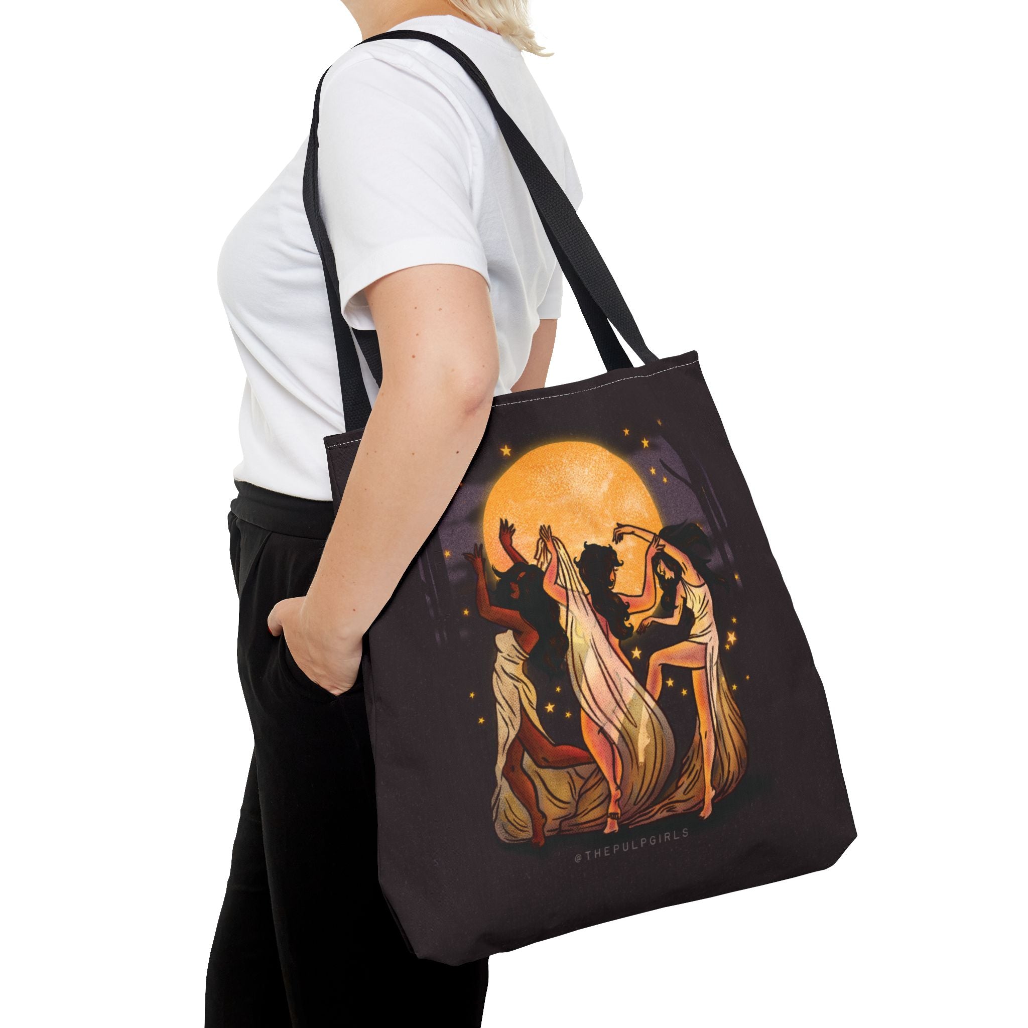 Channel your inner Stevie Nicks with this gorgeous heavy-duty tote bag! Featuring three witchy women dancing with wild abandon in front of the full moon, this carry-all tote is a must-have for all witches, wild women, spooky queens, and your entire coven! 🌝