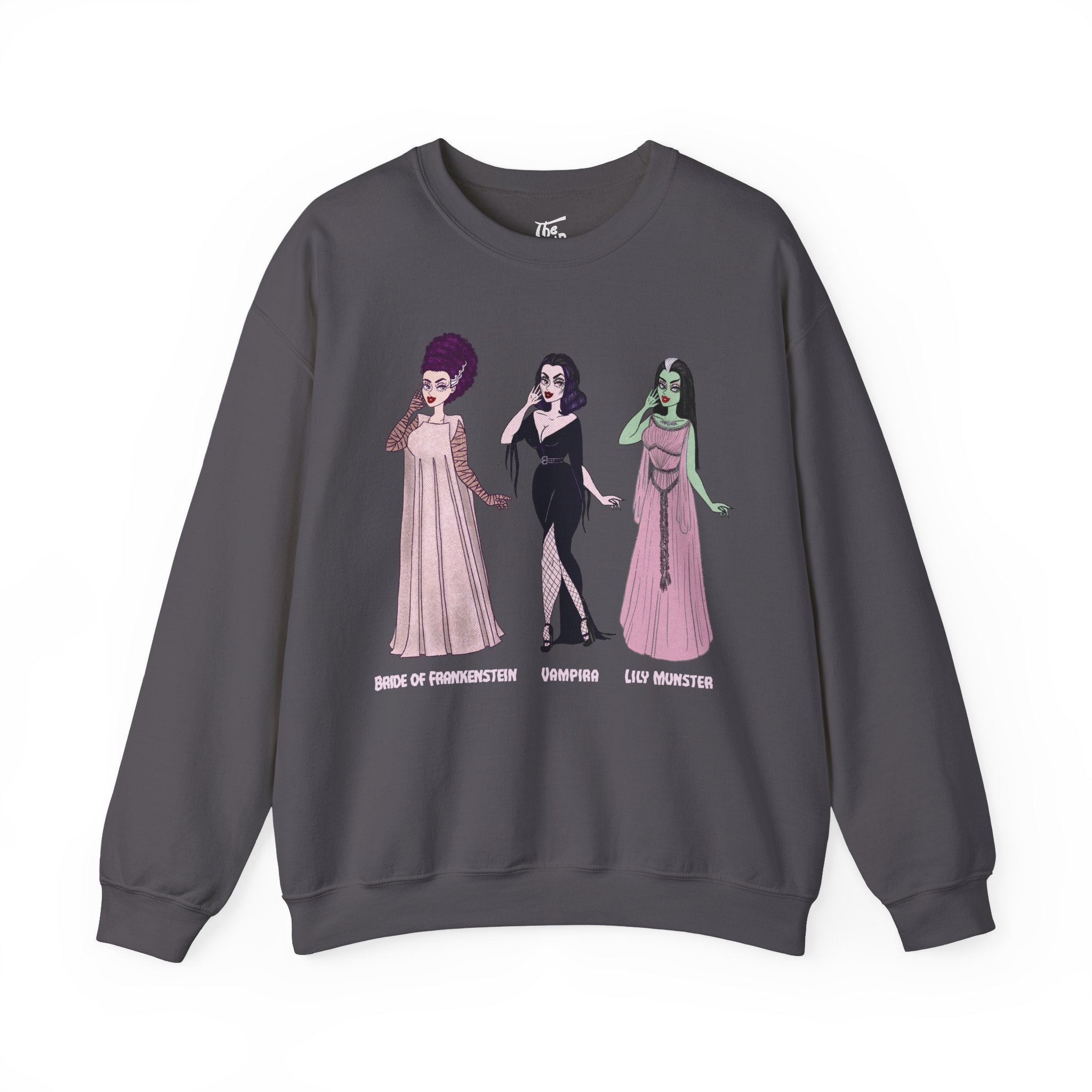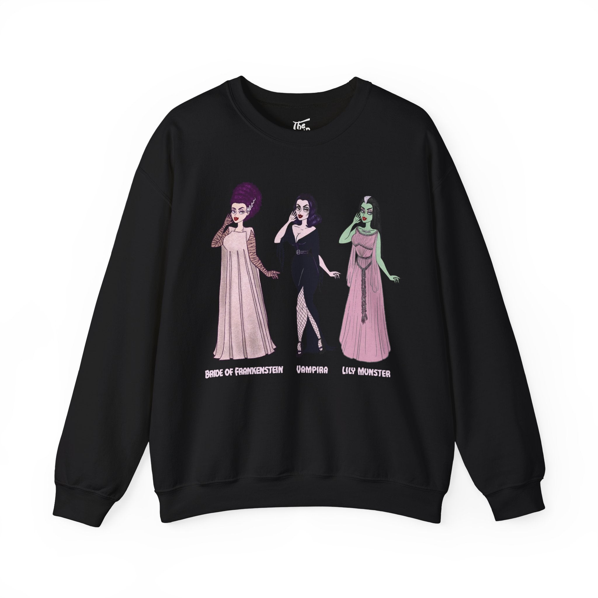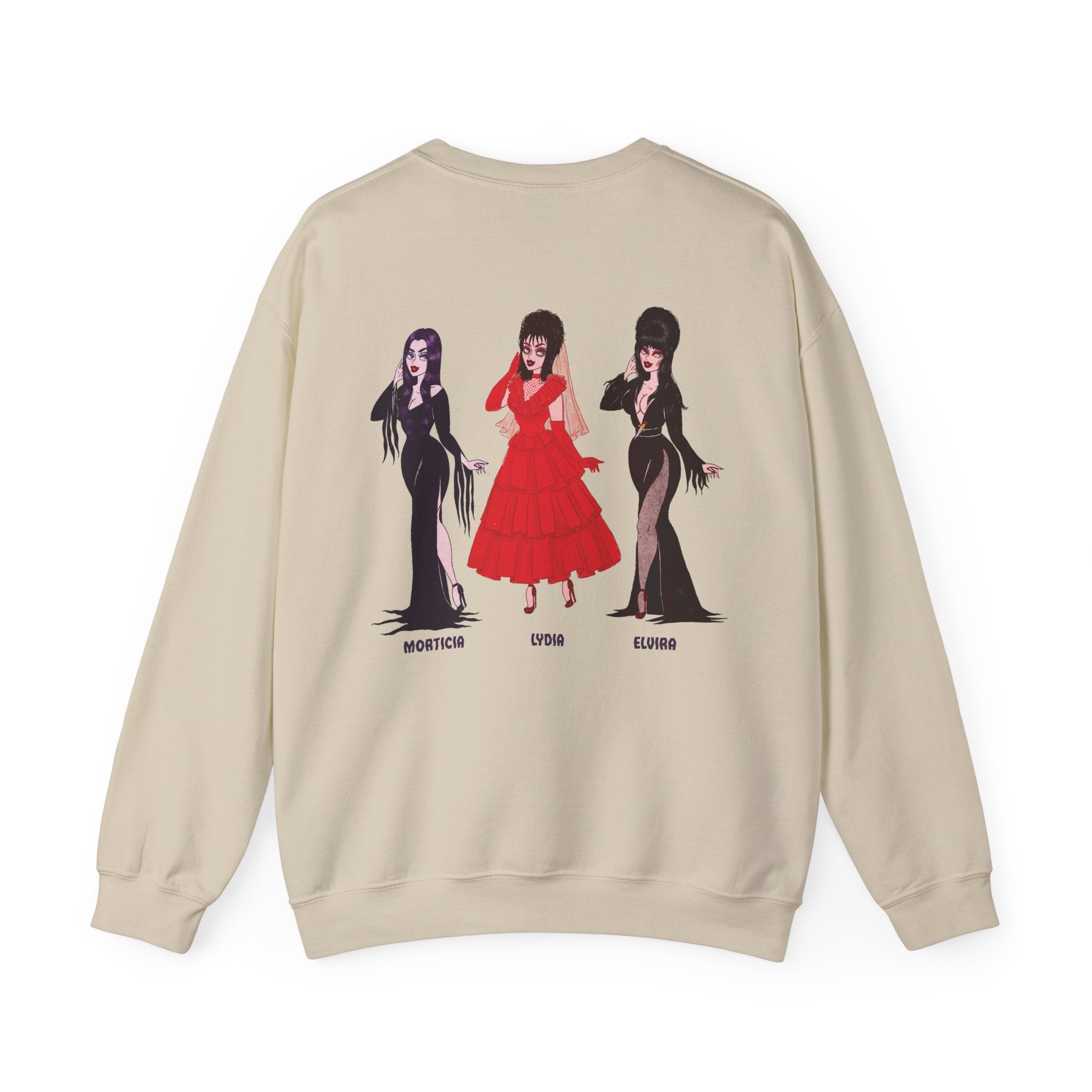 ✨🦇 Spooky Queens are forever! 🦇✨ This Vintage Classics listing features: Bride of Frankenstein, Vampira, Lily Munster, Morticia, Lydia Deetz, and Elvira 🐈⬛ This ultra comfy crewneck sweatshirt is perfect for anyone who loves Halloween, vampires, scream queens, and just all things witchy!