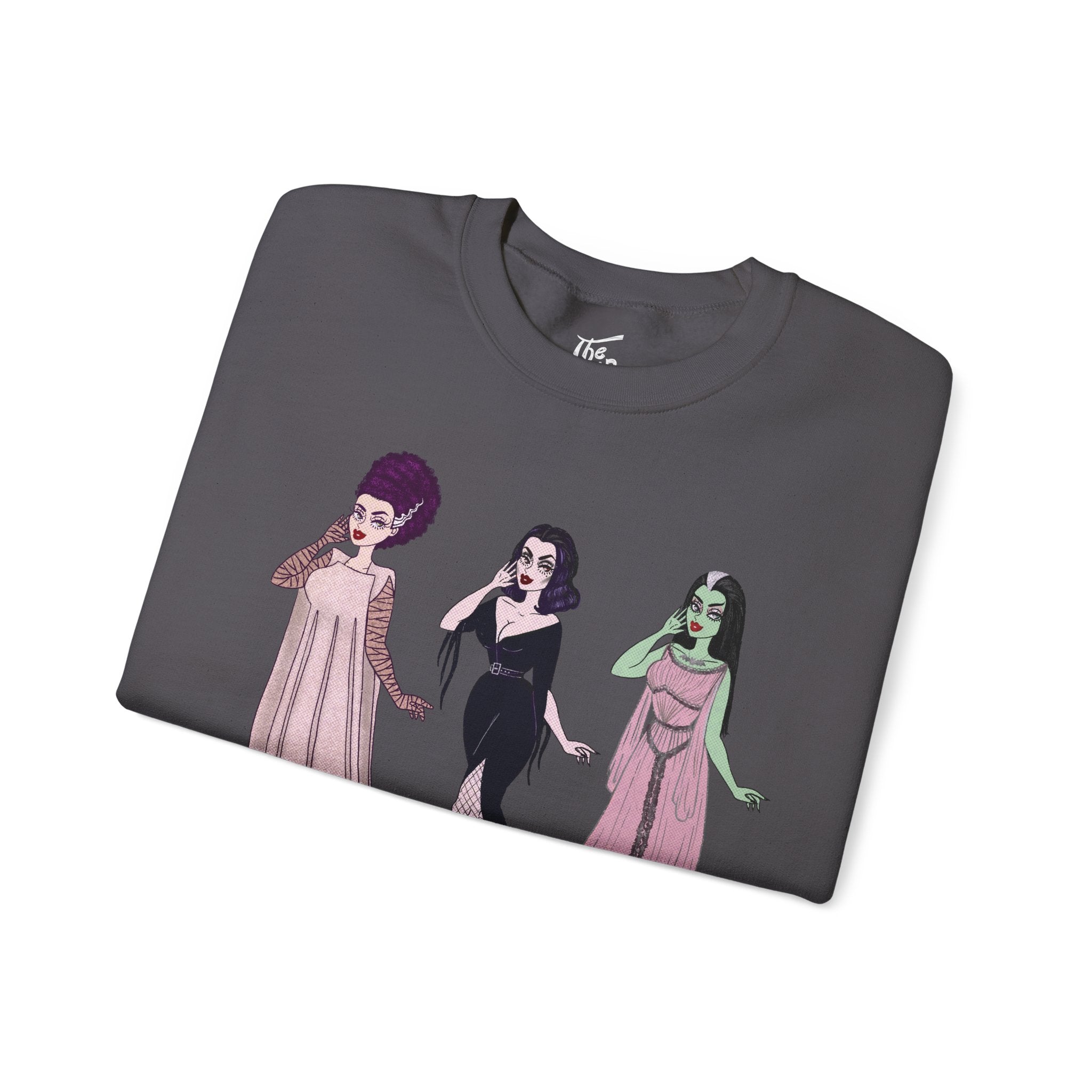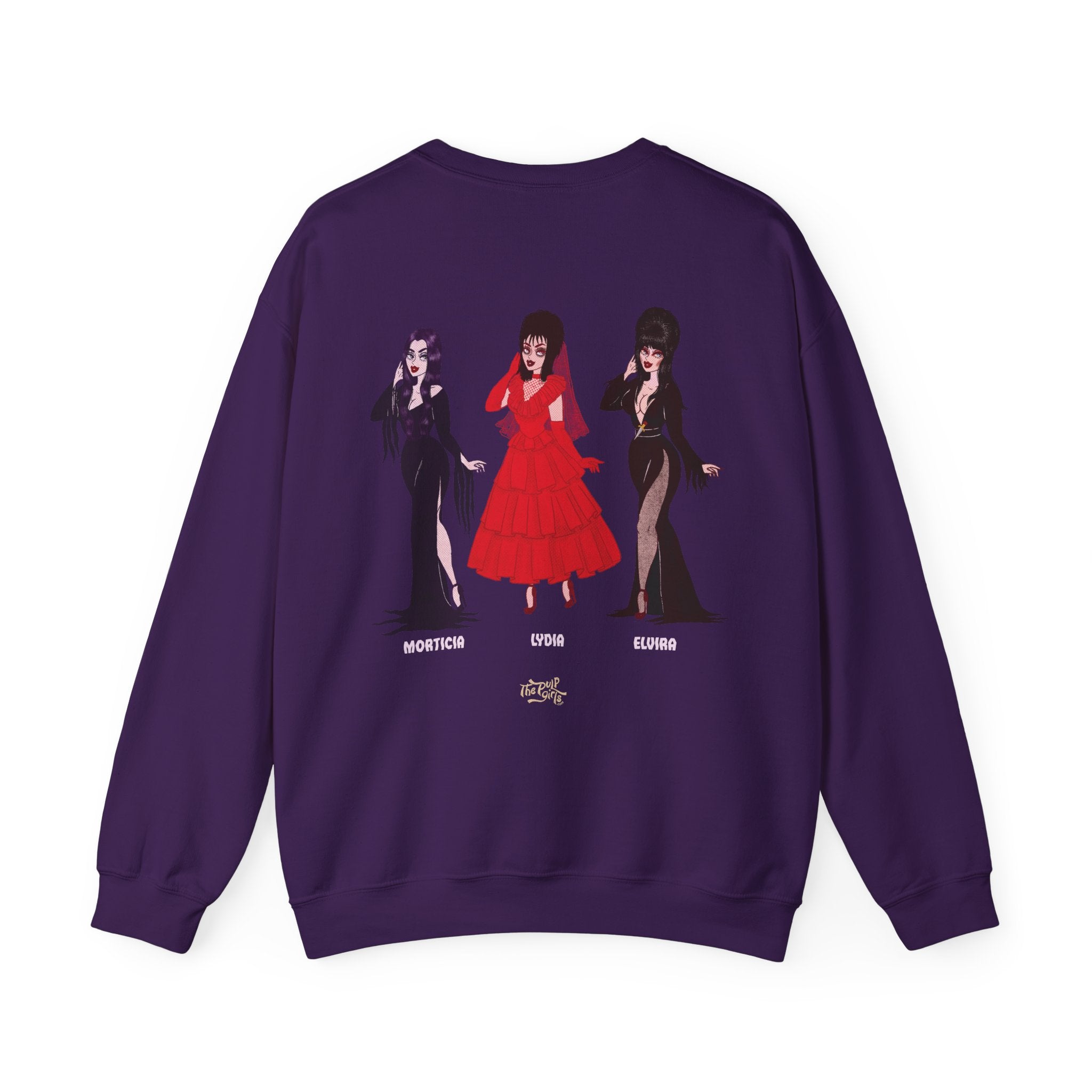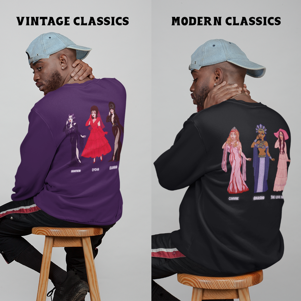 ✨🦇 Spooky Queens are forever! 🦇✨ This Vintage Classics listing features: Bride of Frankenstein, Vampira, Lily Munster, Morticia, Lydia Deetz, and Elvira 🐈⬛ This ultra comfy crewneck sweatshirt is perfect for anyone who loves Halloween, vampires, scream queens, and just all things witchy!