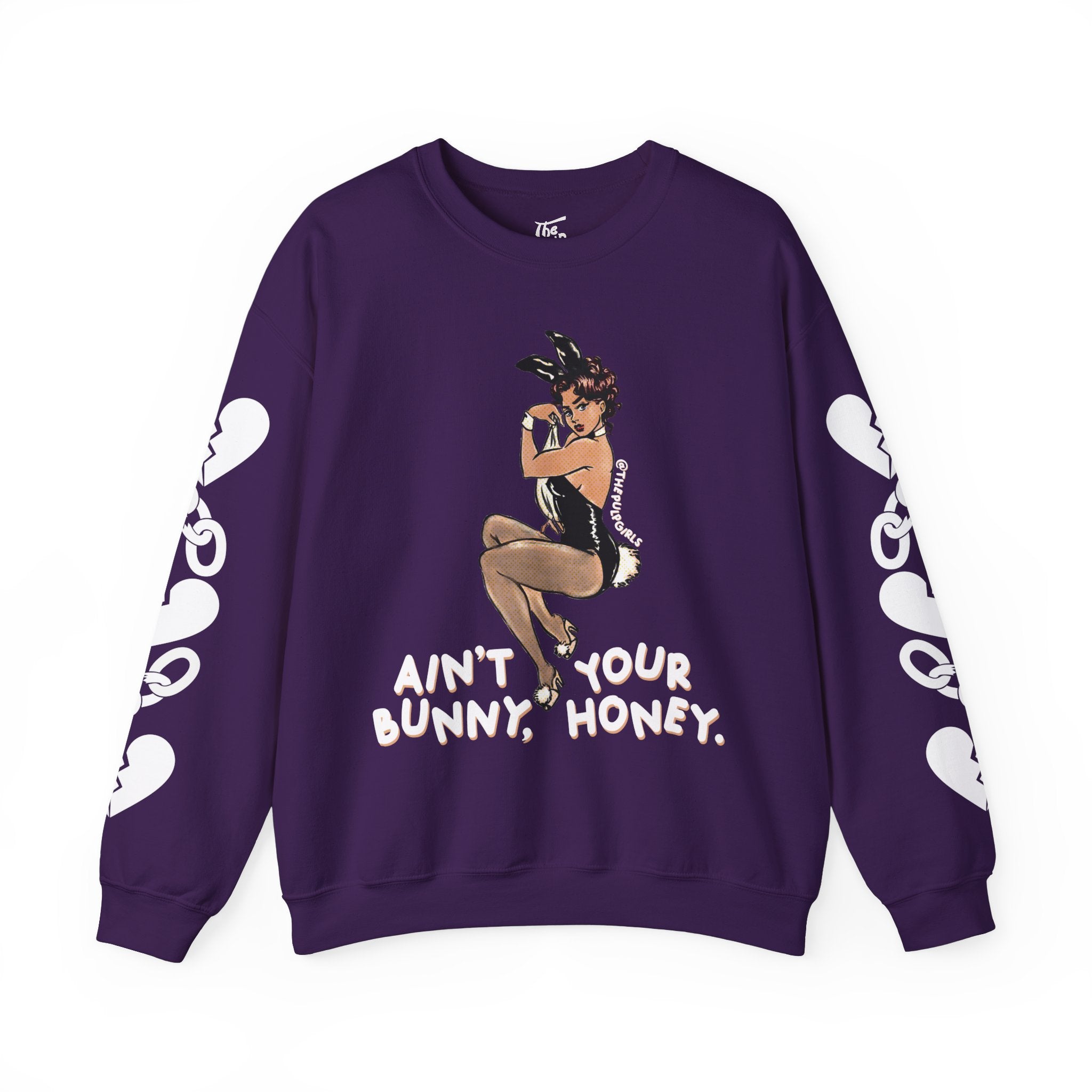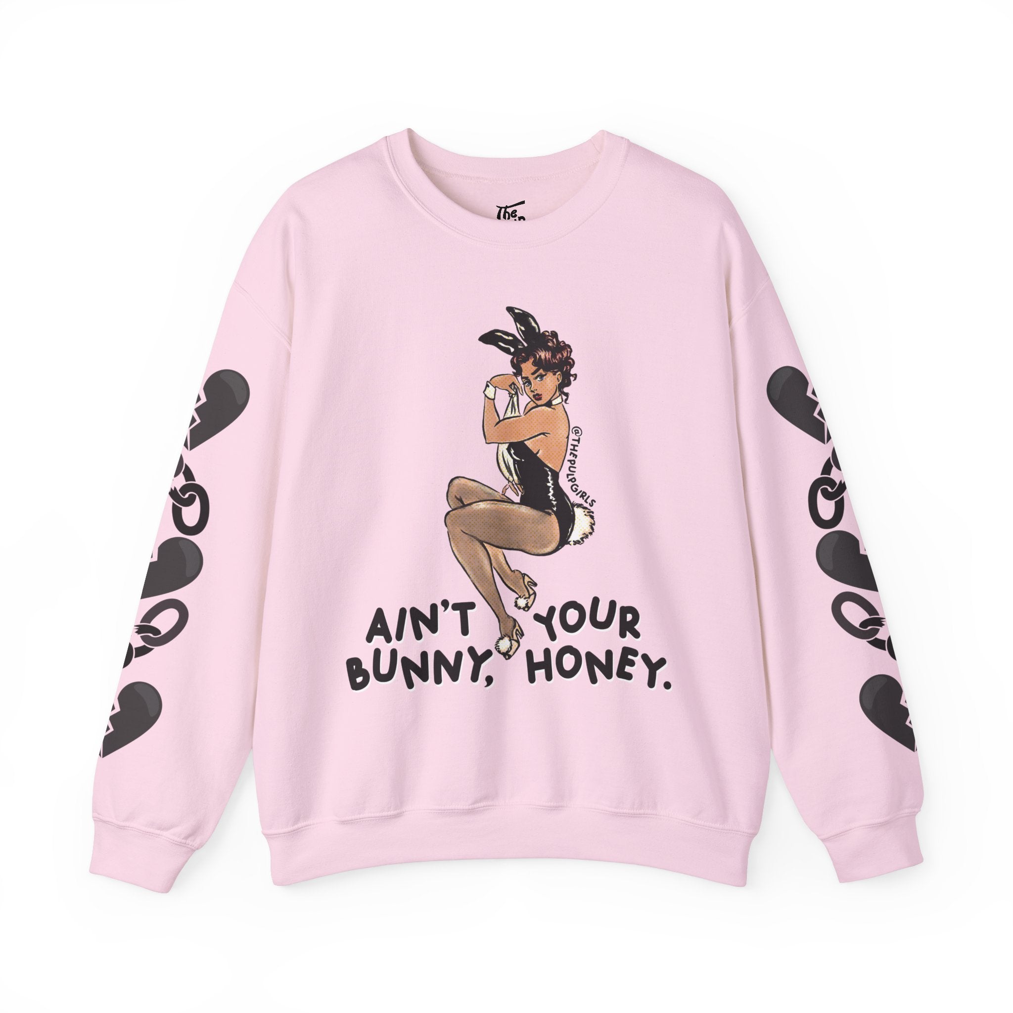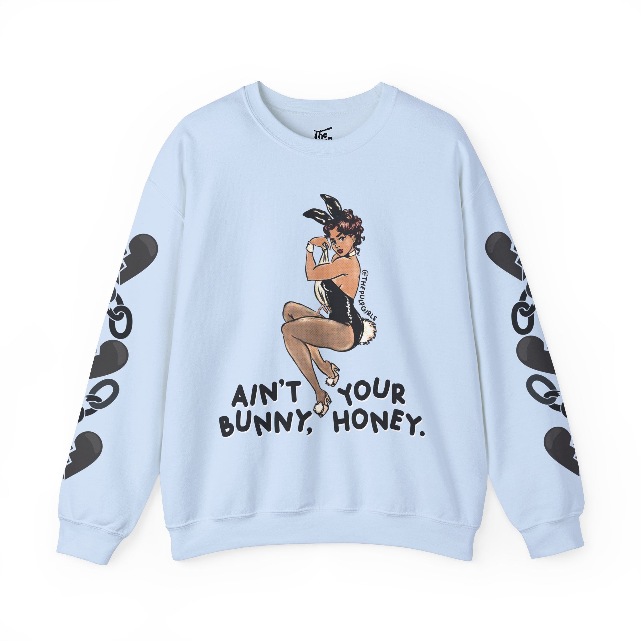 Pin-up lovers, this one is for you! Featuring a classic Playboy bunny cutie and the words "ain't your bunny, honey." Get adorable in this comfy crewneck sweatshirt and proclaim your bad babe pride! Perfect for any and all lovers of the dark feminine, a hint of spice, and vintage pin-up vibes!