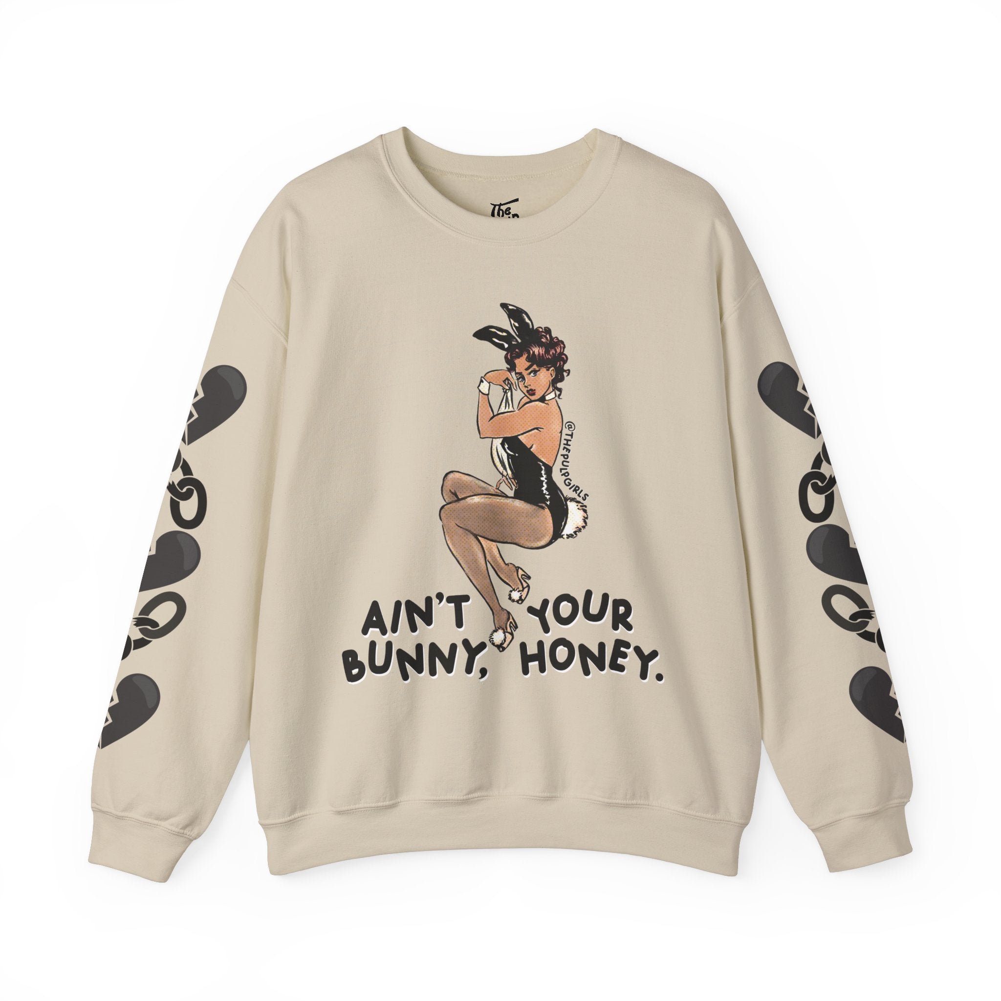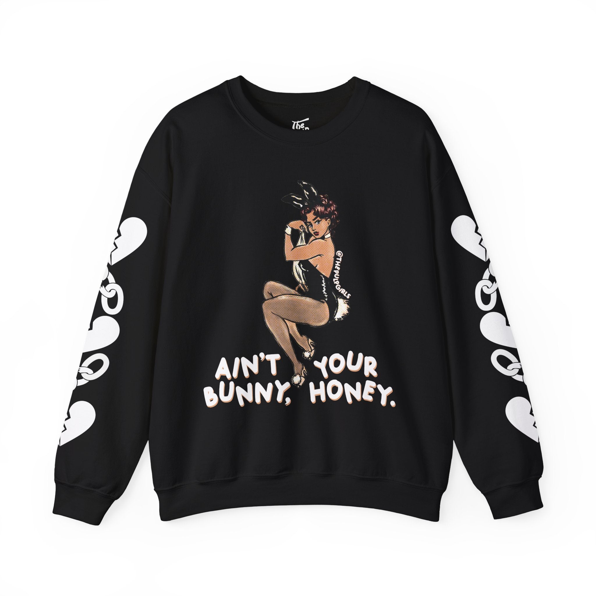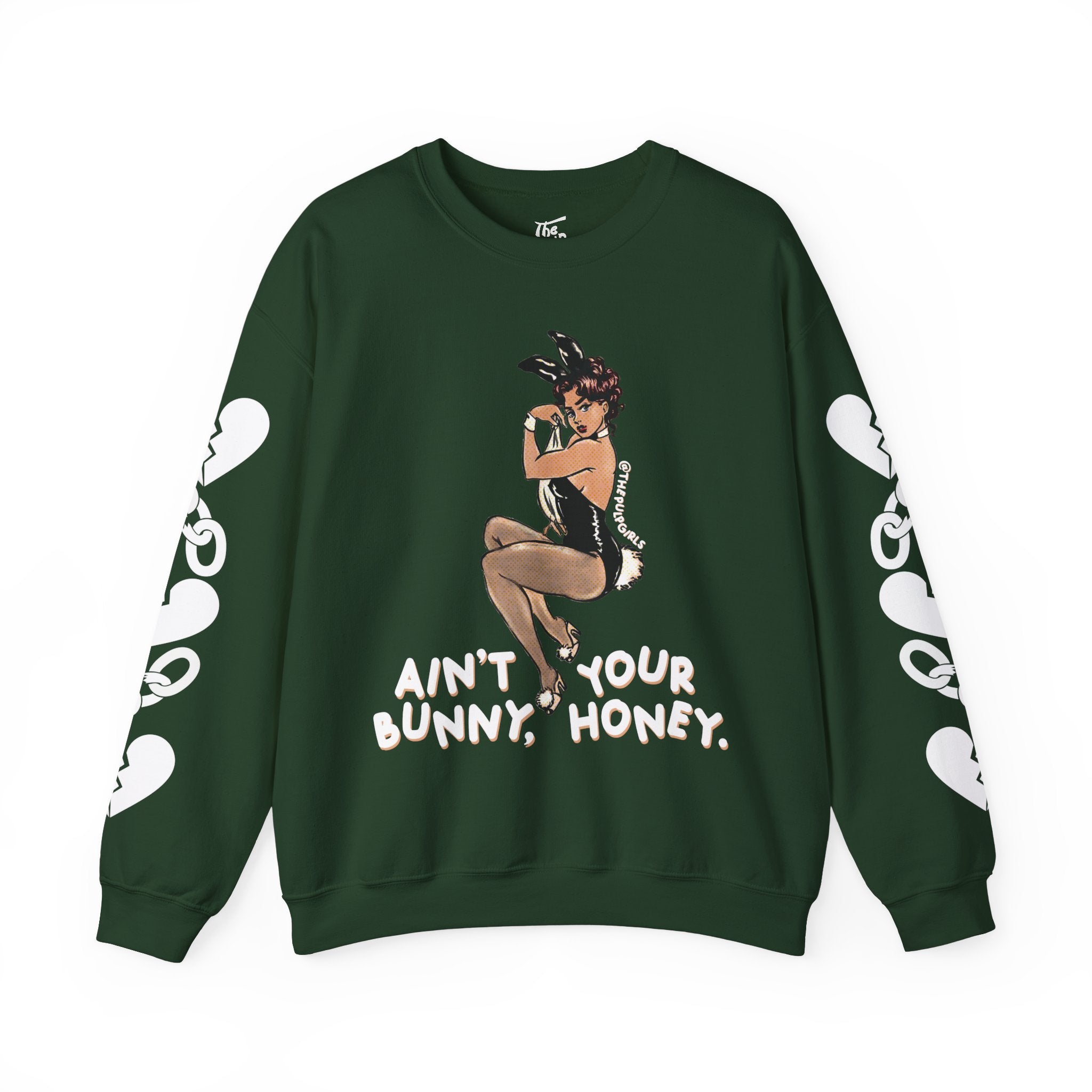 Pin-up lovers, this one is for you! Featuring a classic Playboy bunny cutie and the words "ain't your bunny, honey." Get adorable in this comfy crewneck sweatshirt and proclaim your bad babe pride! Perfect for any and all lovers of the dark feminine, a hint of spice, and vintage pin-up vibes!