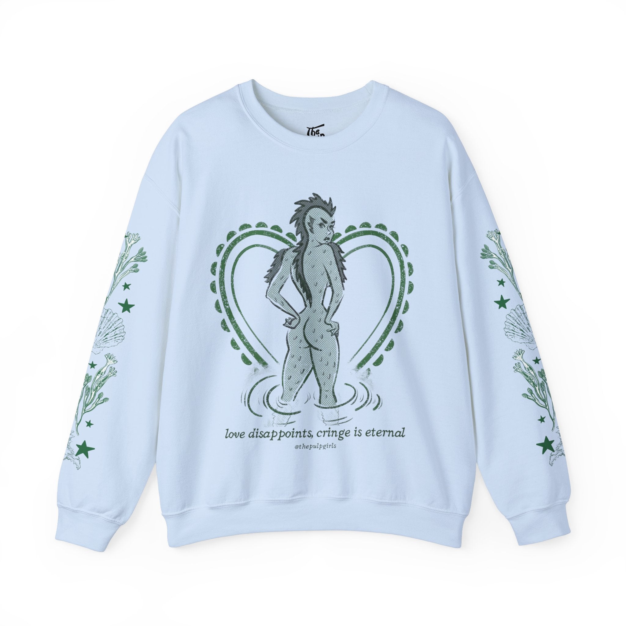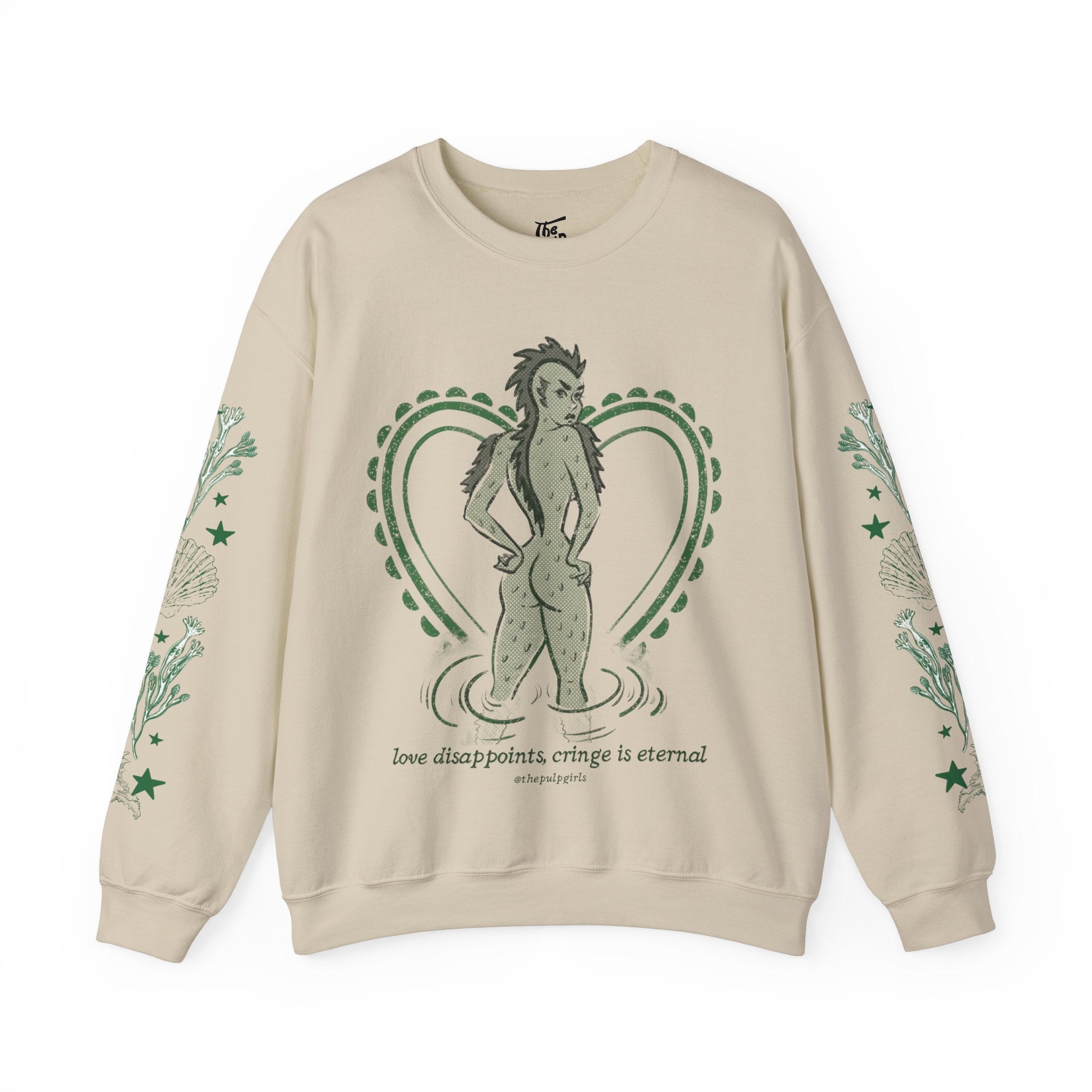 Pin-up lovers, this one is for you! Featuring a done-with-it-all, sea monster and the words "love disappoints, cringe is eternal" this spicy crewneck is guaranteed to turn some heads. Perfect for any and all lovers of the cute cryptids, a hint of spice, and letting that cringe flag fly high!