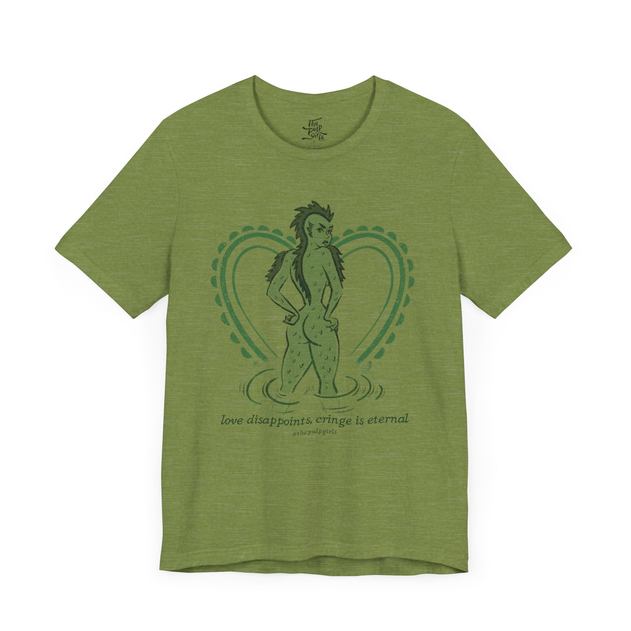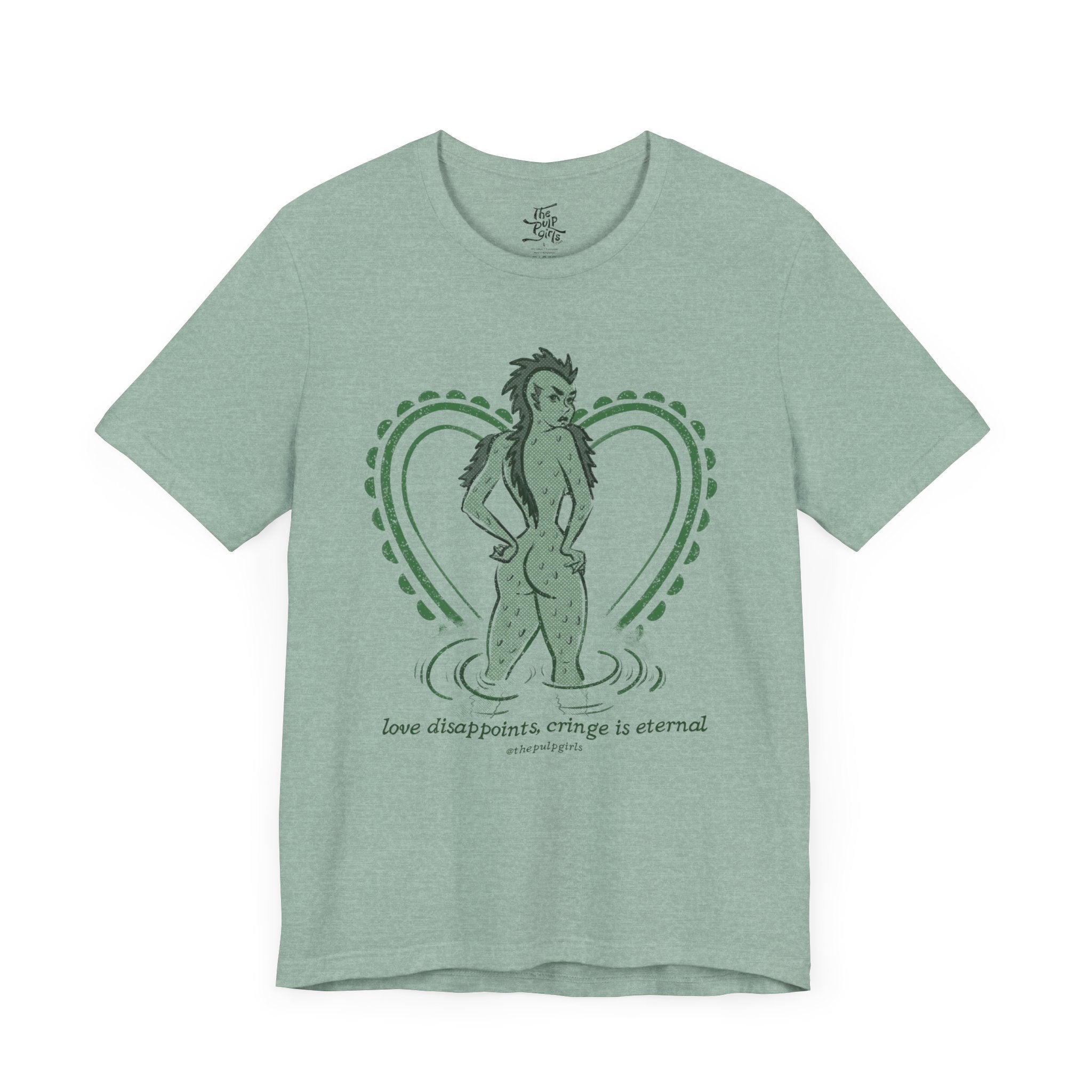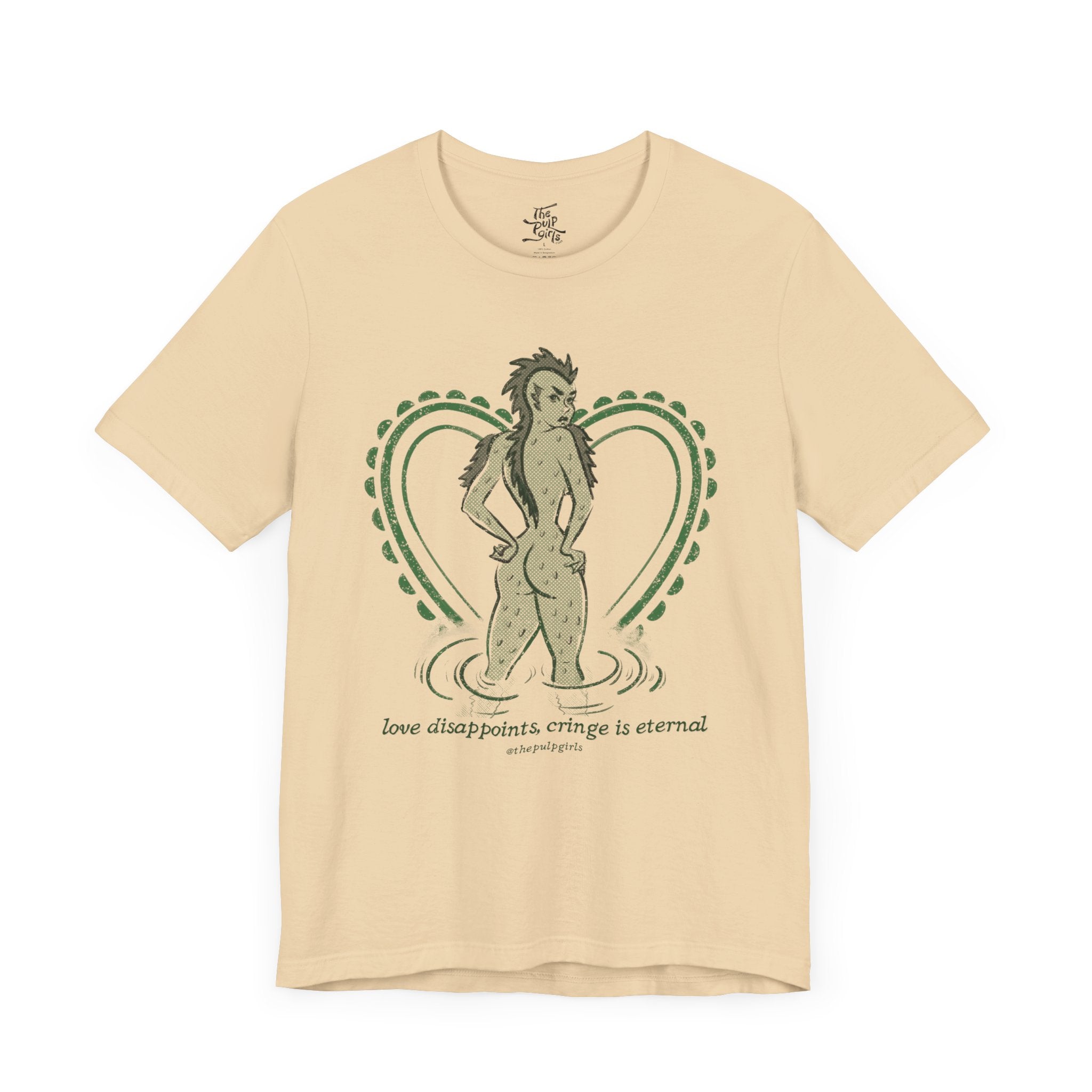 Pin-up lovers, this one is for you! Featuring a lovely sea monster cutie and the words "love disappoints, cringe is eternal," this ultra soft tee is guaranteed to turn some heads. Perfect for any and all lovers of the dark feminine, a hint of spice, and sea creatures!