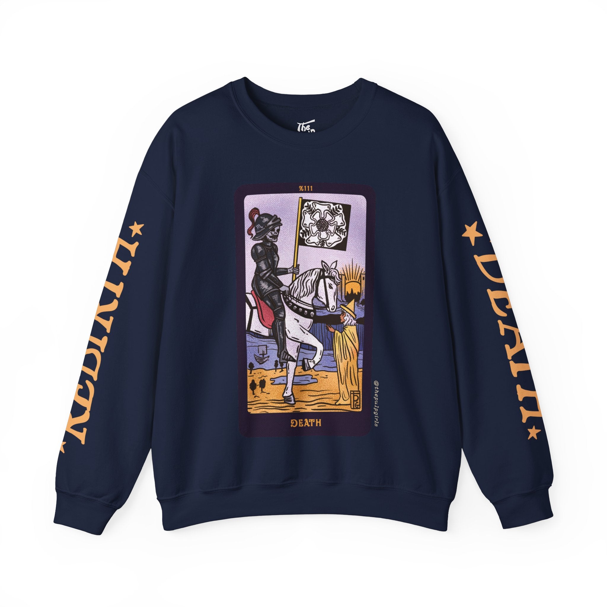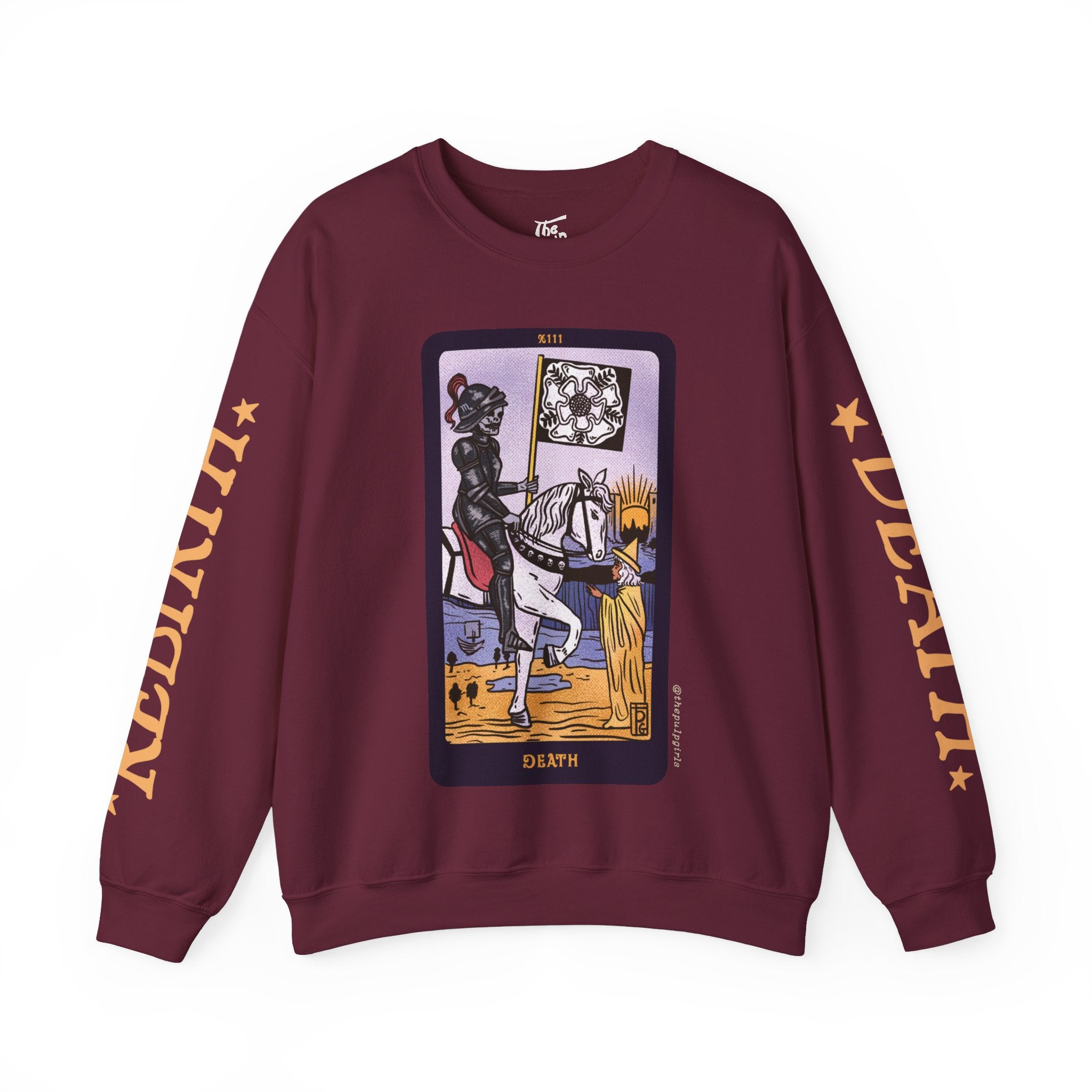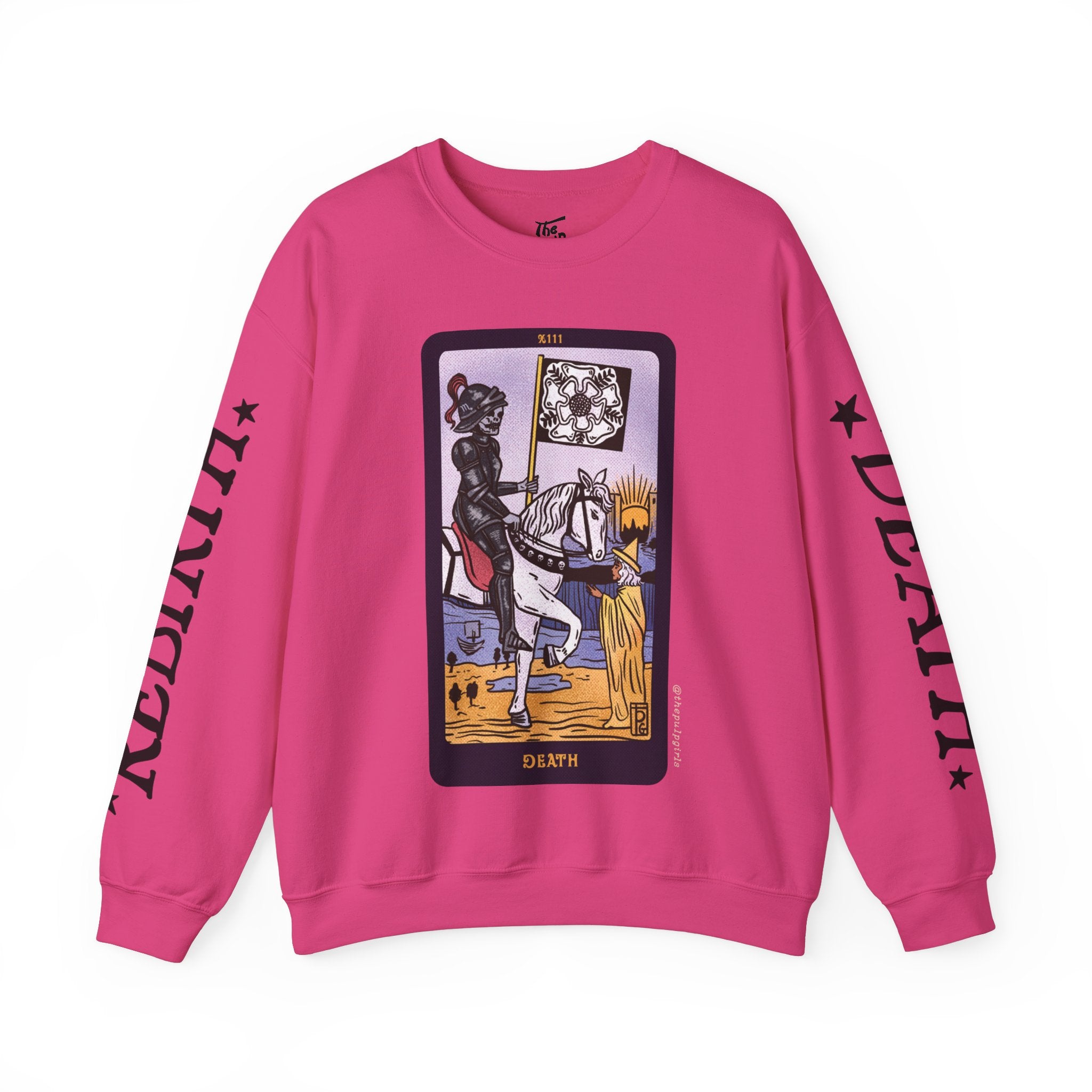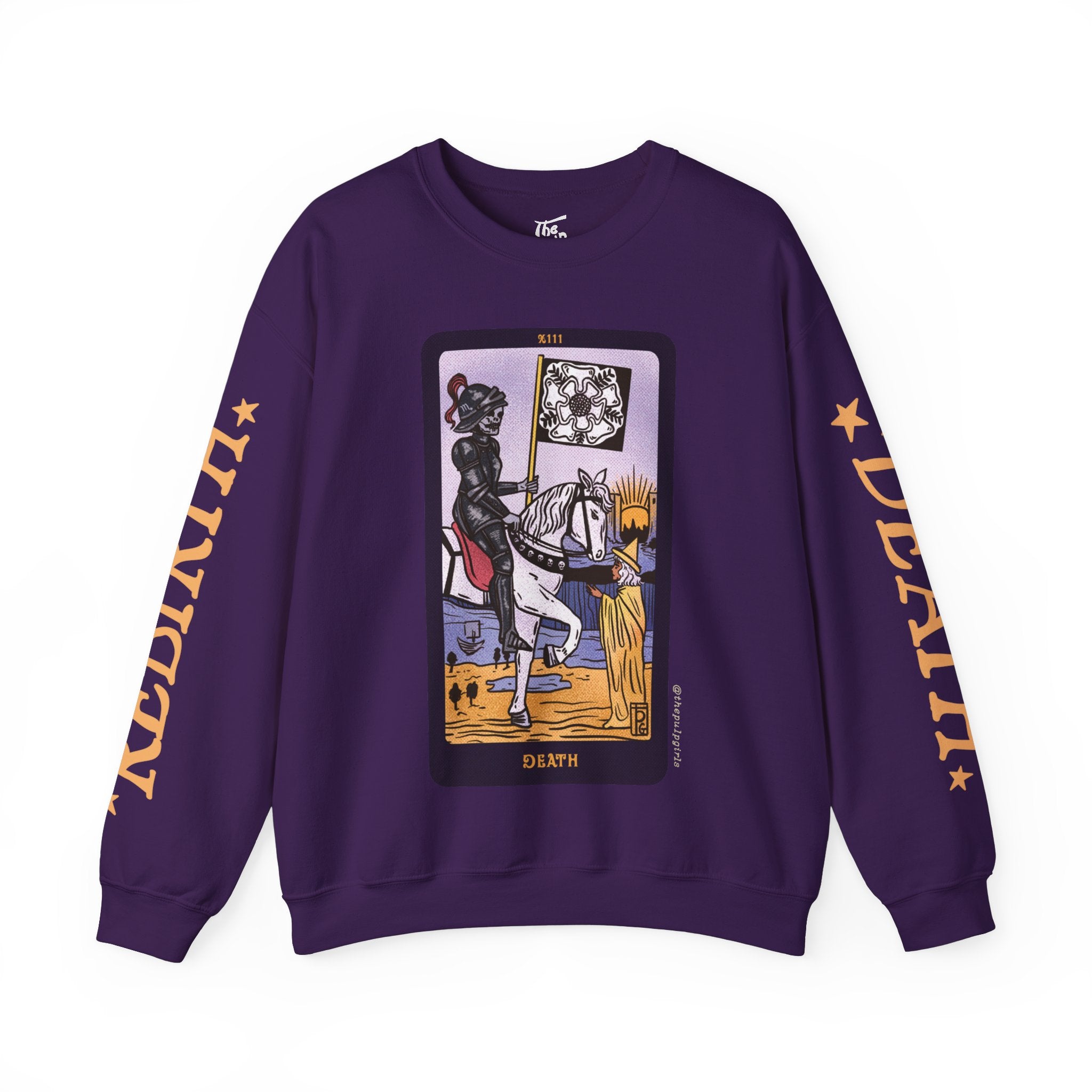 Featuring the major arcana Death card from our incredibly popular The Pulp Girls Tarot Deck, this crewneck sweatshirt is sure to turn heads! One of the most feared (and misunderstood) cards in the deck, Death isn't automatically a portent of doom. Think of it more as a card of change. See the city with the sun rising over it on the horizon? Even when one thing ends, something new begins. This card is all about cycles, rebirths, and transitions, all of which are actually essential for thriving. One sleeve reads DEATH, while the other reads REBIRTH, a reminder that there are two sides to each coin.