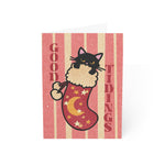 Spread some holiday cheer with this cute cat greeting card! The front features a retro-inspired black cat hiding in a stocking and the words Good Tidings, while the inside reads "May this season be full of light and laughter." Perfect for sending warm wishes to friends and family during the holiday season. Ideal for cat lovers and those who appreciate vintage-inspired designs.