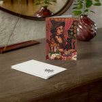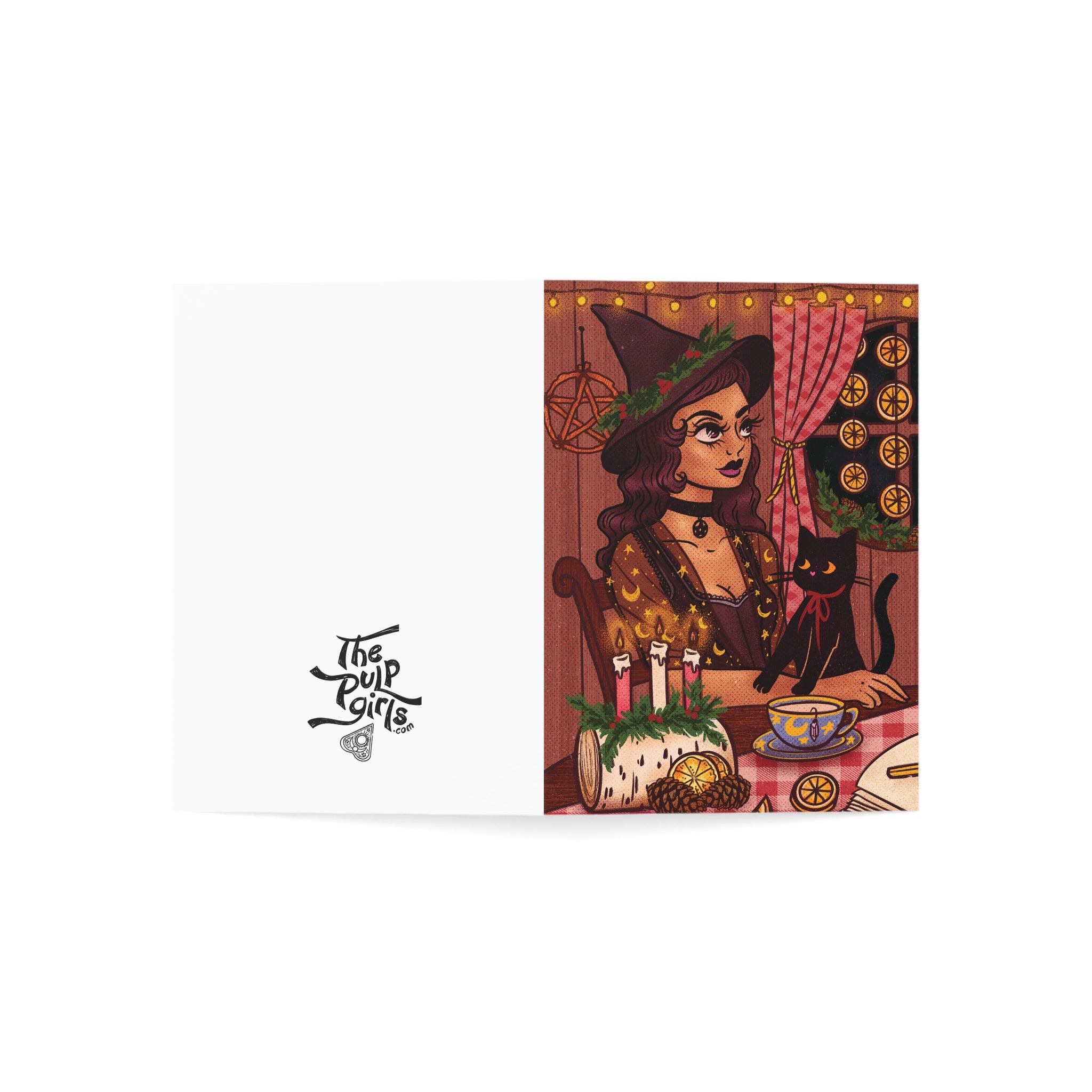 Blessed be! Spread some light during the darkest night with this witchy card! The front features a gorgeous Pulp illustration of a baddie witch and her black cat friend, drinking tea in a beautifully decorated space (complete with the Yule log)! Blank inside. Perfect for sending warm wishes to friends and family during the holiday season. Ideal for witchy folks, cat lovers, and those who appreciate a cozy cottage vibe!