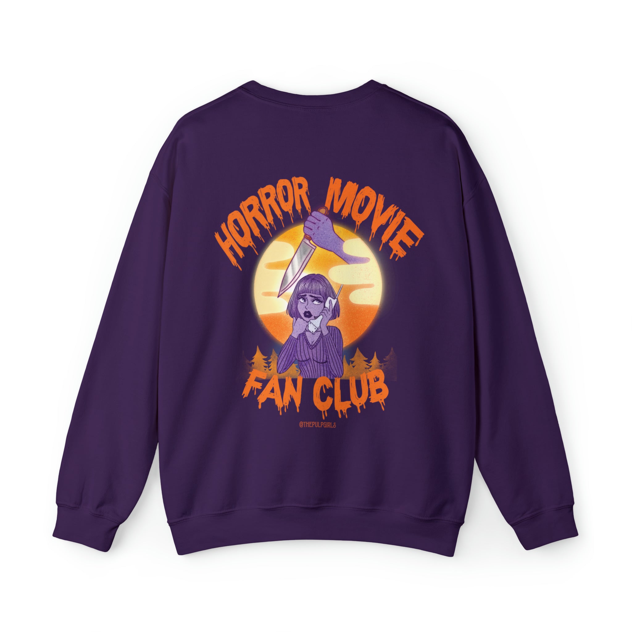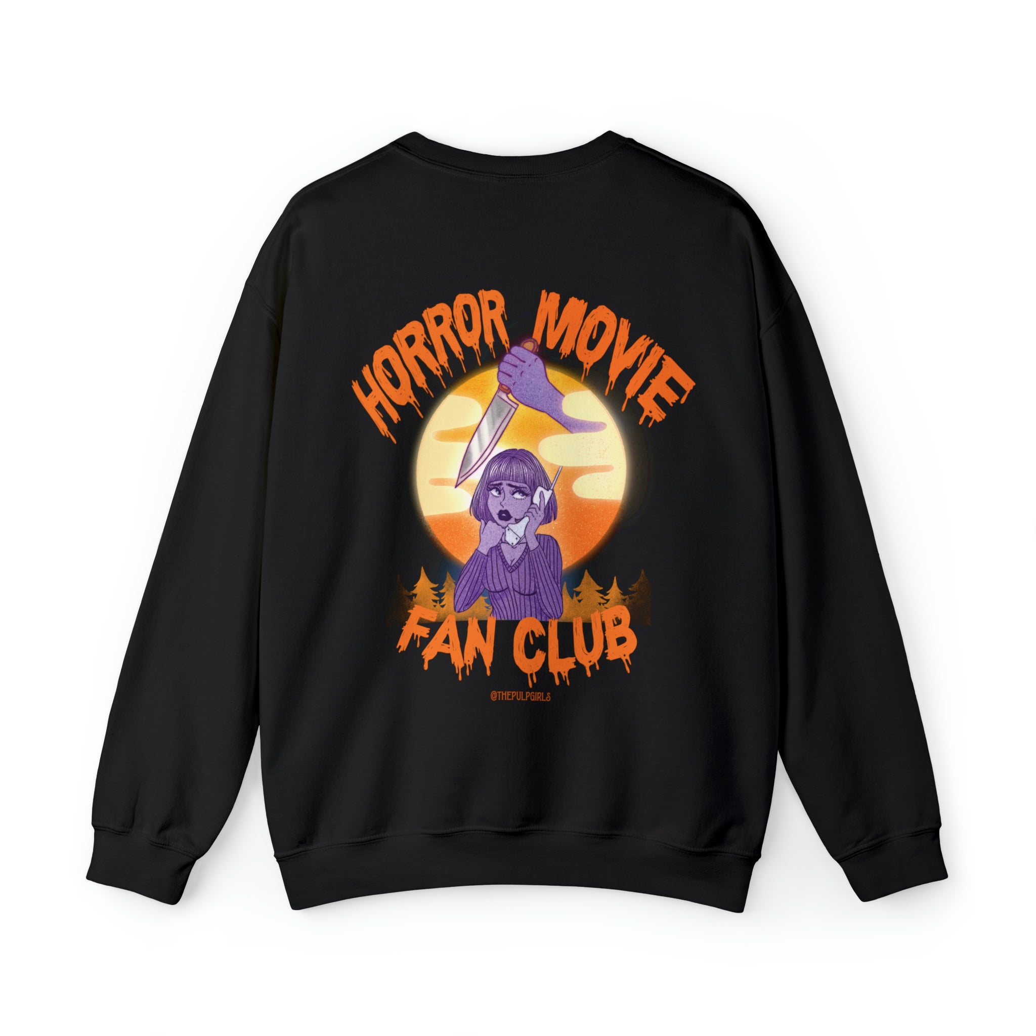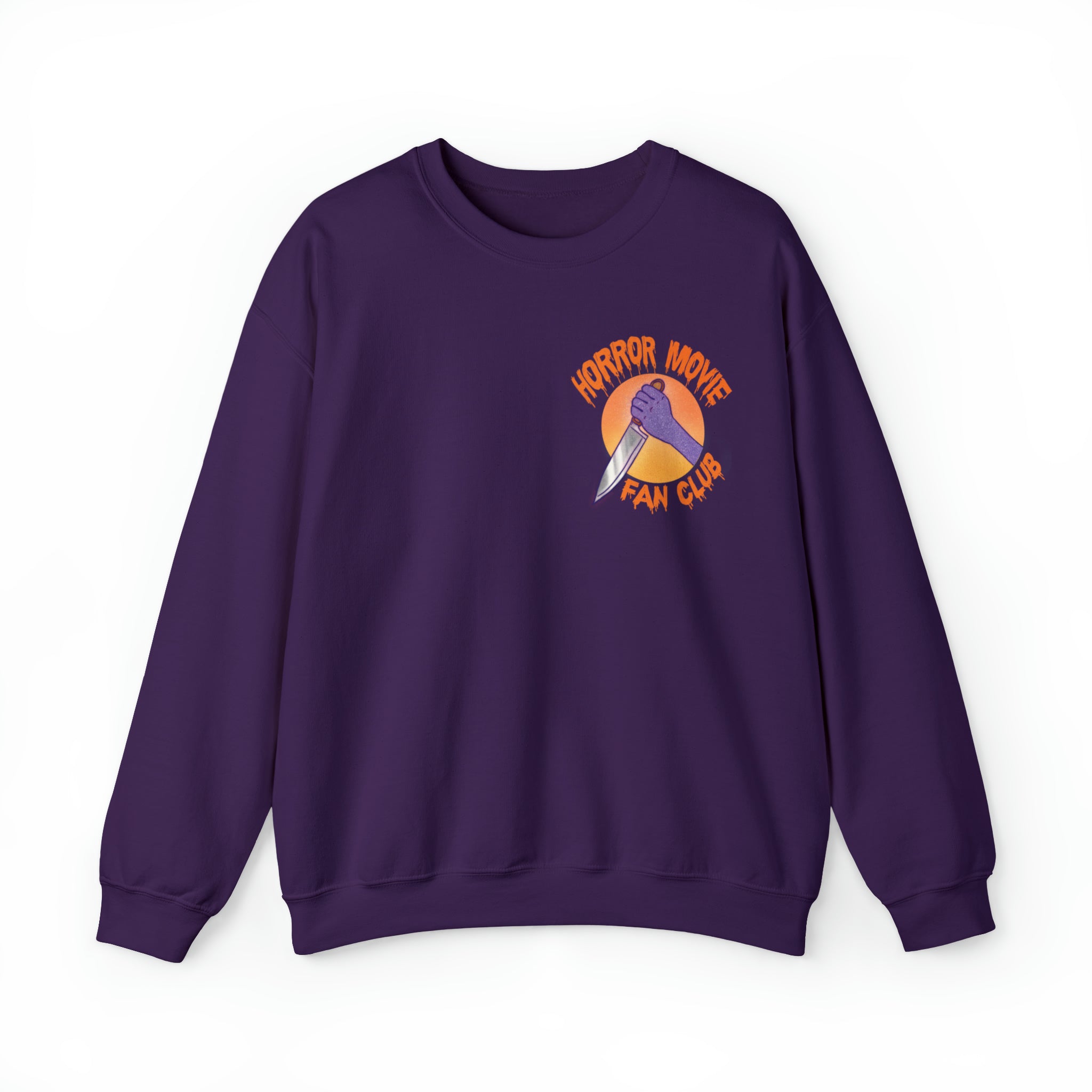 Show off your horror movie lover pride in this sweatshirt! Each sweatshirt features a knife wielding hand against a full moon with text on the front upper chest area, and a full-sized version of a classic horror movie scene along with text on the back!