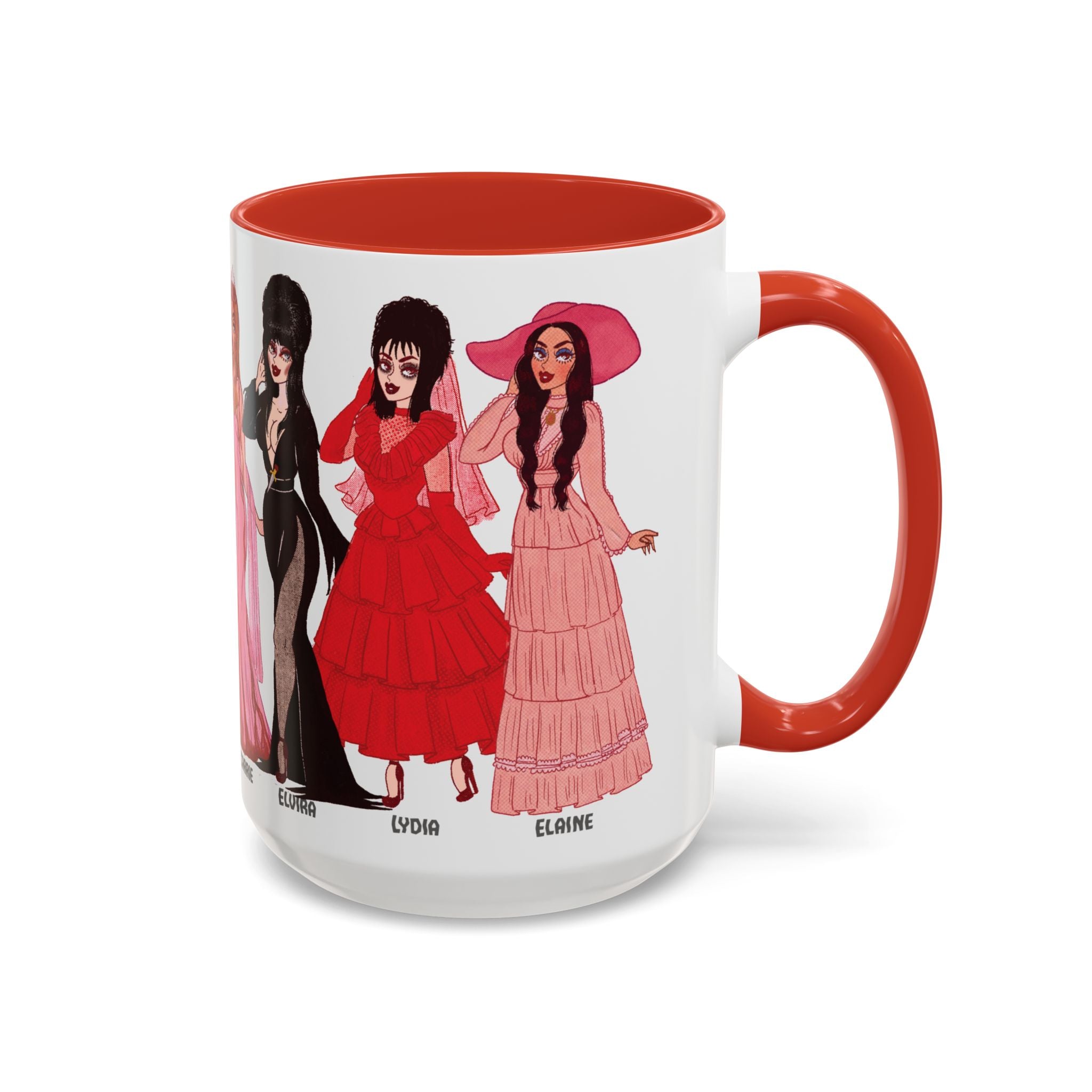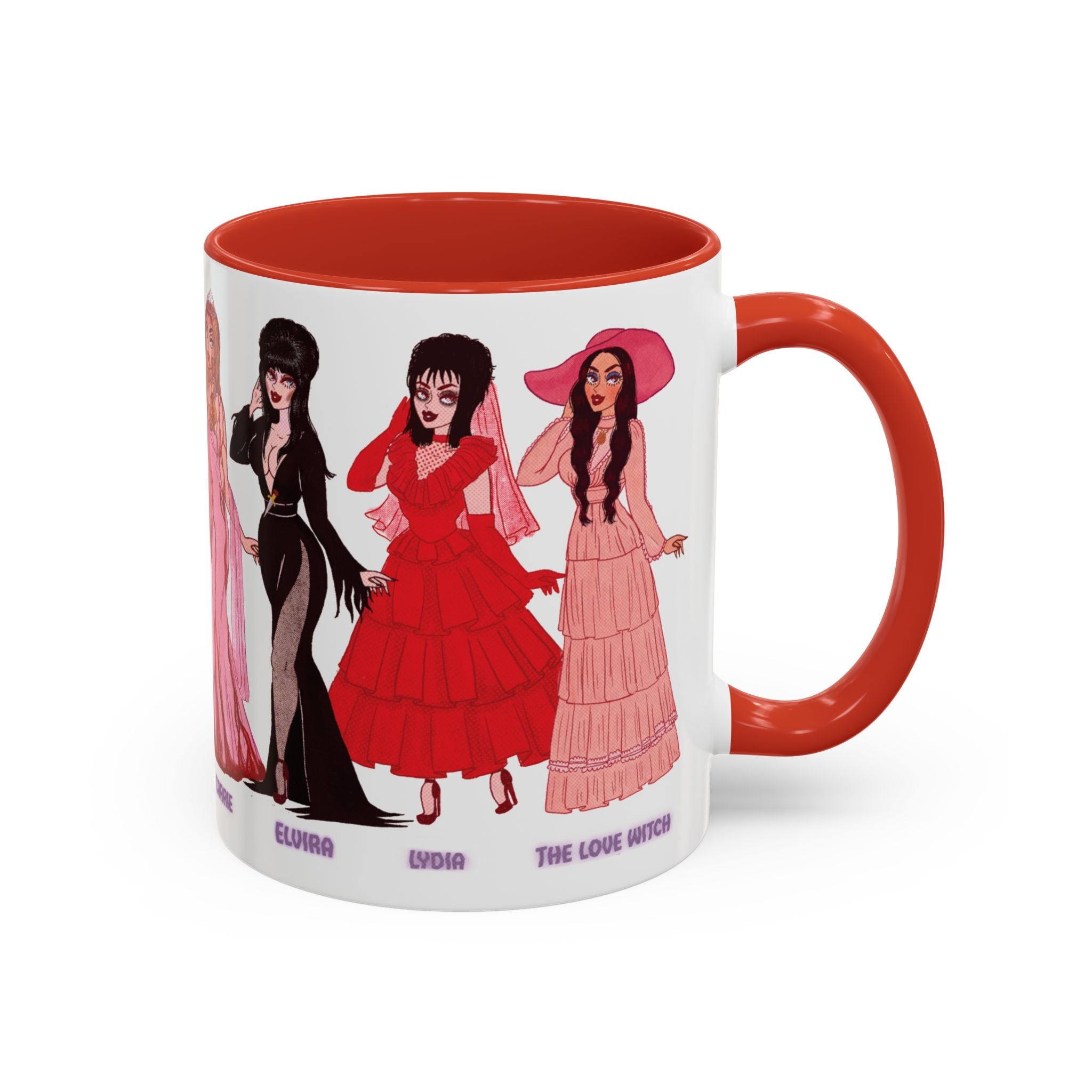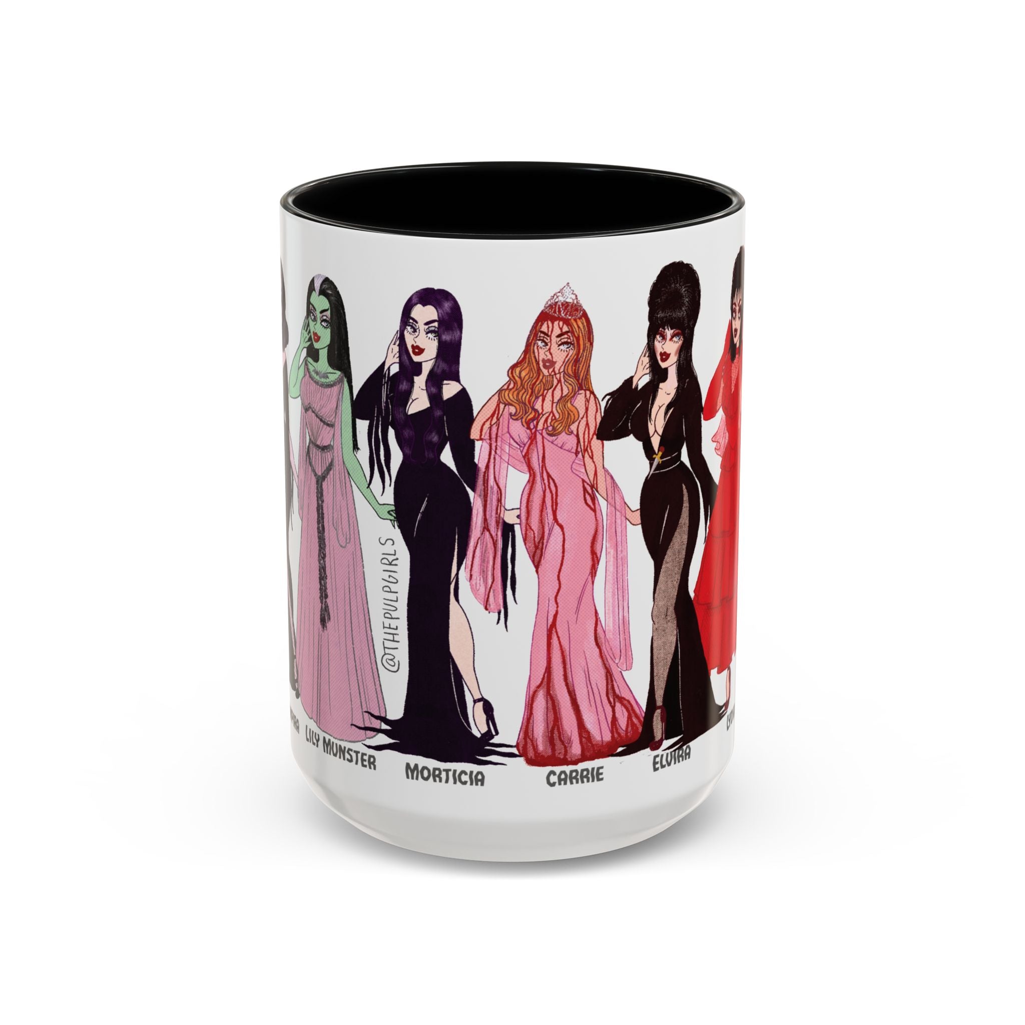 🧡Spooky Queens are forever!🧡 Sip your coffee and show off your love for these horror movie icons on this gorgeous, two-tone mug. Featuring Pulp drawings of your favorite monster babes and witch queens alike, along with a black handle and interior.